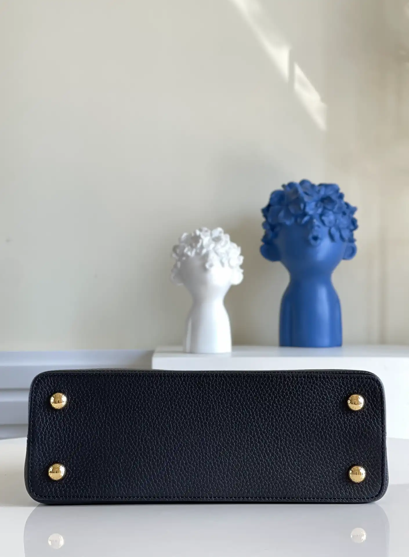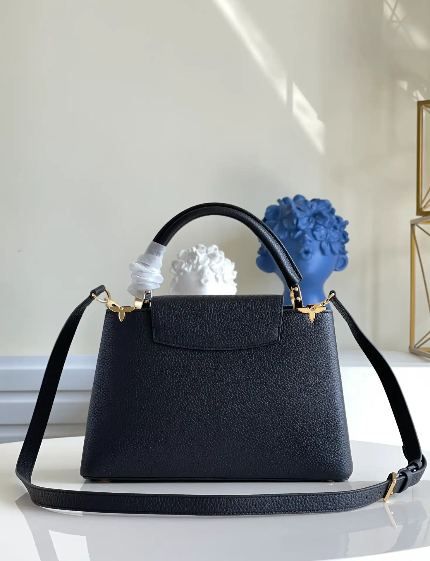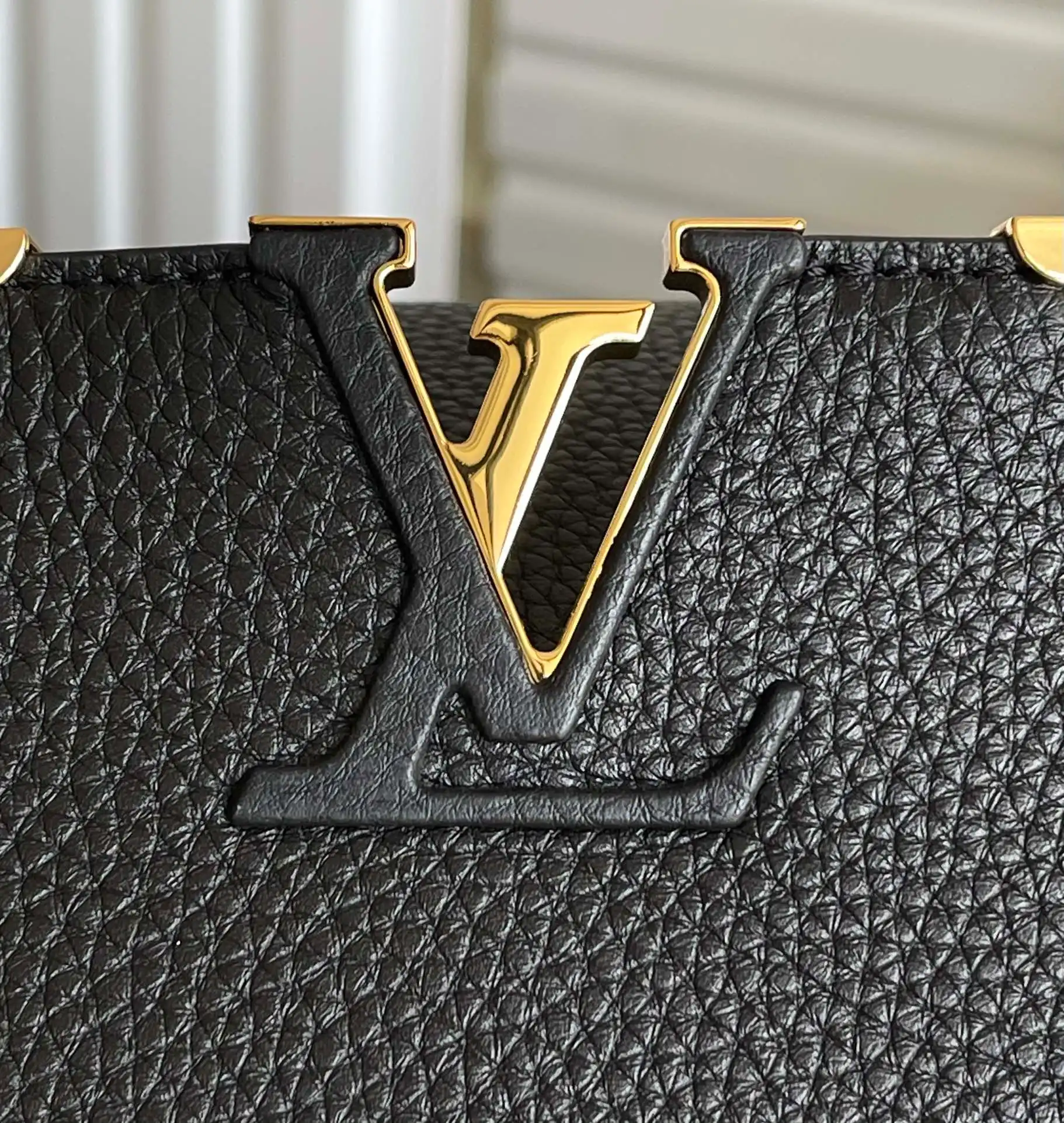 This season the House tells a new Capucines story. Embellished with a delicate frieze of metallic Monogram flowers, the emblematic bag is more feminine than ever. The MM model, in refined Noir with a crown of gold-toned blooms, is both elegant and practical.