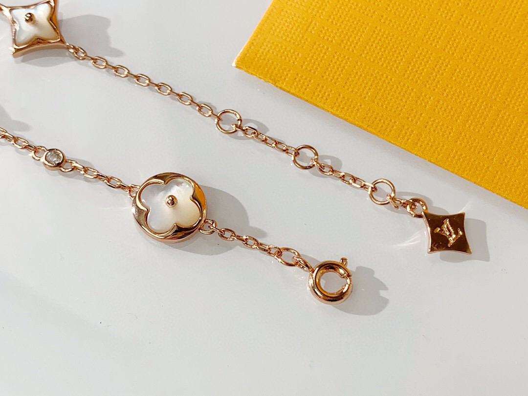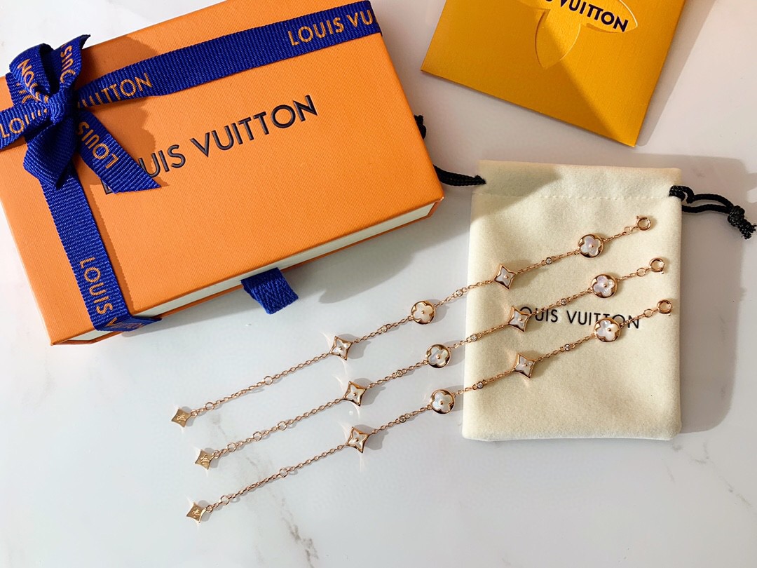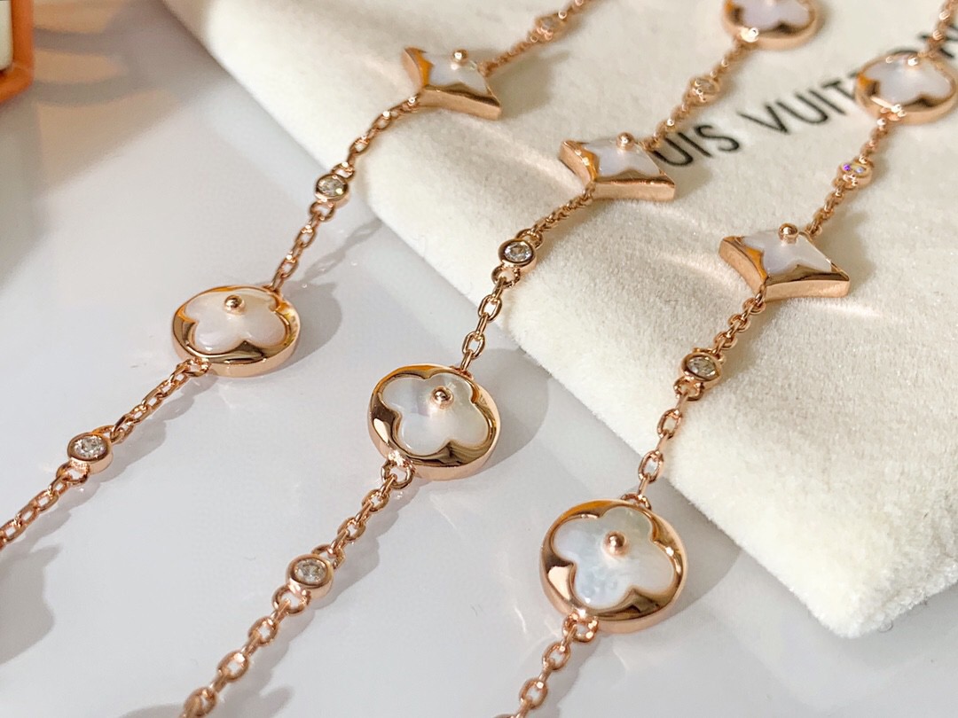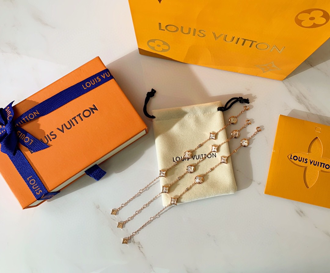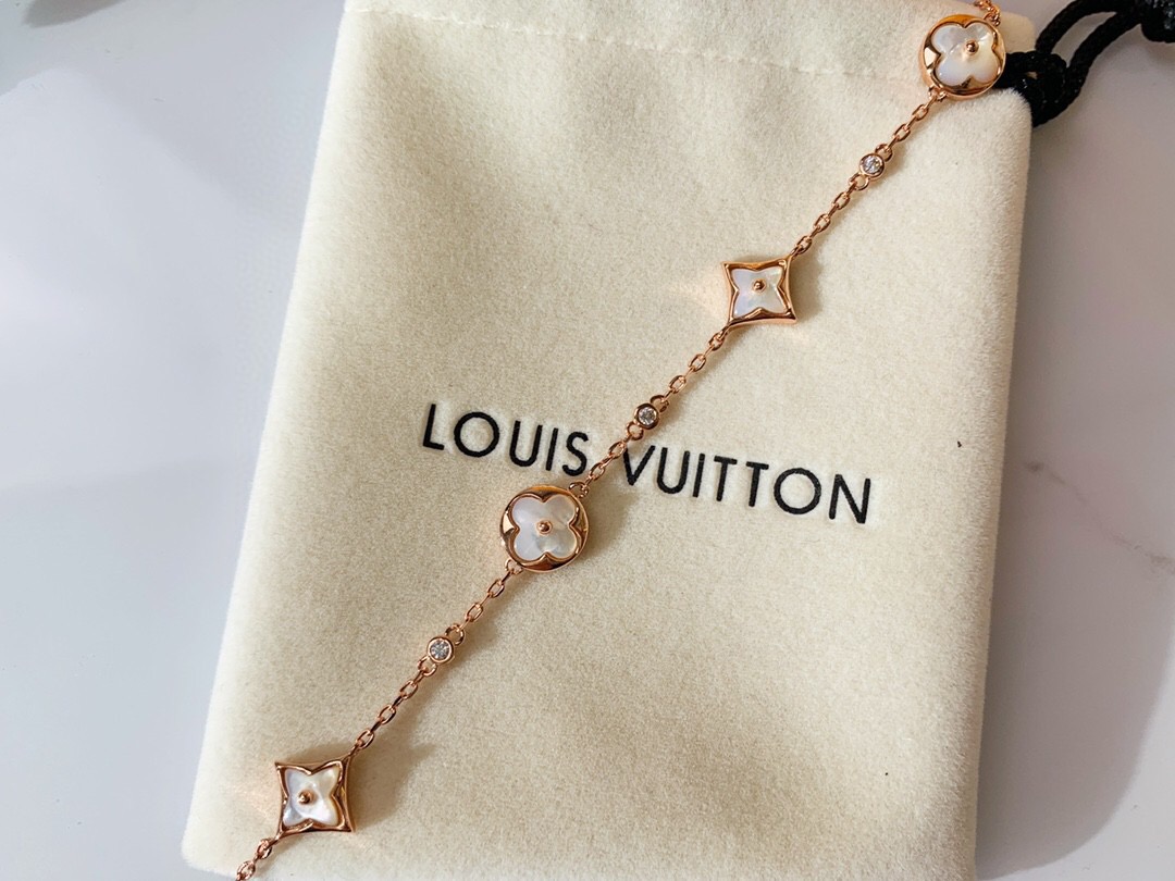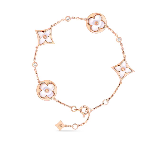 Monogram Flowers are glorified in the Colour Blossom BB Multi-Motif Bracelet with Pink Gold, White Mother-Of-Pearl and Diamonds. This classic house motif was created in 1896 by Georges-Louis Vuitton and is reimagined in carved white mother-of-pearl set into pink gold and highlighted by diamonds. Months of craftsmanship are required to perfect the gems’ glitter and form.