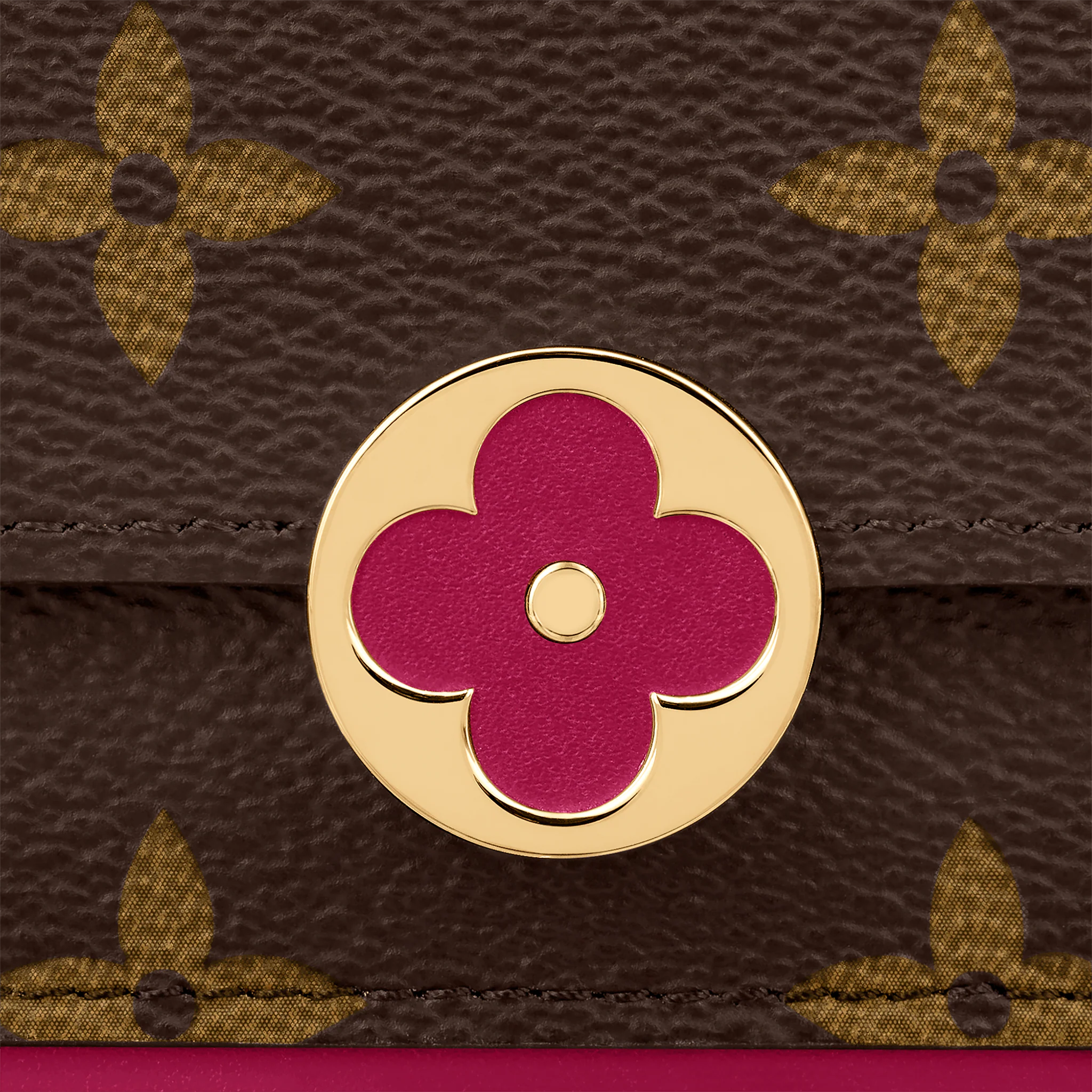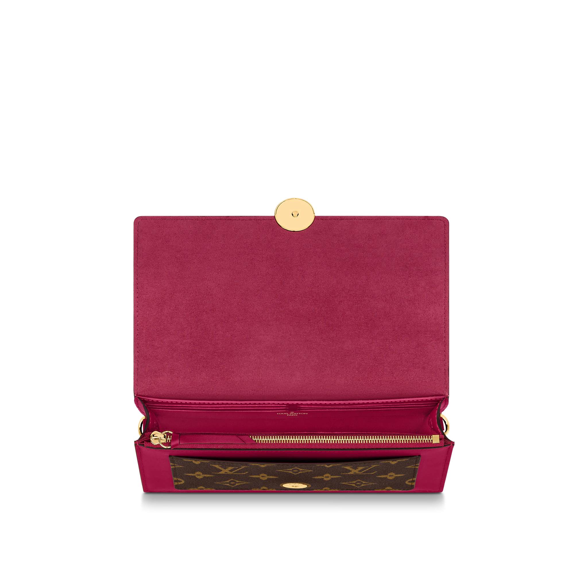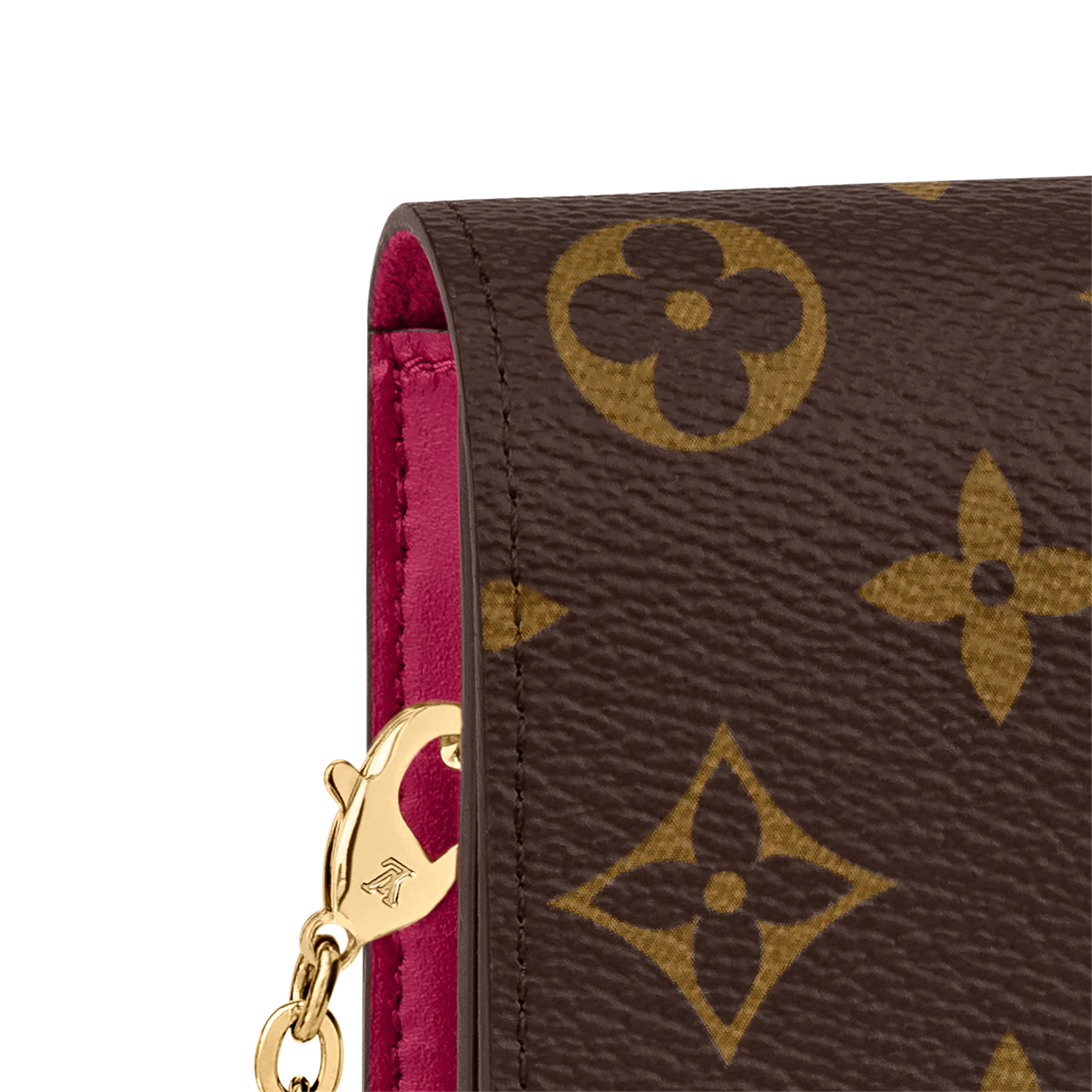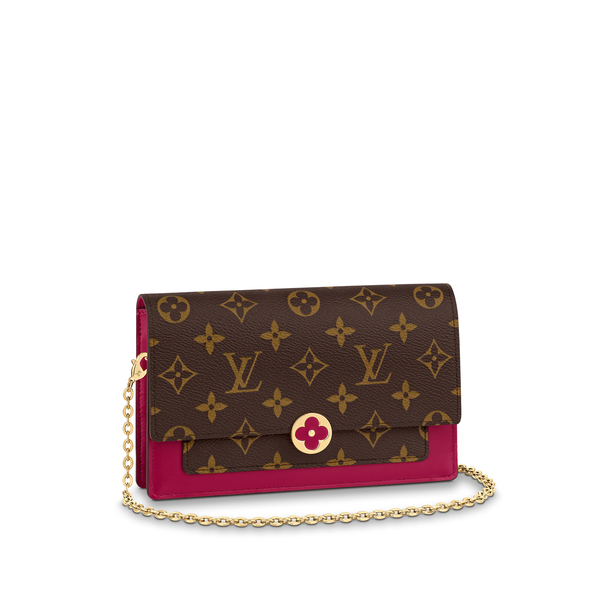 Combining Monogram canvas and calf leather, the Flore chain wallet features a distinctive clasp in the shape of a Monogram Flower. This feminine design is large enough to hold a smartphone as well as other everyday essentials, and can be carried as a clutch, on the shoulder or across the body.