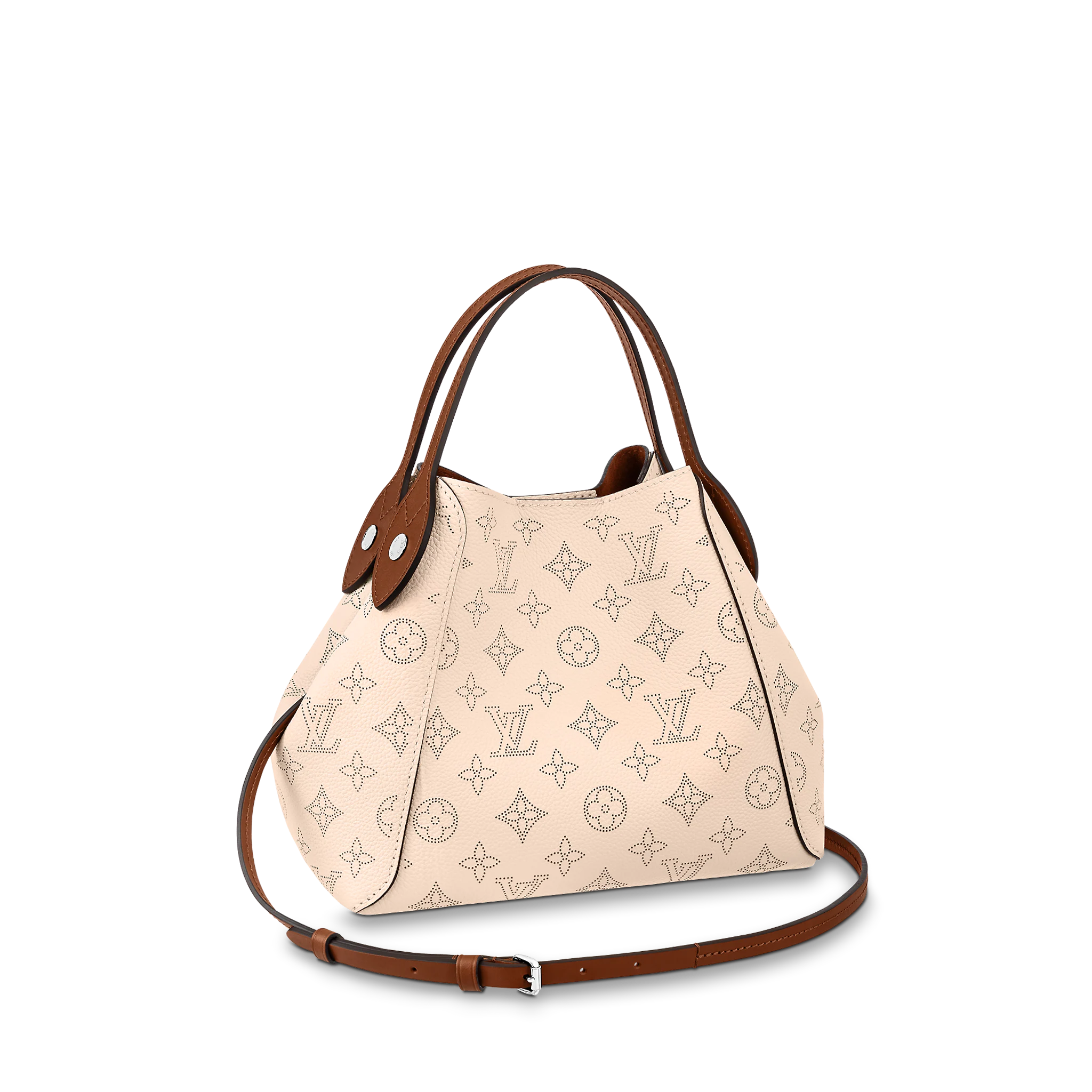 Two bags in one: with its sides gathered in and fastened, the Hina PM is an on-point bucket model; opened wide, it becomes a small casual tote. Made from perforated Mahina calf with calf-leather trim, this model is light and comfortable to carry, either by the two top handles or cross-body on the detachable strap.