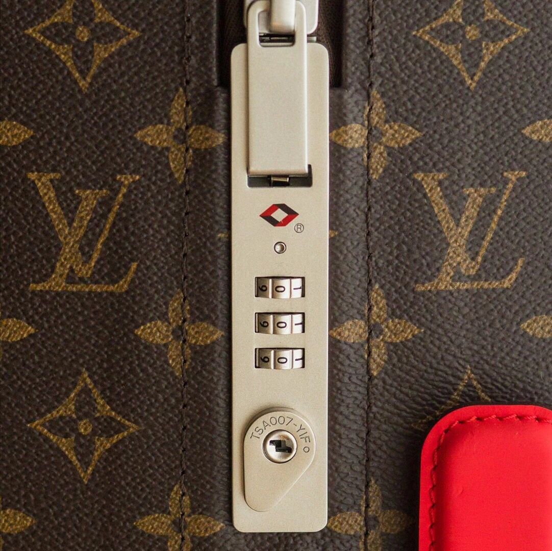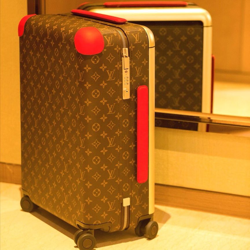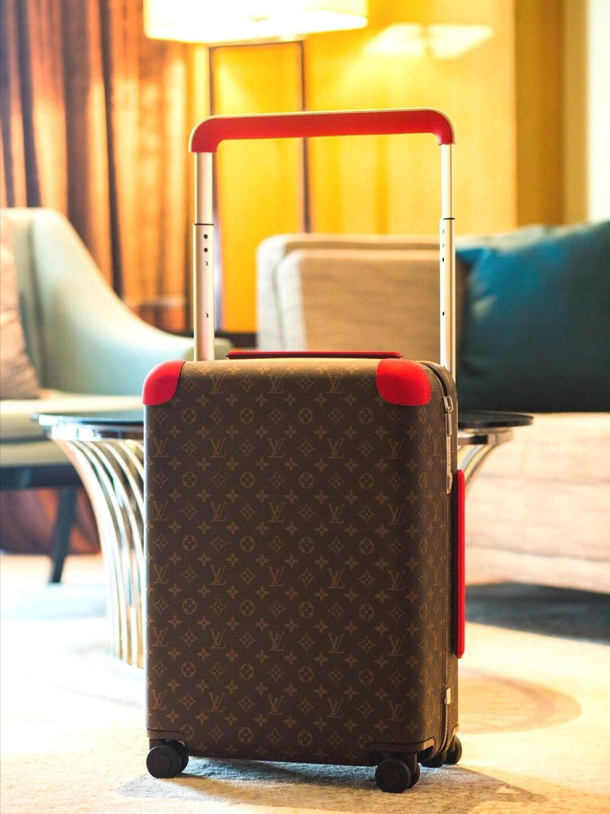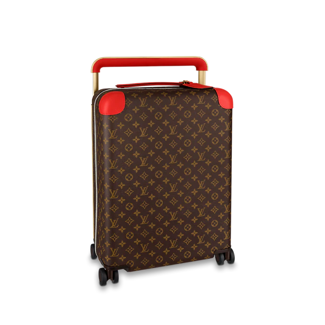The cabin-sized proportions of the Horizon 55 suitcase are balanced with a generous internal capacity. This lightweight bag has four wheels and a flat interior, which is supported by an external cane. Monogram canvas adorns the exterior, while the corners and top handle bear Coquelicot Red leather. This innovative item was created by industrial designer Marc Newson for Fall 2019.