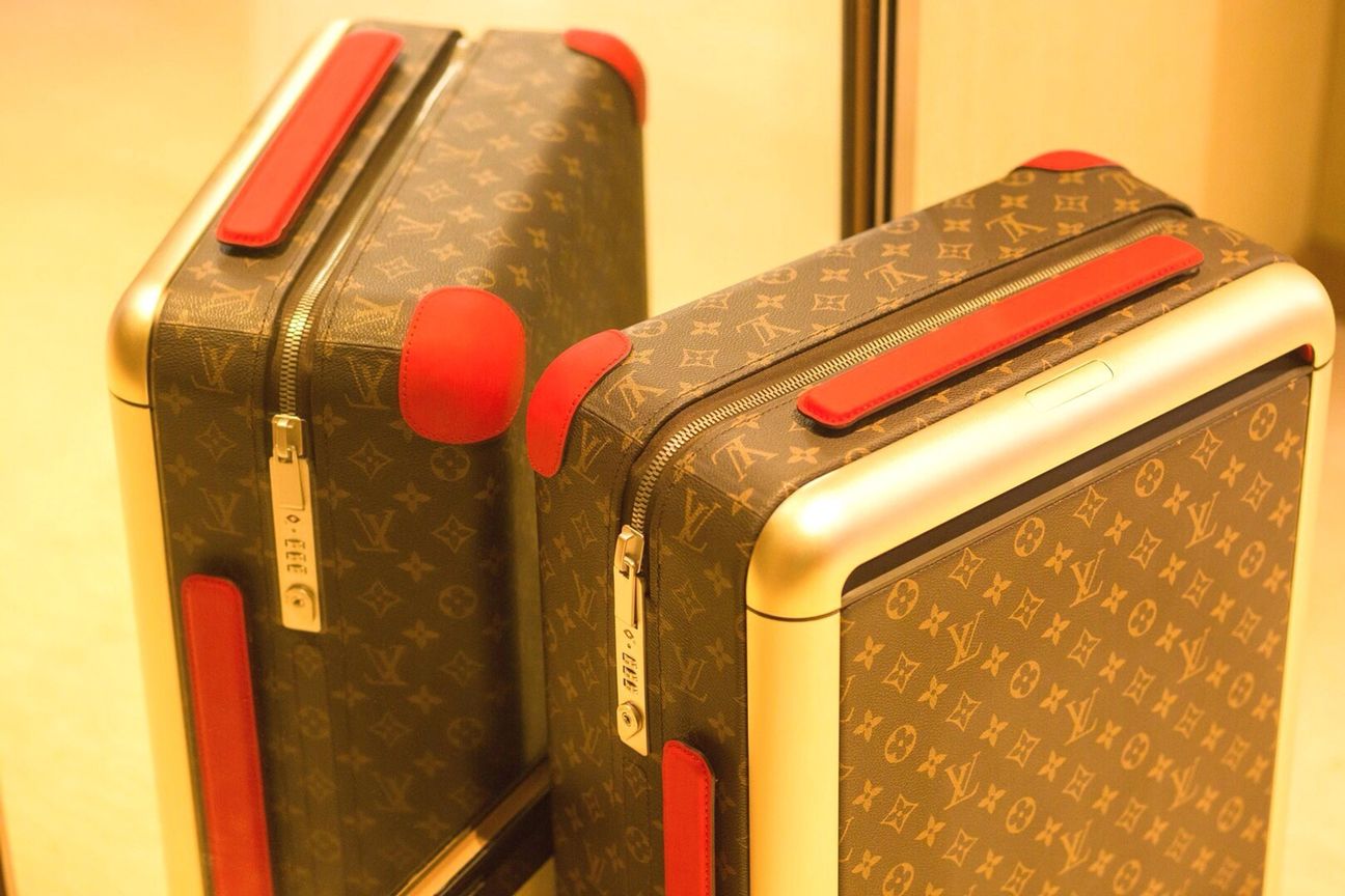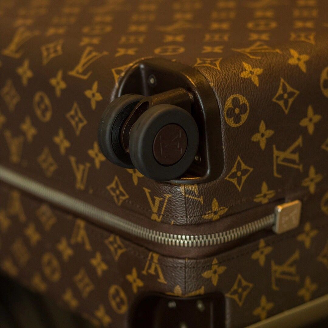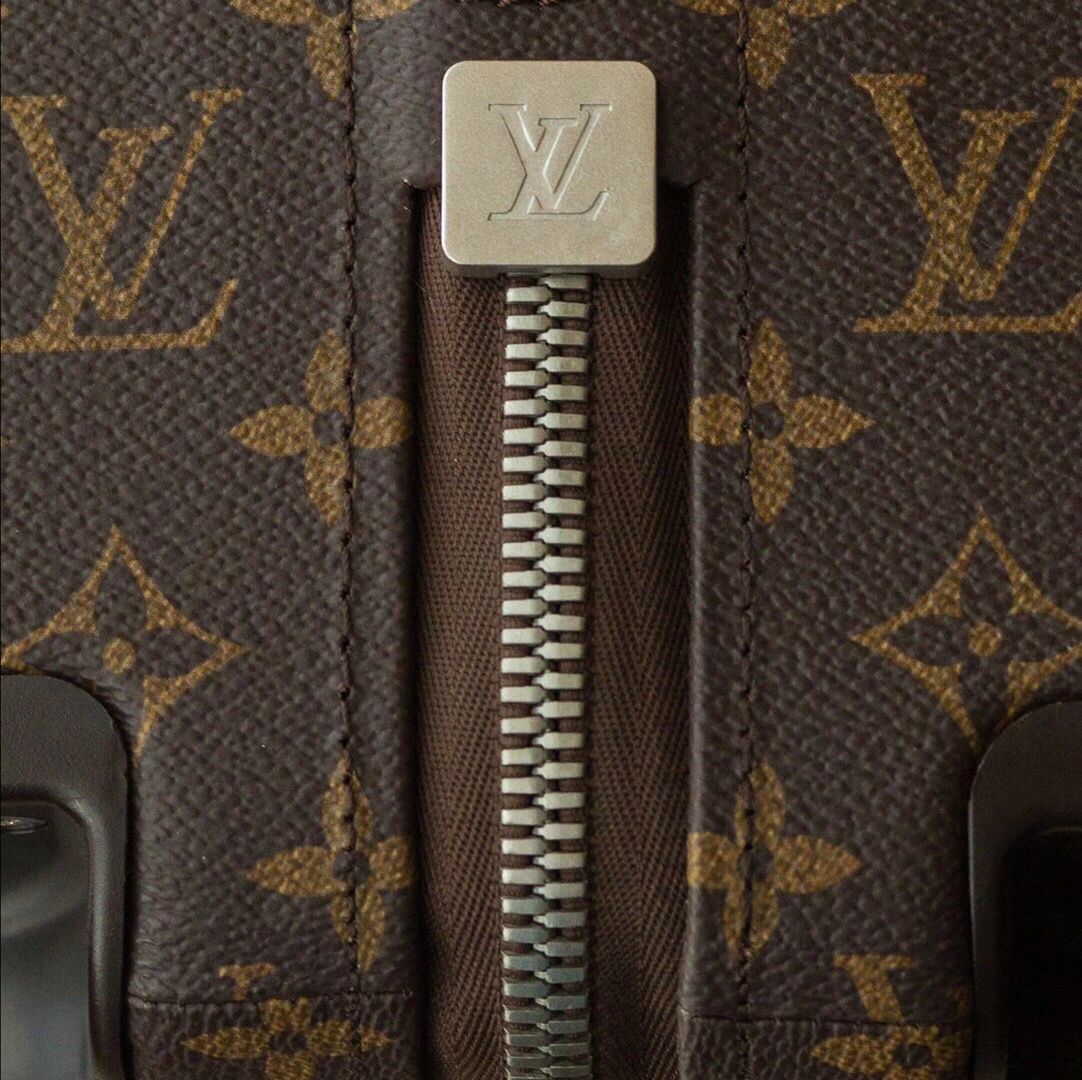 The cabin-sized proportions of the Horizon 55 suitcase are balanced with a generous internal capacity. This lightweight bag has four wheels and a flat interior, which is supported by an external cane. Monogram canvas adorns the exterior, while the corners and top handle bear Coquelicot Red leather. This innovative item was created by industrial designer Marc Newson for Fall 2019.