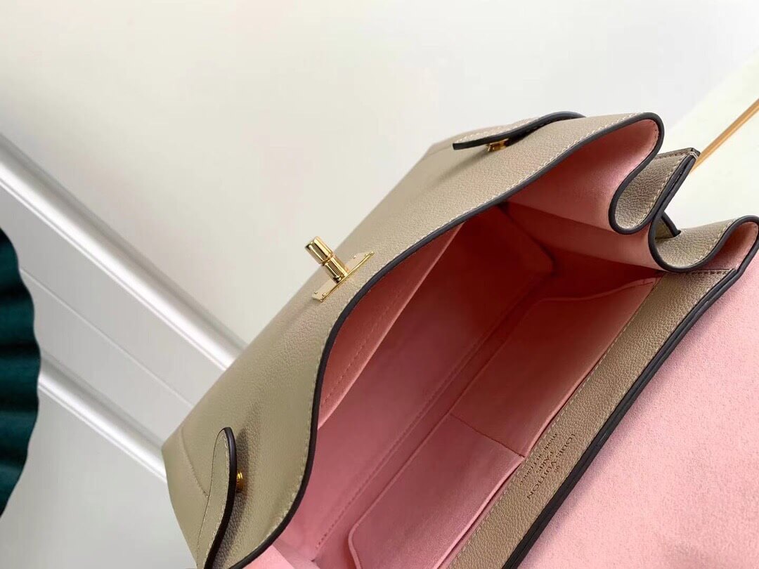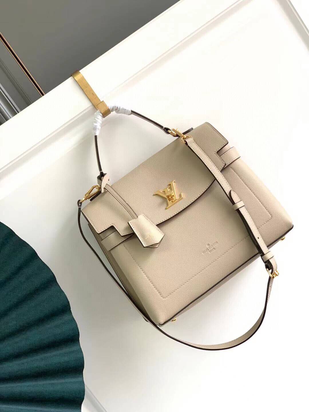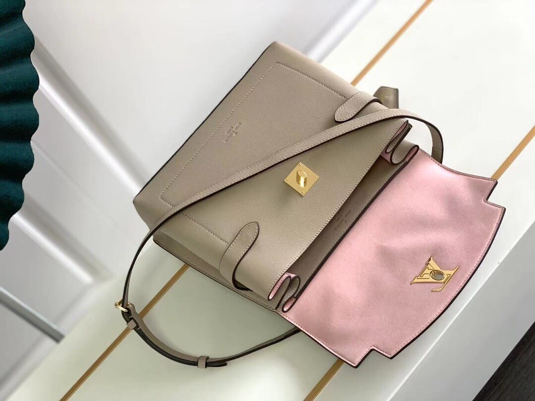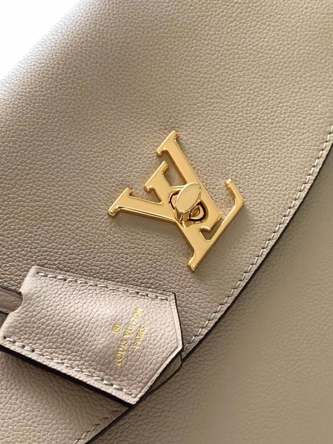 The one-handle Lockme Ever bag in soft calfskin sports a sleek, structured shape. The graphic lines of the top flap give this supple, roomy bag a modern attitude. Accented with a silver-finish LV turn lock and furnished with a leather strap for hands-free ease, it is an elegant choice for daily wear.