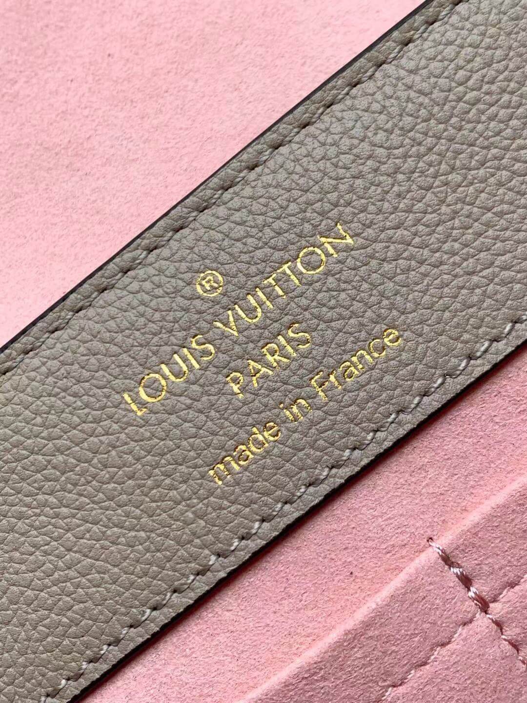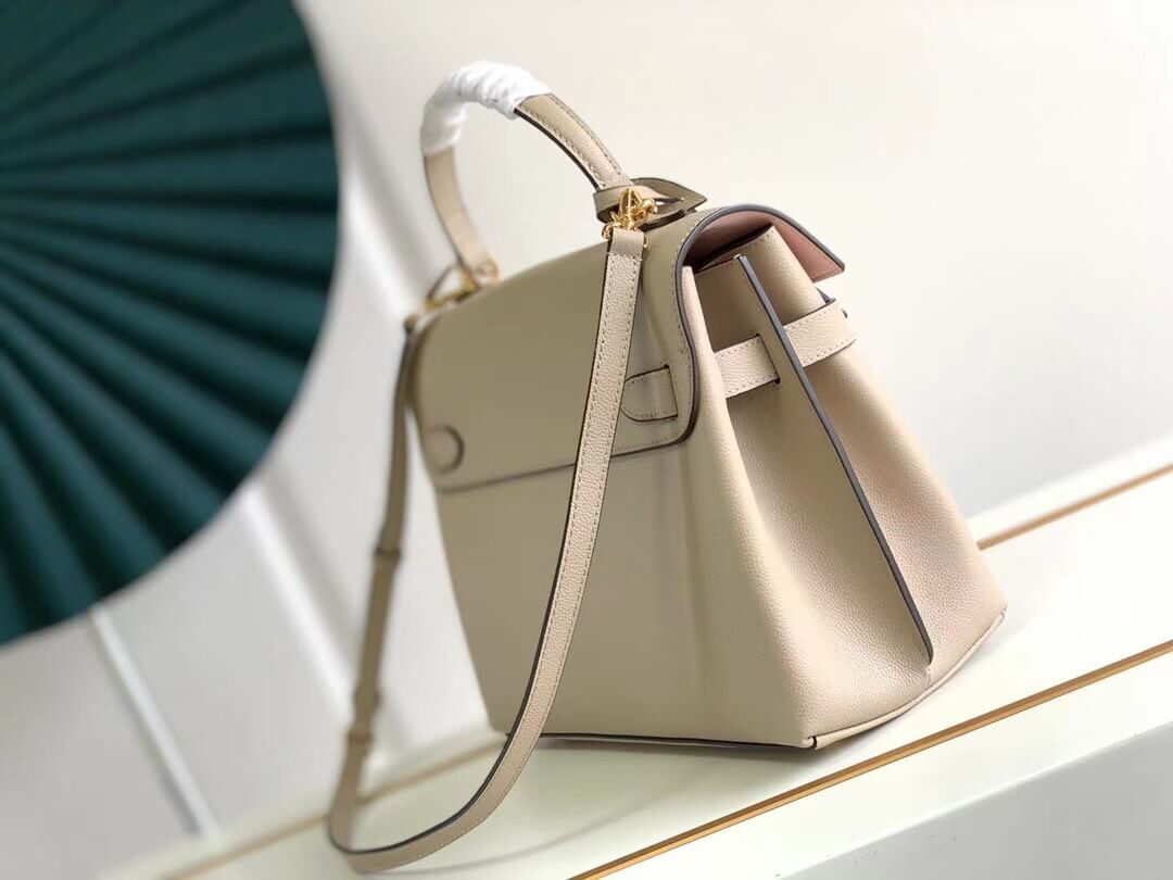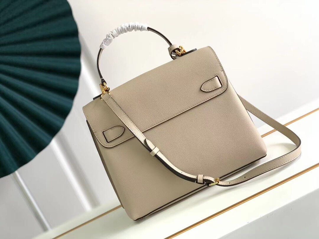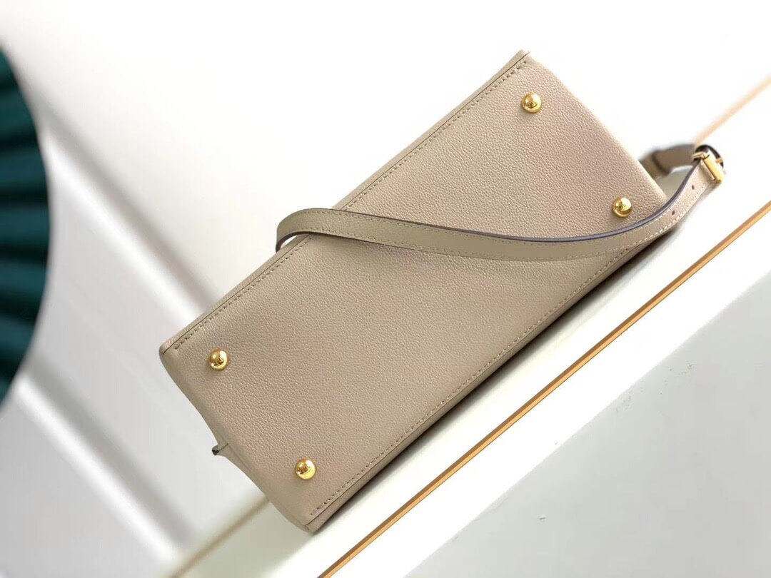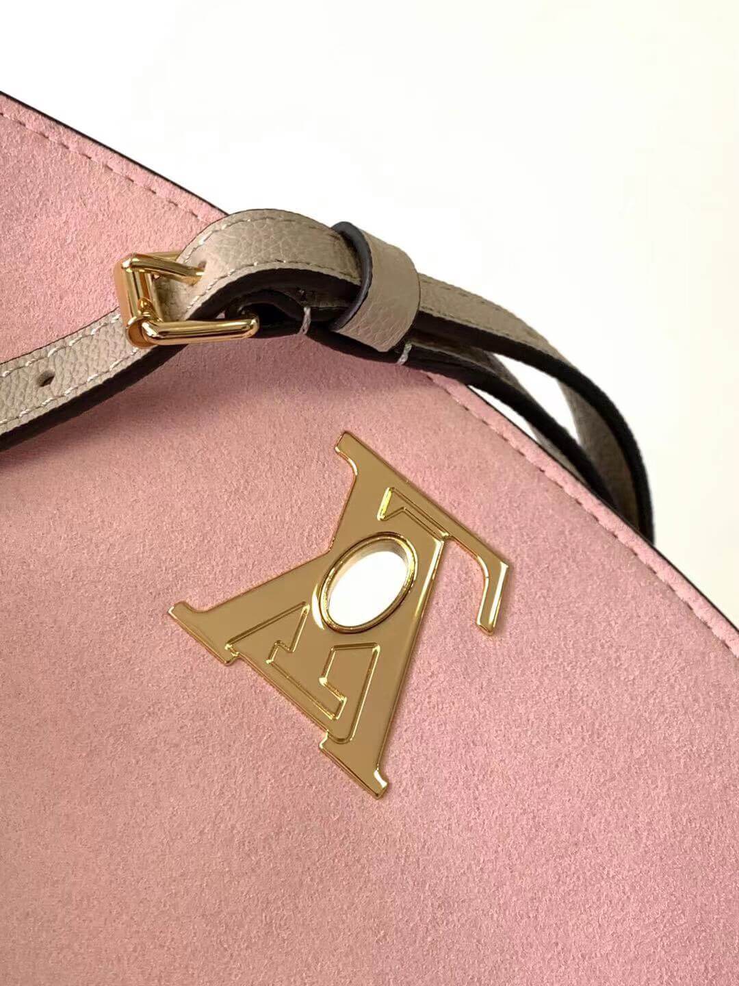 The one-handle Lockme Ever bag in soft calfskin sports a sleek, structured shape. The graphic lines of the top flap give this supple, roomy bag a modern attitude. Accented with a silver-finish LV turn lock and furnished with a leather strap for hands-free ease, it is an elegant choice for daily wear.