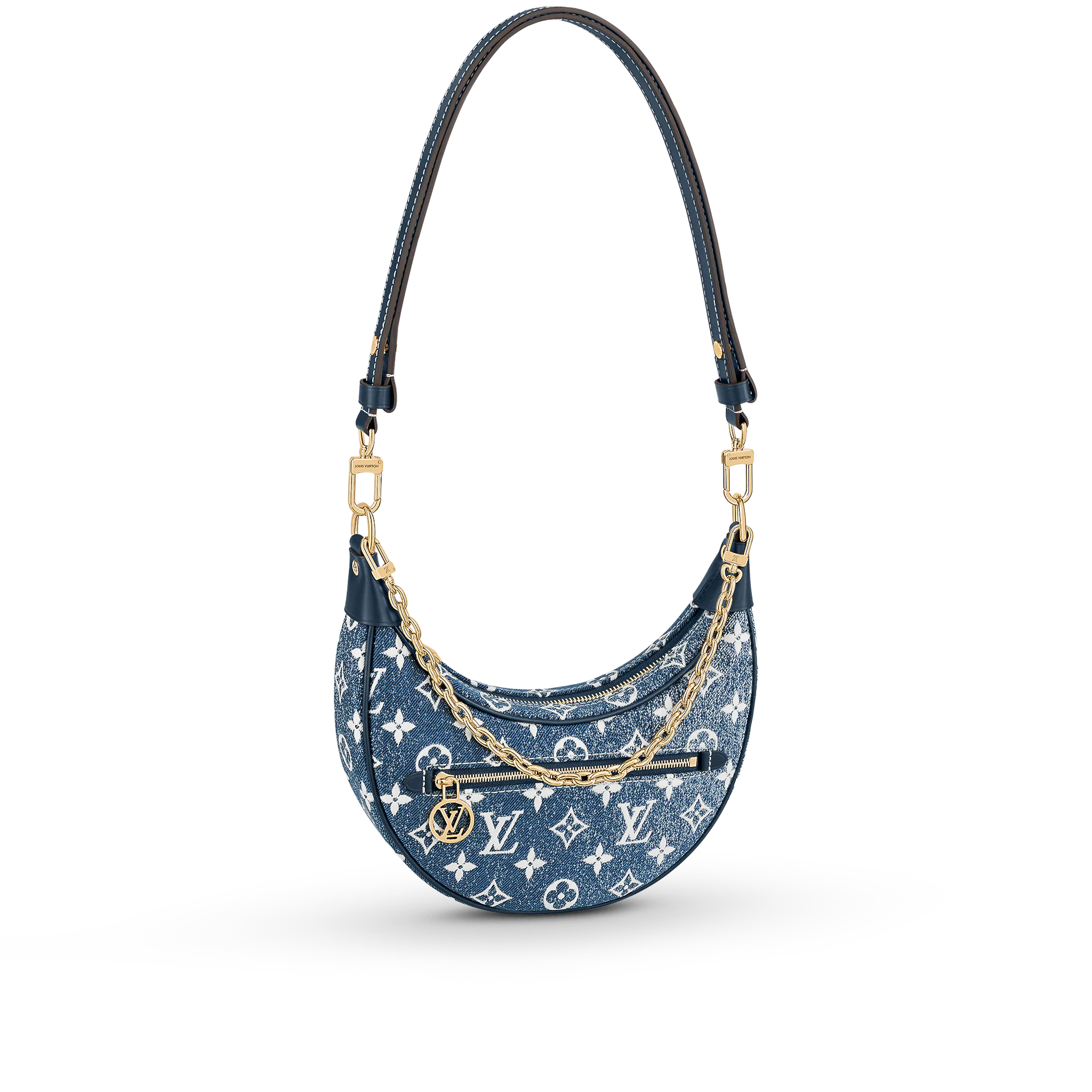 Buy it nowIntroduced at the Cruise 2022 show, the half-moon Loop baguette handbag is made from a jacquard weave of the Monogram pattern on what looks to be faded denim. The navy-blue leather trim and strap, together with the gold-color LV Circle zip pull and removable chain, bring sophistication to the casual colorway.