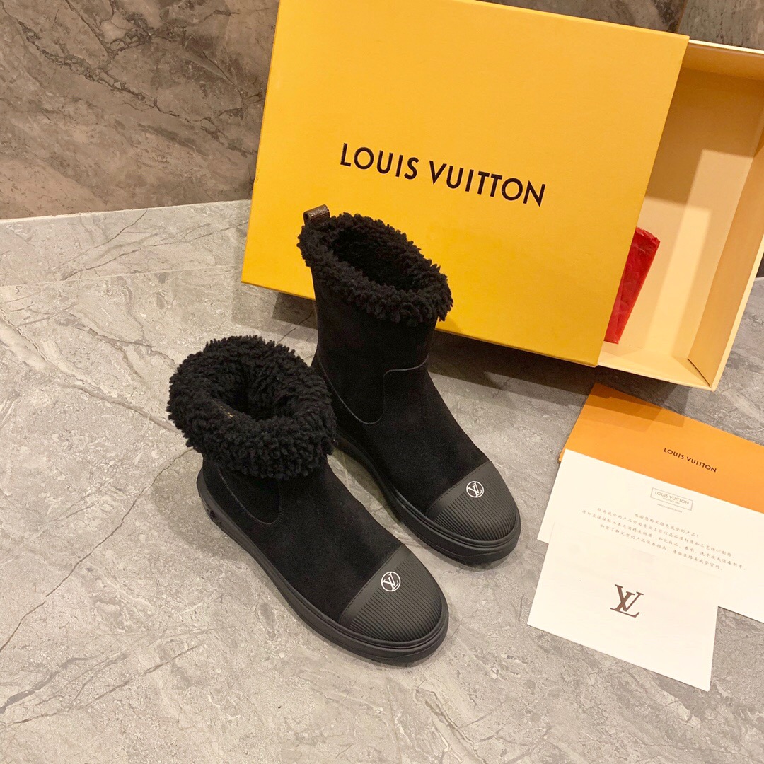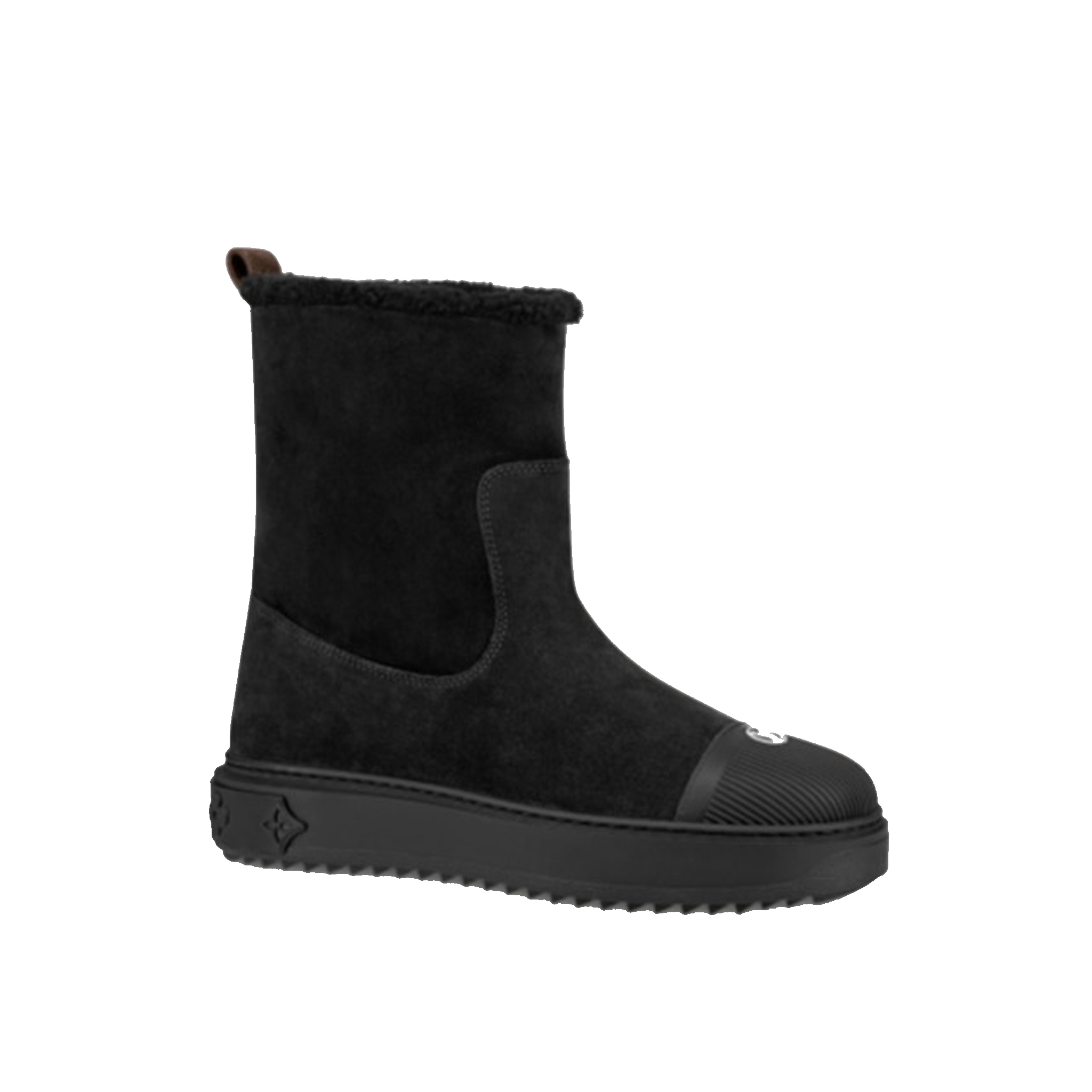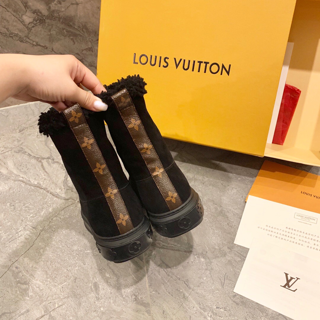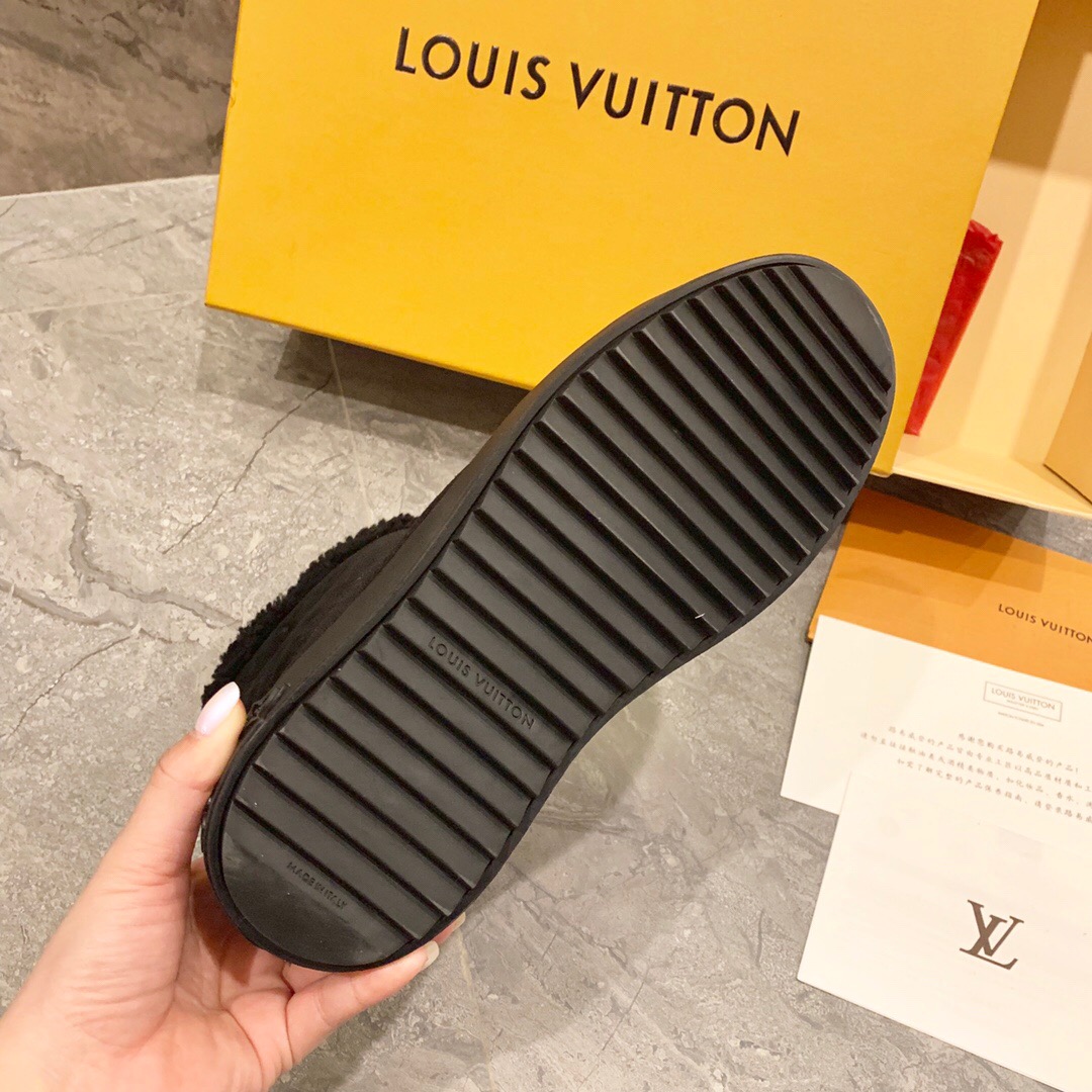 Ideal for cold weather, the Breezy flat ankle boot comes in black suede calf leather with snug shearling trim. It has a thick, treaded rubber outsole decorated with a motif of Monogram Flowers and a rubber toe cap with the LV Circle signature. It is finished with a back loop in Monogram canvas.