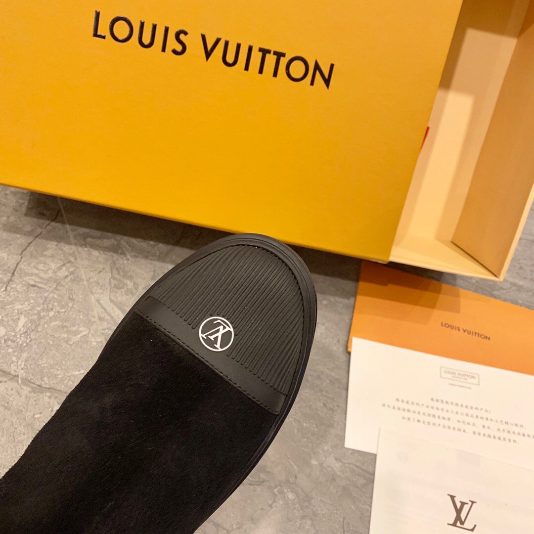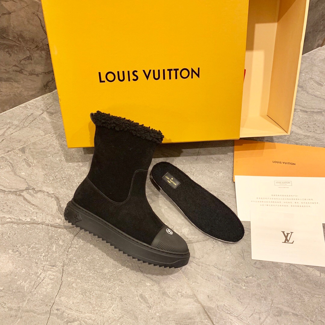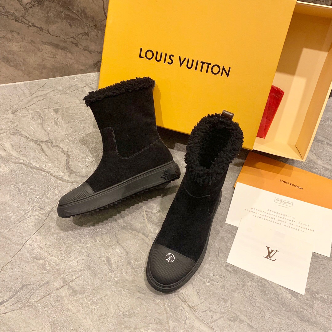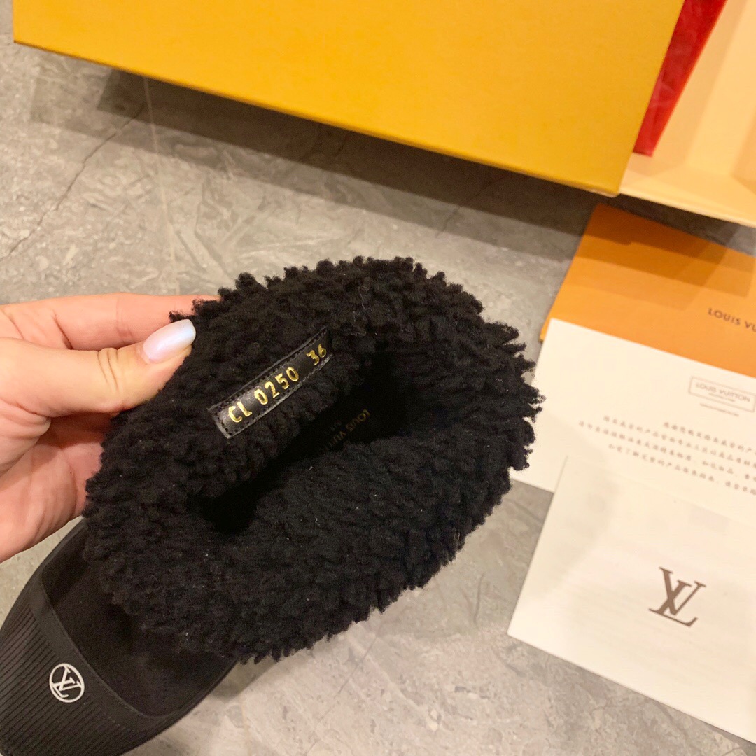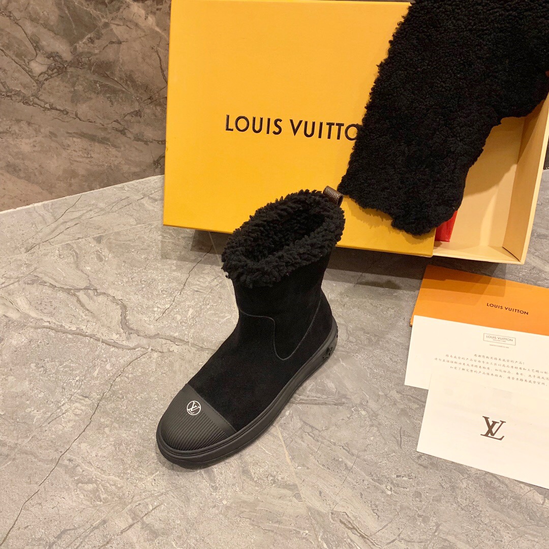 Ideal for cold weather, the Breezy flat ankle boot comes in black suede calf leather with snug shearling trim. It has a thick, treaded rubber outsole decorated with a motif of Monogram Flowers and a rubber toe cap with the LV Circle signature. It is finished with a back loop in Monogram canvas.