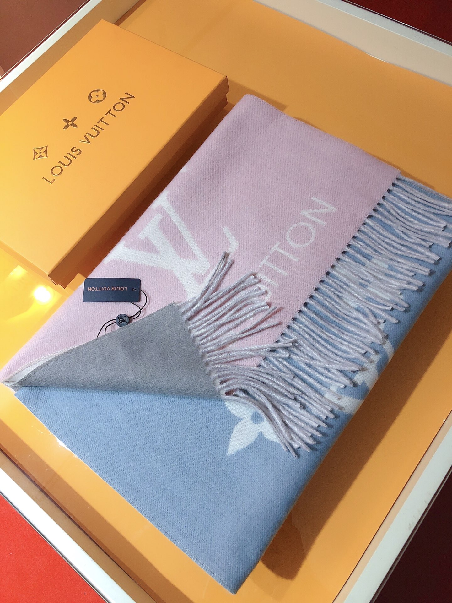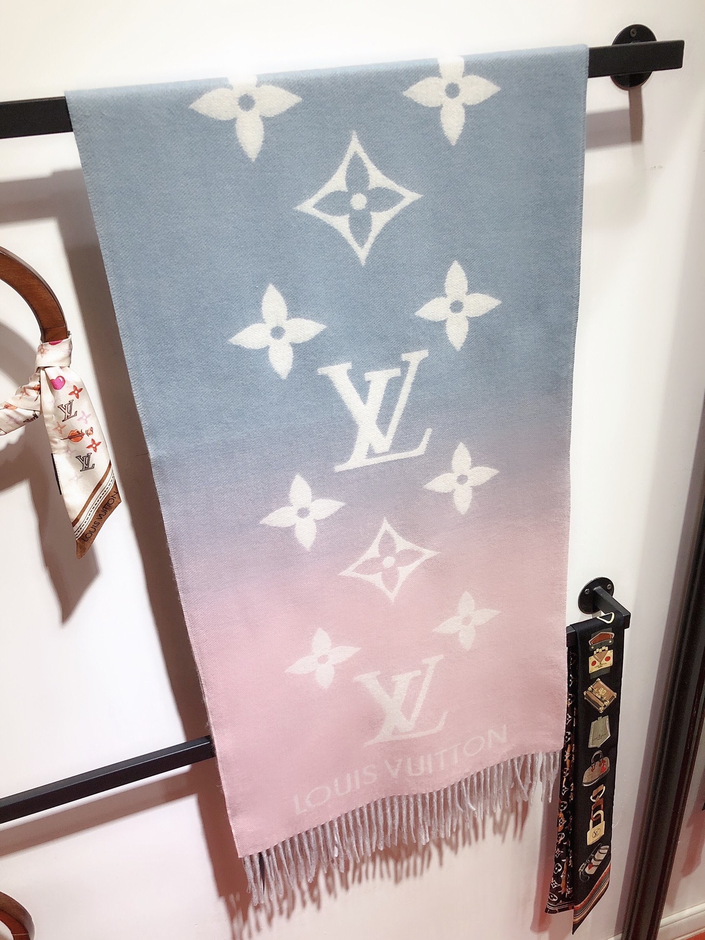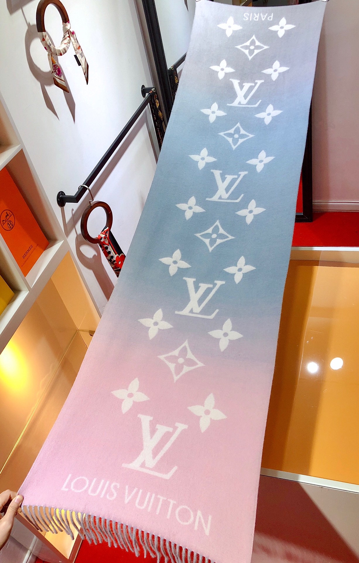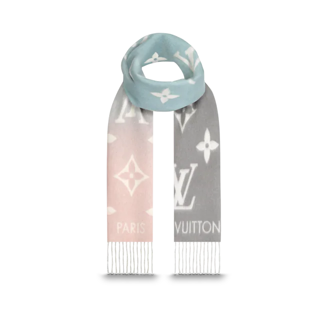 This striking scarf gives the renowned Louis Vuitton Monogram pattern an oversized makeover. Soft and luxurious, the pure cashmere is woven with a jacquard method to create the larger-than-life emblem. A contemporary twist on a classic design, it features a chic gradation effect in two colourways: soft pink with blue and versatile grey with black.