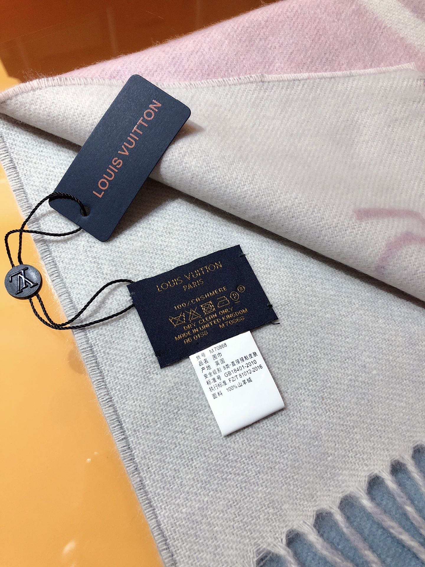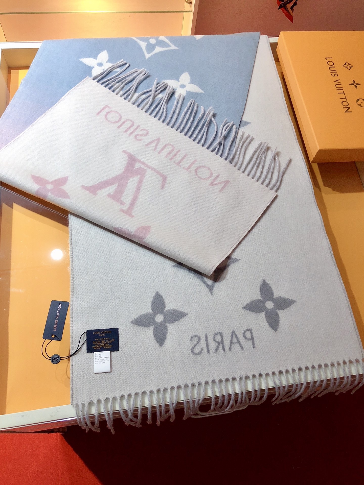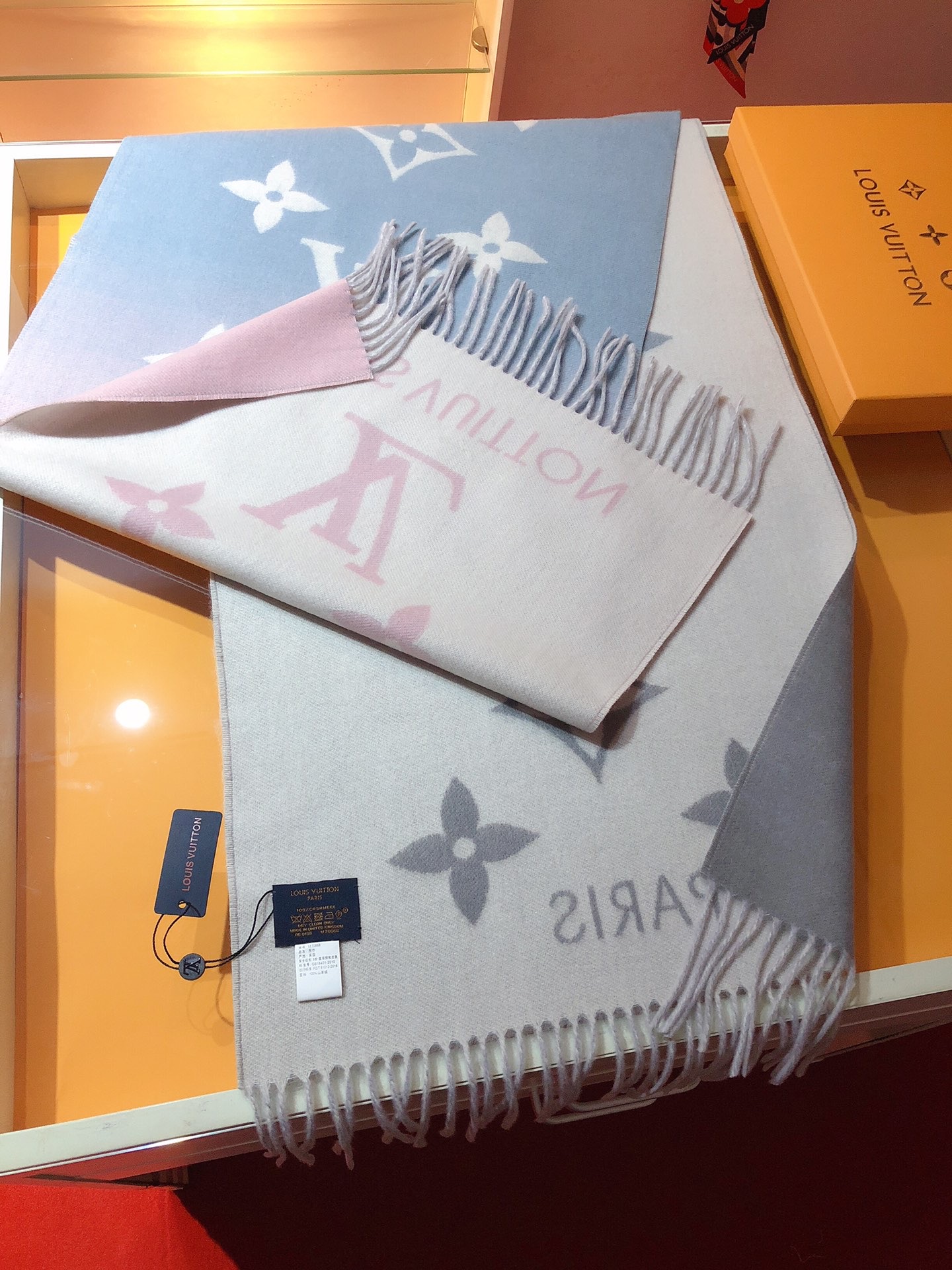 This striking scarf gives the renowned Louis Vuitton Monogram pattern an oversized makeover. Soft and luxurious, the pure cashmere is woven with a jacquard method to create the larger-than-life emblem. A contemporary twist on a classic design, it features a chic gradation effect in two colourways: soft pink with blue and versatile grey with black.