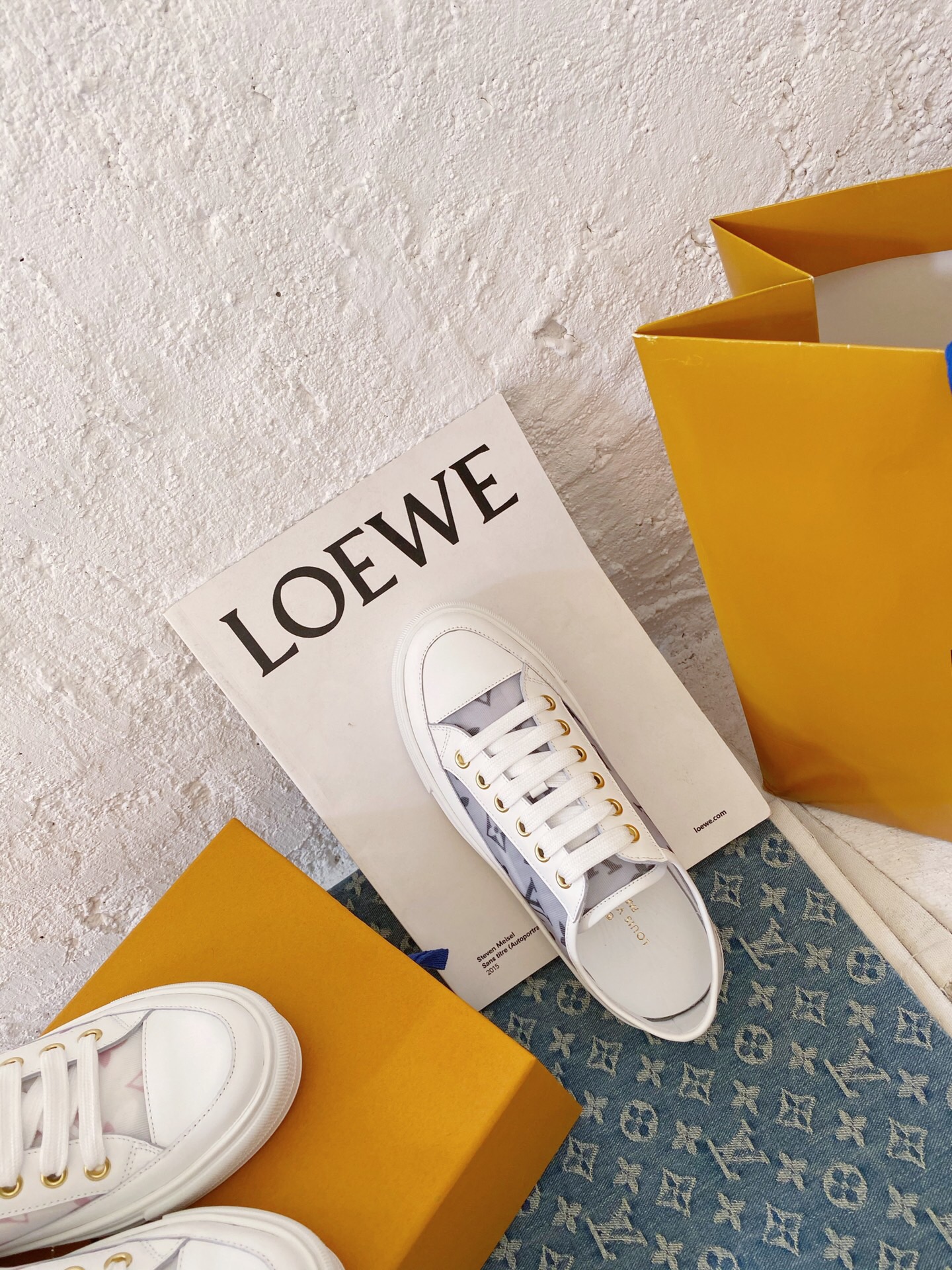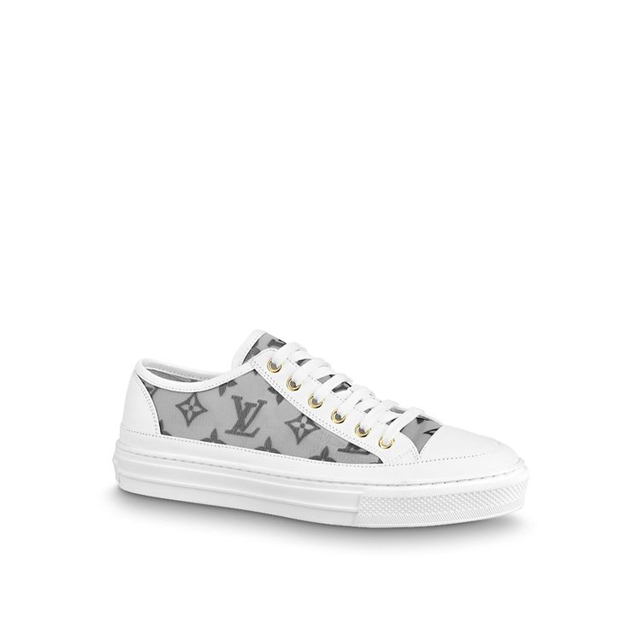 One of Louis Vuitton’s most emblematic styles, the Stellar sneaker is given a new twist this season in calf leather and transparent technical fabric printed with the iconic Monogram pattern. Refined gold-tone eyelets complement this design, whose white rubber outsole is engraved at the back with the House signature.
