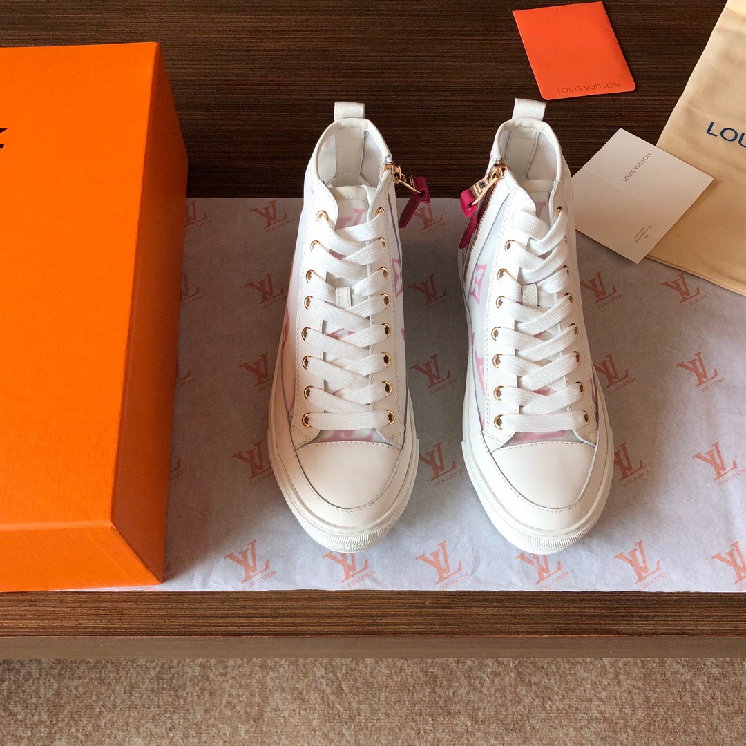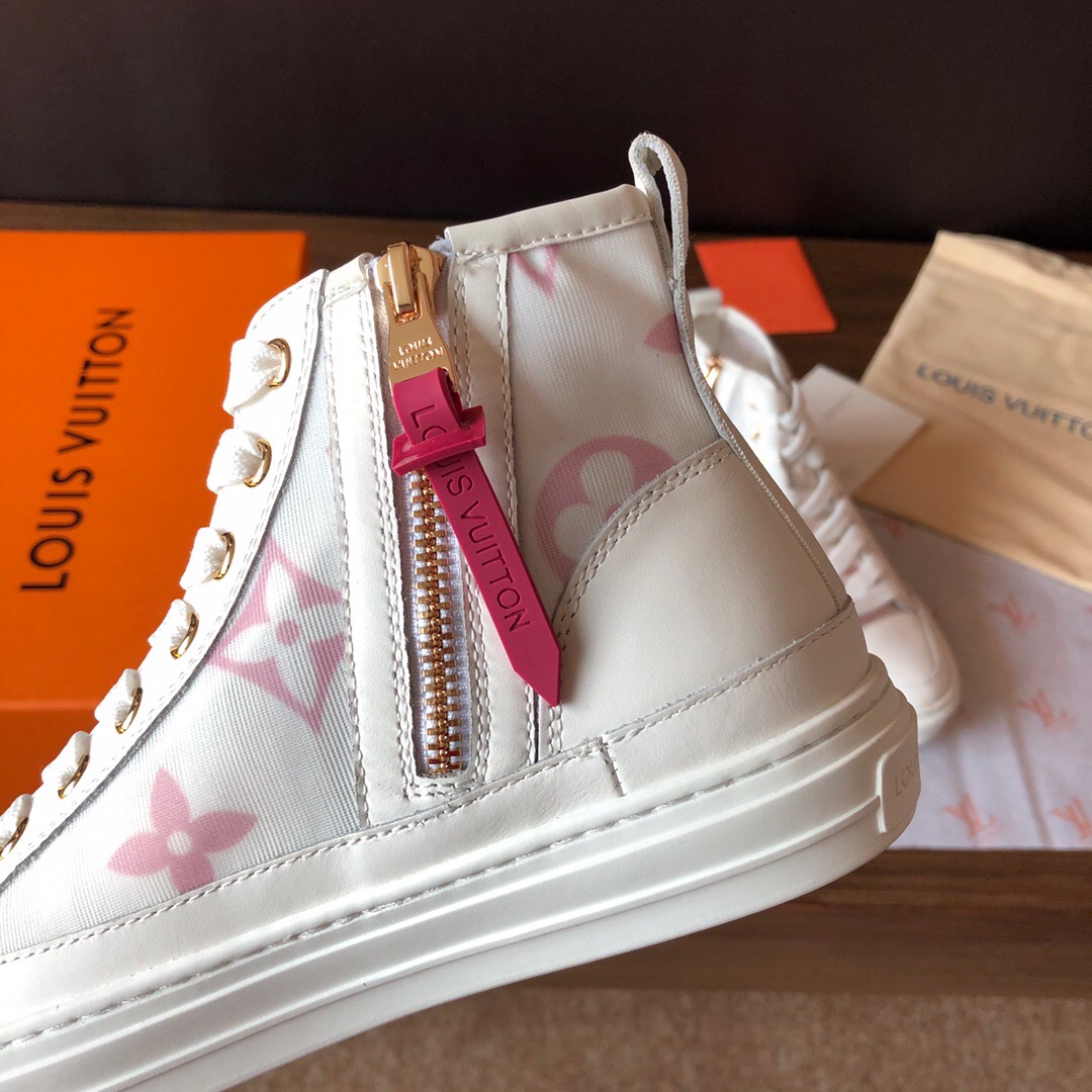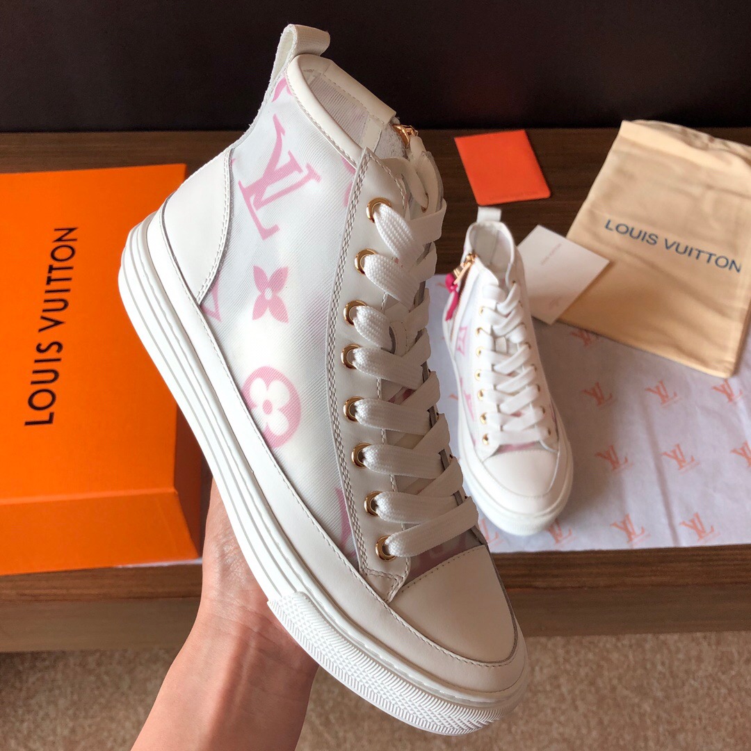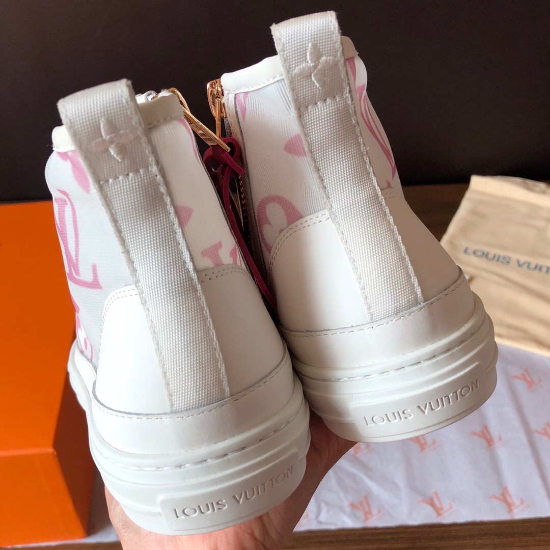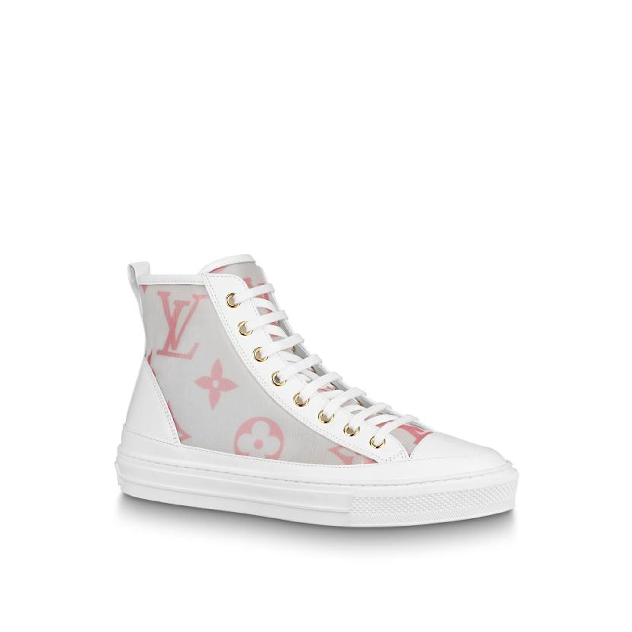 The iconic Stellar sneaker boot is revisited this season in a combination of calf leather and transparent technical fabric printed with the giant Monogram pattern. This classic hi-top features a side zip for easy fitting and a white rubber outsole with the Louis Vuitton signature at the back.