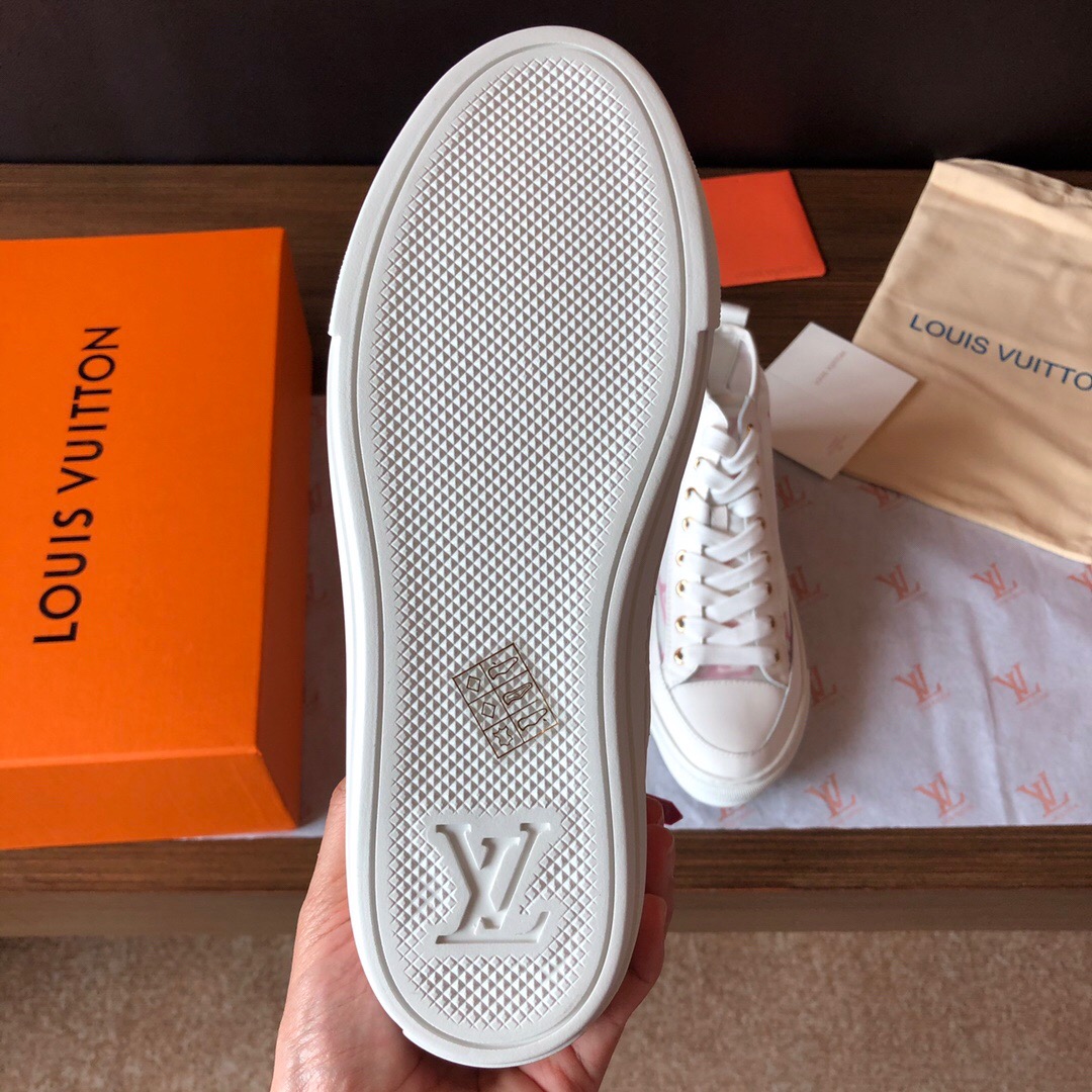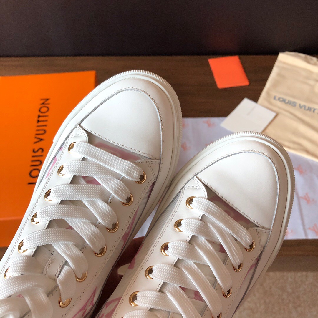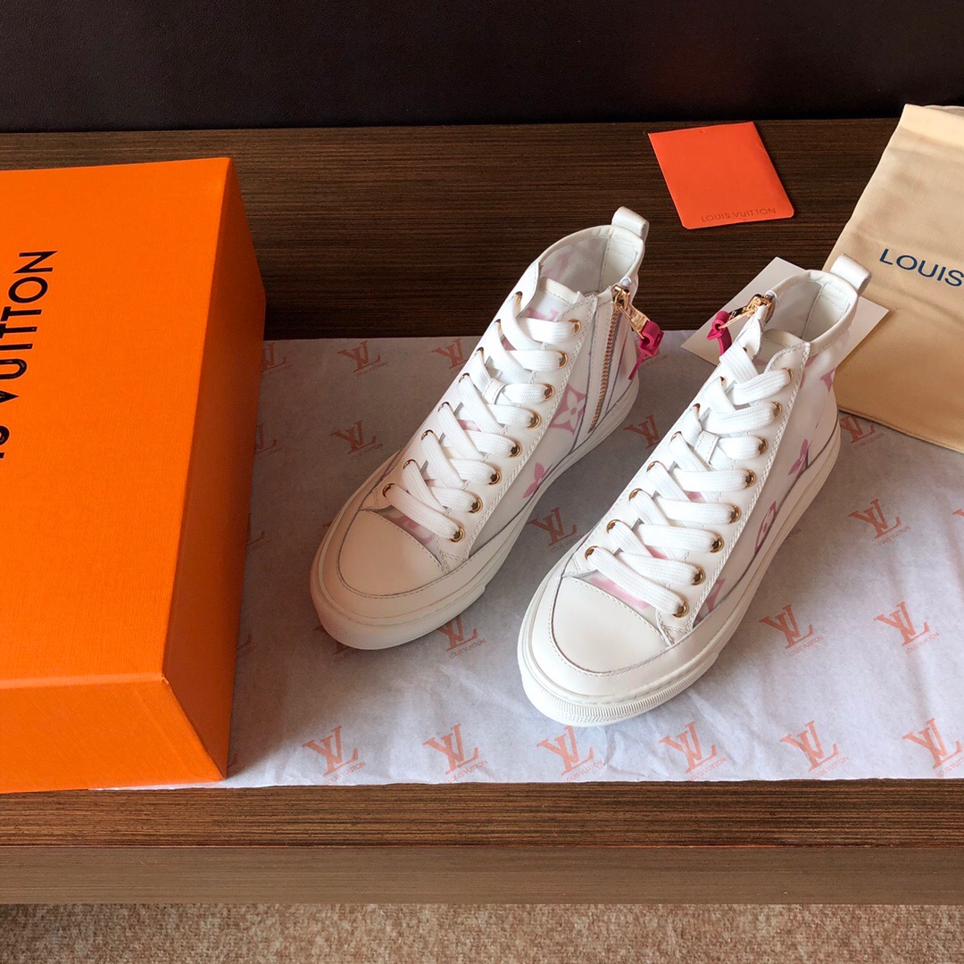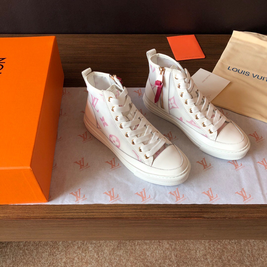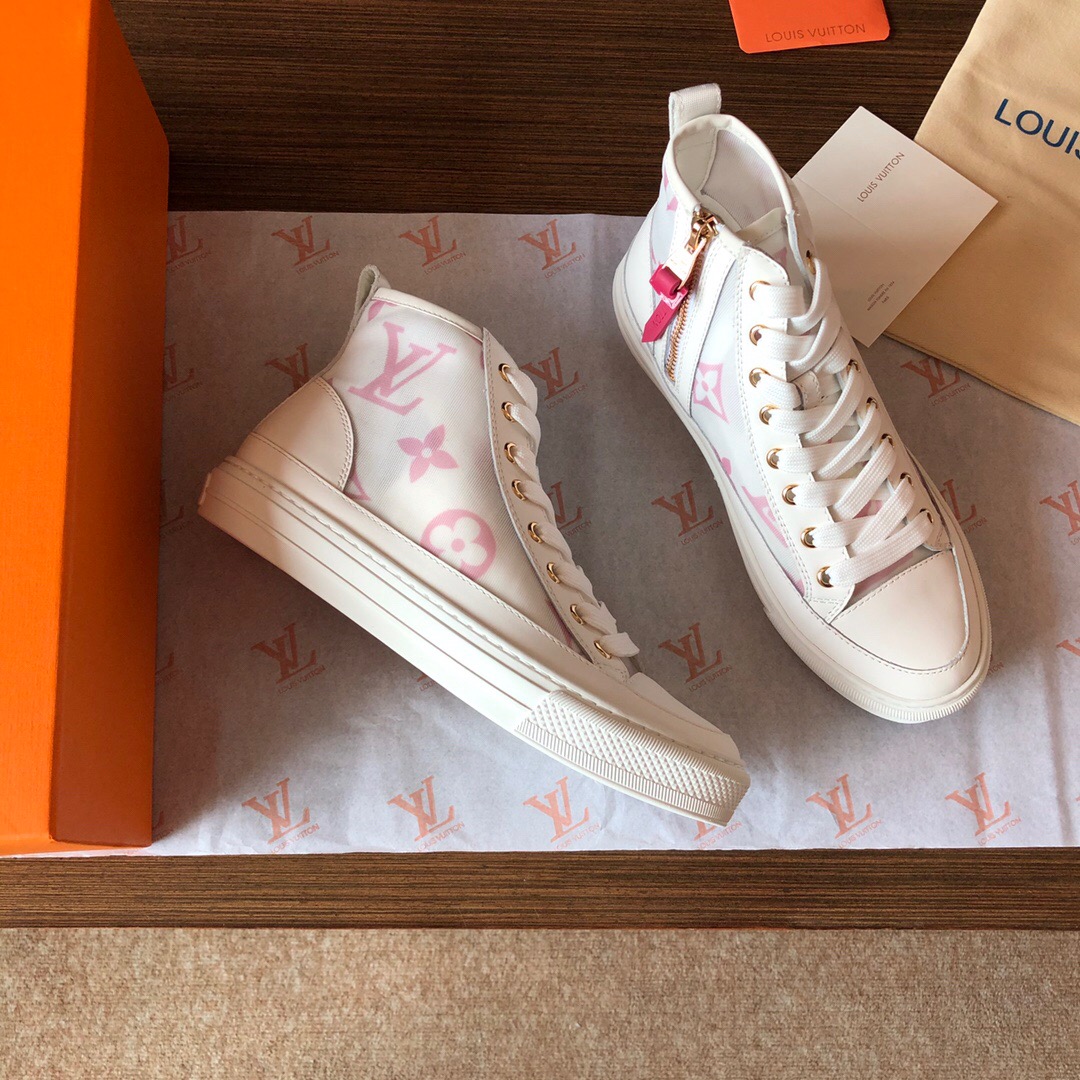 The iconic Stellar sneaker boot is revisited this season in a combination of calf leather and transparent technical fabric printed with the giant Monogram pattern. This classic hi-top features a side zip for easy fitting and a white rubber outsole with the Louis Vuitton signature at the back.