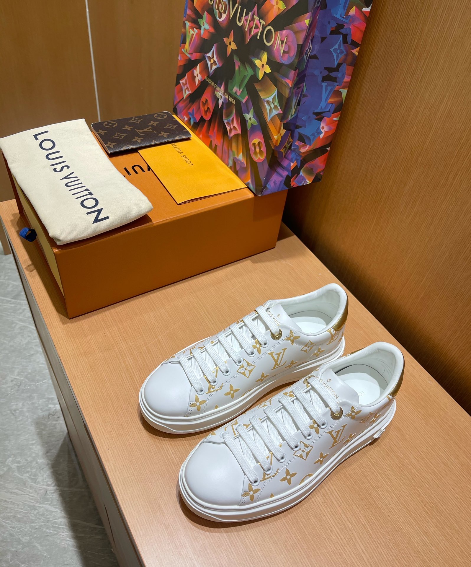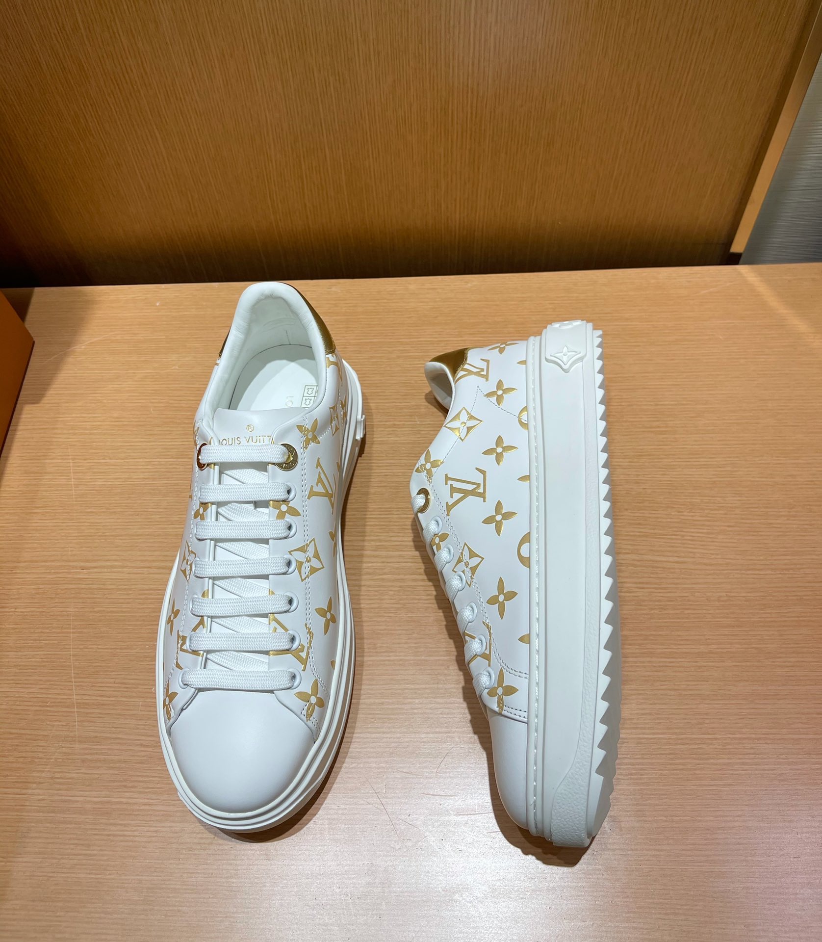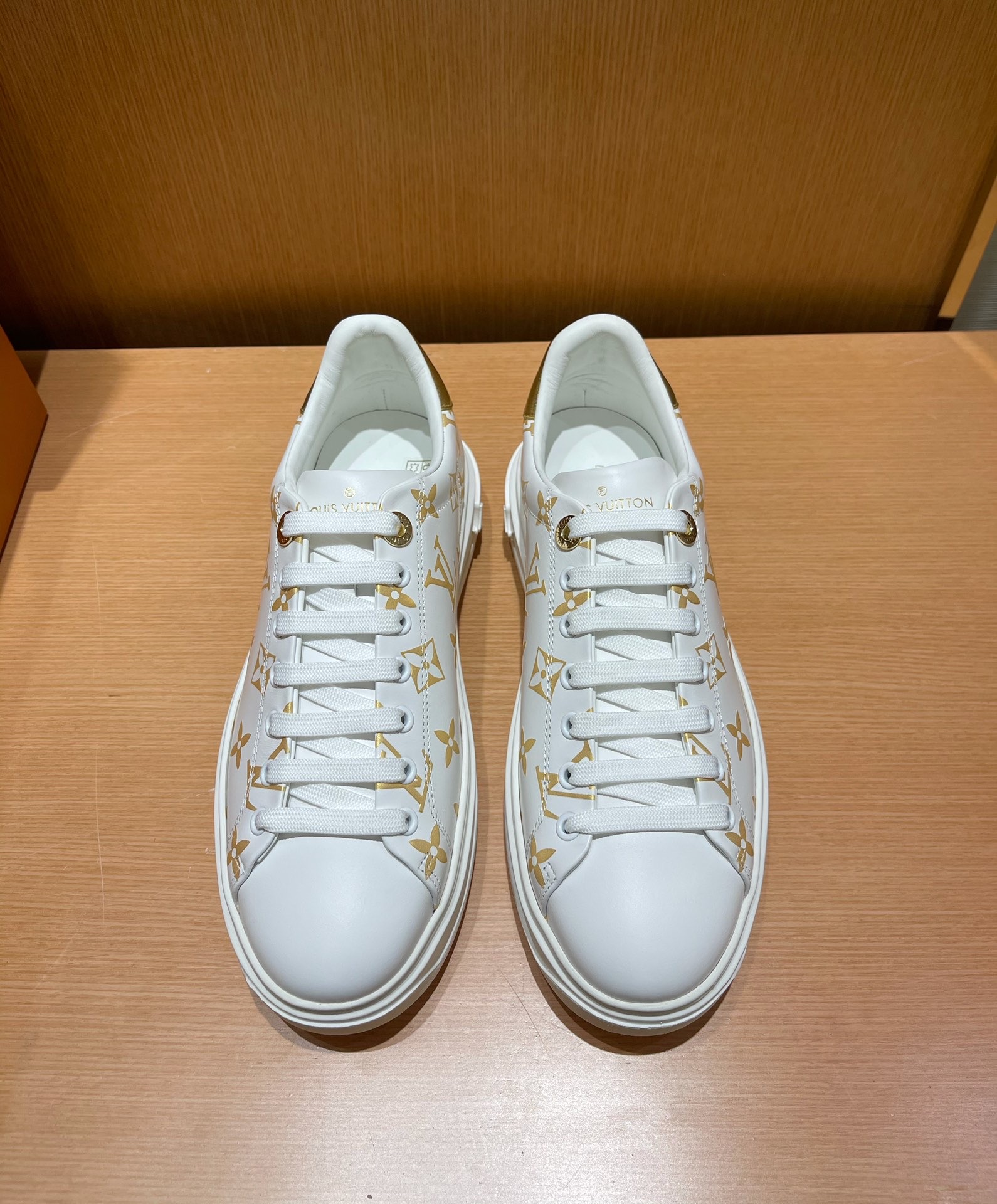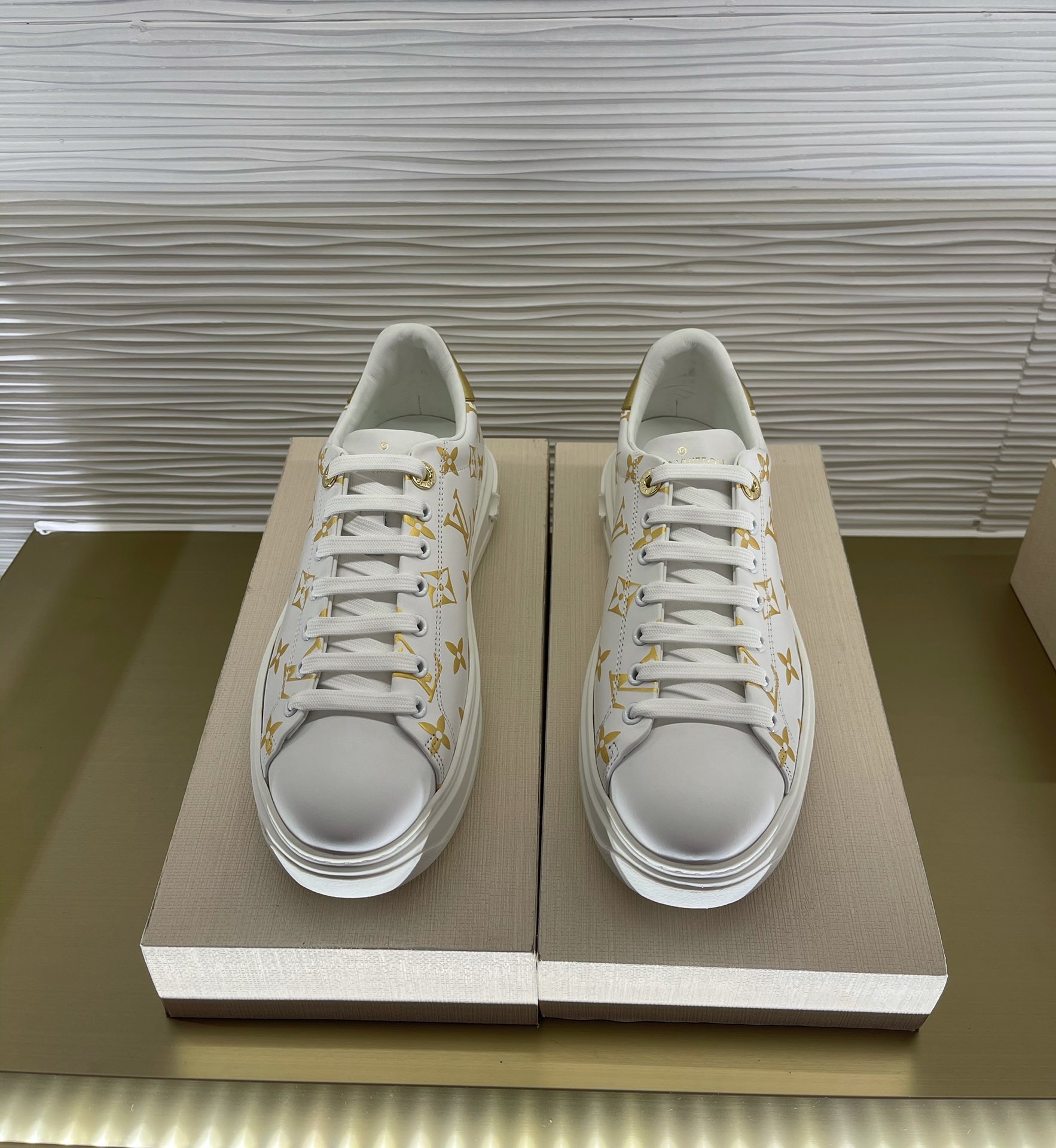 These Time Out sneakers feature calfskin with metallic Monogram embossing and a leather back of the same texture. The iconic thick outsole blooms with Monogram flowers, and the trend is self-evident.