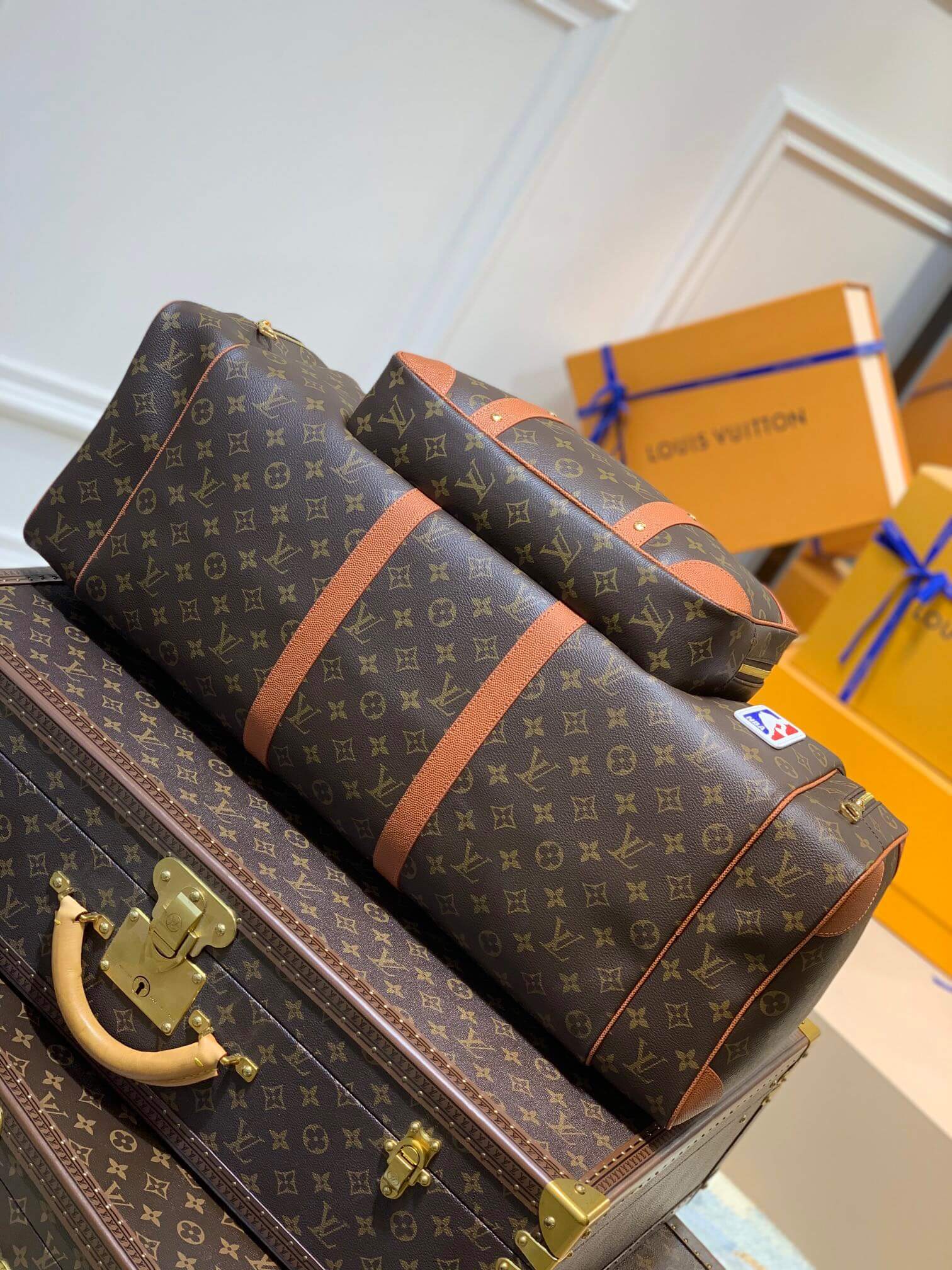 Part of LV x NBA SEASON 2 capsule collection, the Keepall Trio Pocket bag is made from Monogram canvas with trim in embossed brown leather reminiscent of a basketball. Three zipped outside compartments and a spacious main compartment make it ideal for sports gear. The leather corners and rivets on the compartments evoke the House’s iconic trunks.