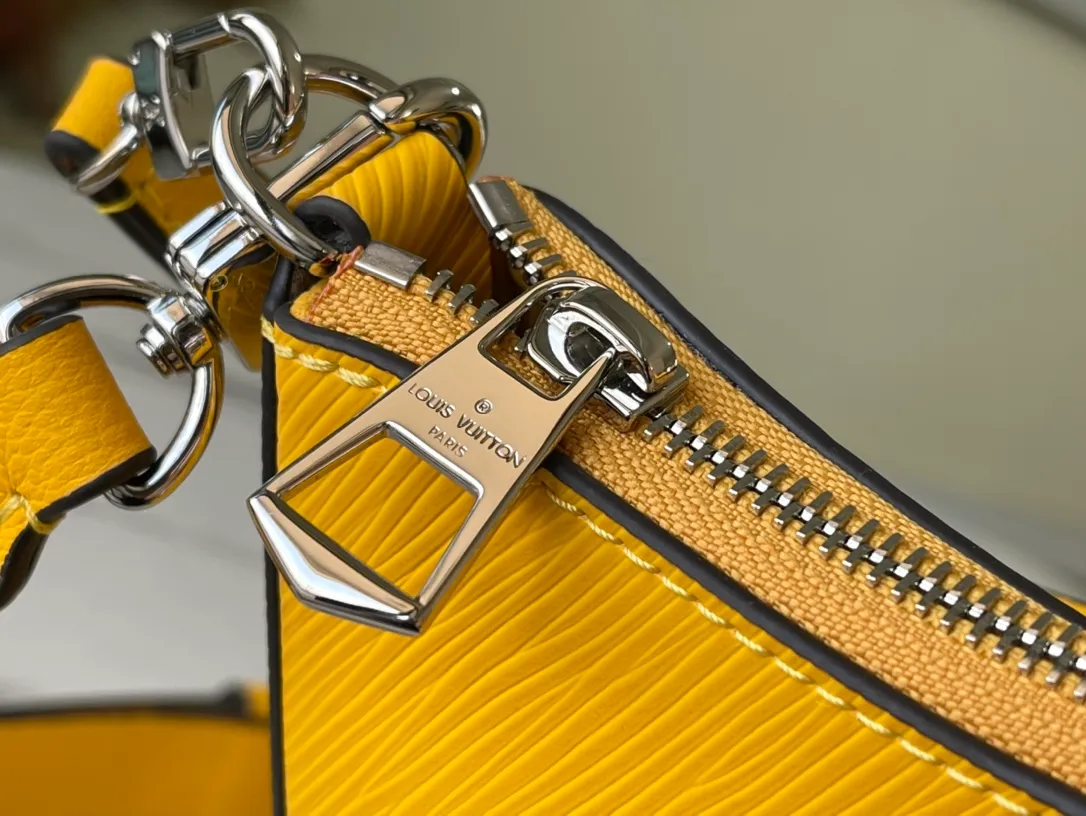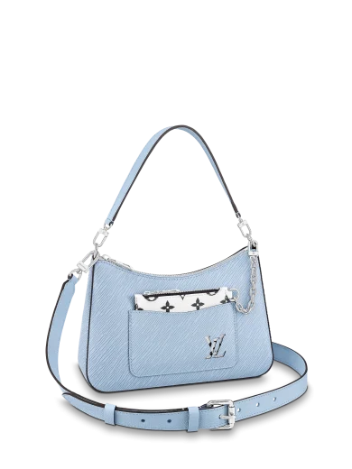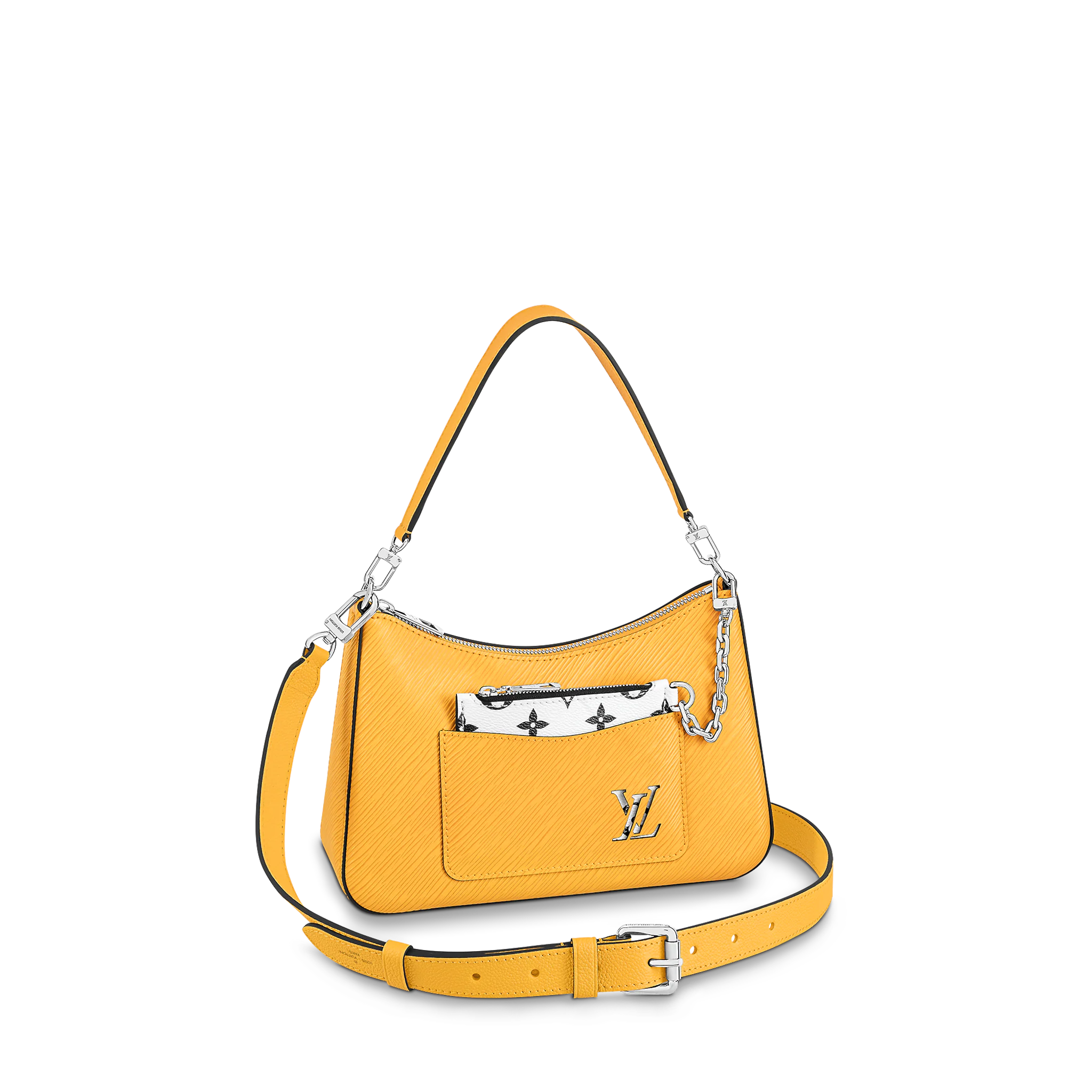 Buy it nowThe trendy Marelle is fashioned from grained Epi leather, endowed with a detachable canvas pouch attached to the bag thanks to a silver chain. This subtle touch of Monogram is visible thanks to the LV see-thought crafted in the front pocket of the bag. The Marelle can be carried by hand, elbow or shoulder with its detachable top handle, or worn as a cross-body thanks to its removable and adjustable leather strap.