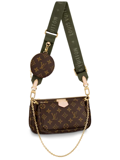 The Multi Pochette Accessoires is a hybrid cross-body bag with multiple pockets and compartments that brings together a Pochette Accessoires, a Mini Pochette Accessoires and a Round Coin Purse. Fashioned from Monogram canvas with a mini Monogram pattern on the sides of the two pochettes, it has both a removable gold-tone chain and an adjustable Louis Vuitton inscribed Jacquard strap for multiple carrying options.