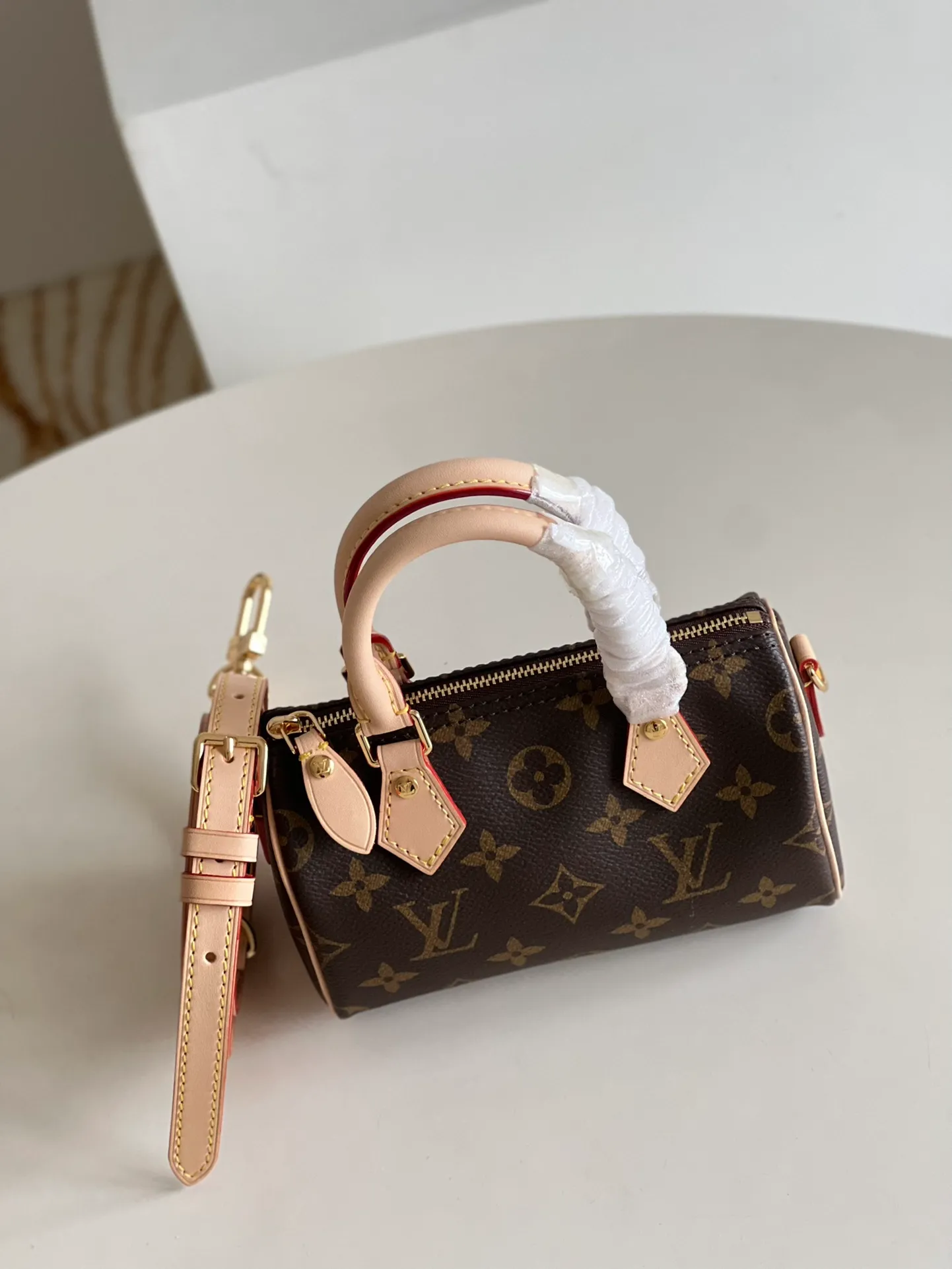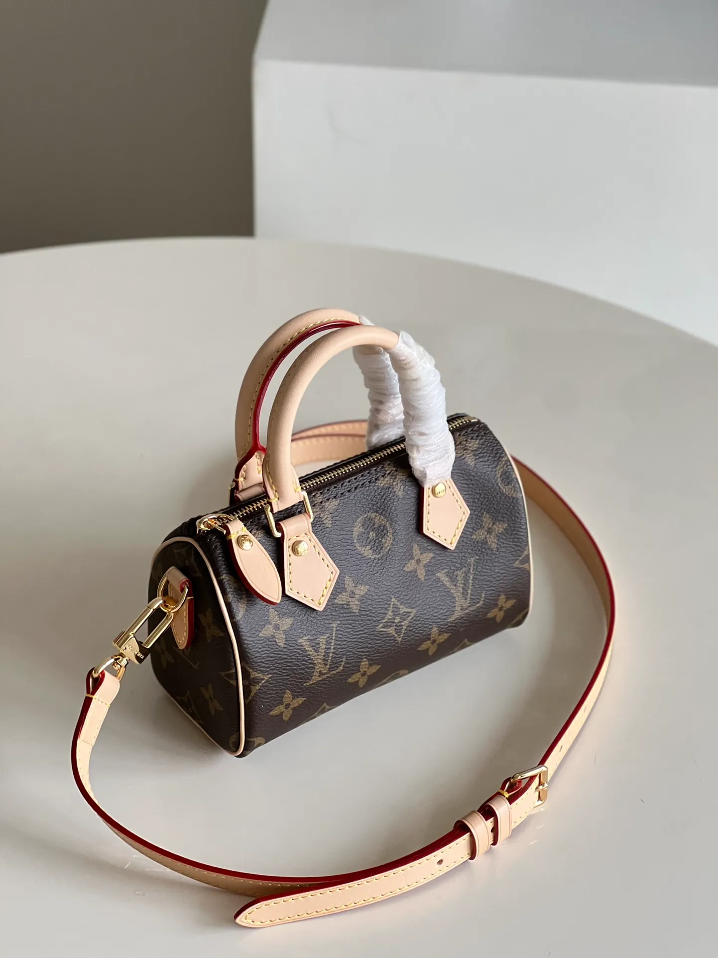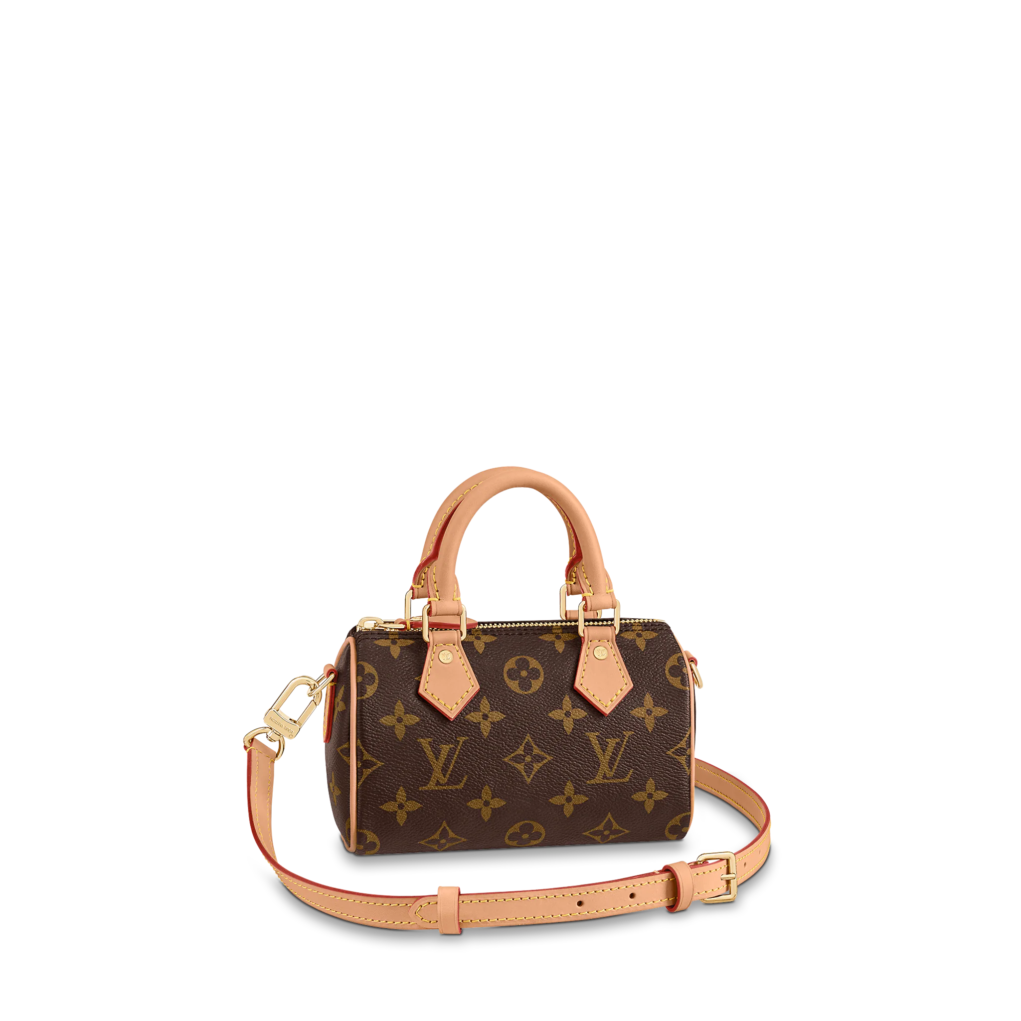 The Nano Speedy revamped in Monogram canvas is the perfect miniature version of Louis Vuitton’s iconic Speedy bag, and the ideal way to carry essentials. This beautifully crafted design is complemented by aged natural cowhide leather and gold-tone hardware. In addition to its two handles, it has a removable, adjustable shoulder strap for different carry options.