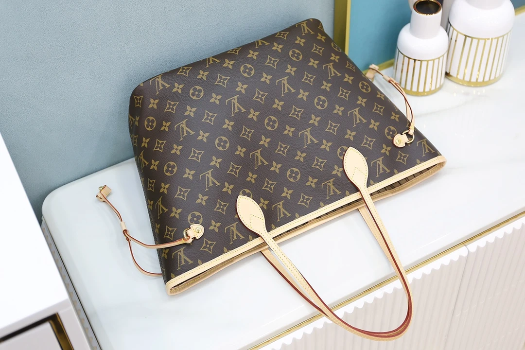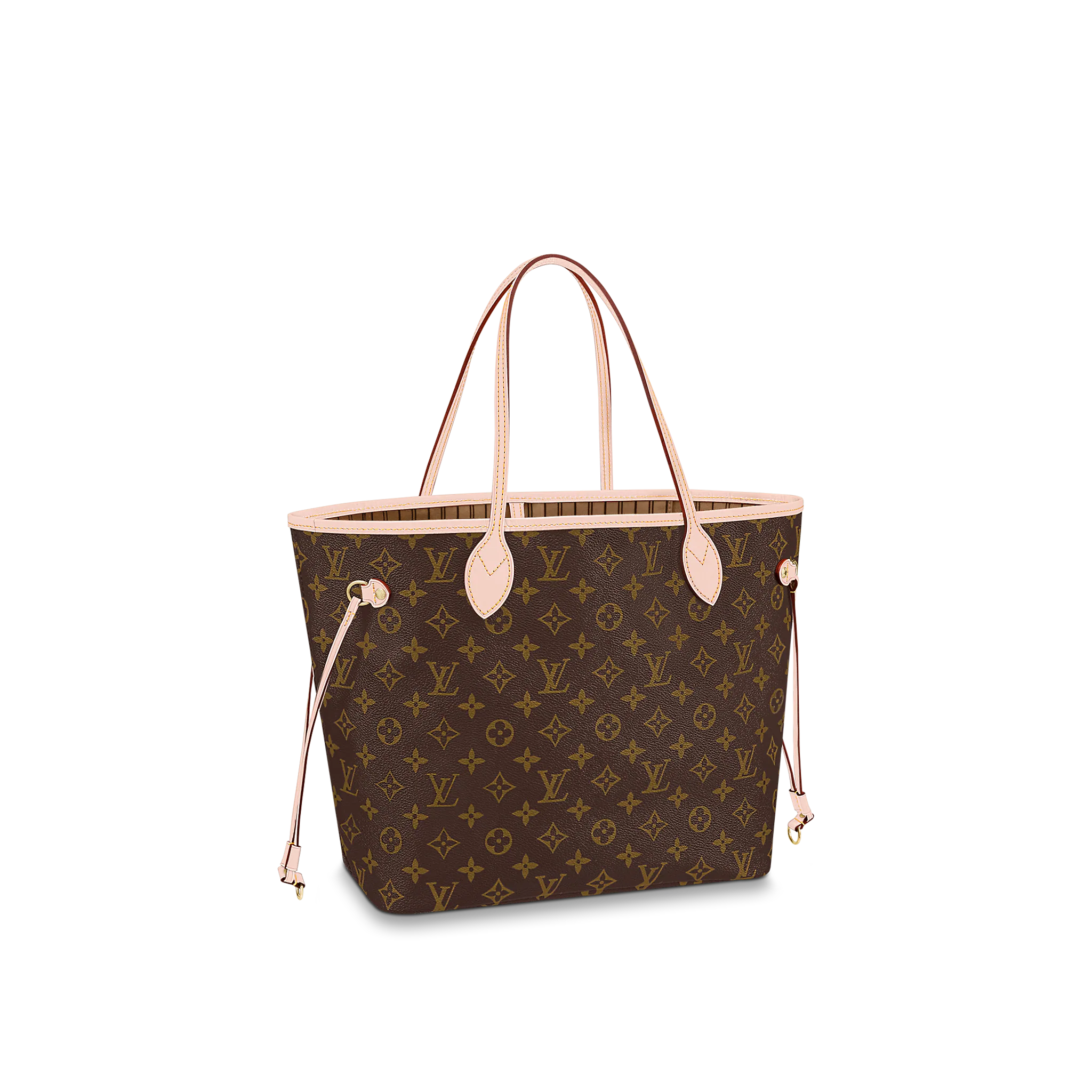 The Neverfull MM tote unites timeless design with heritage details. Made from supple Monogram canvas with natural cowhide trim, it is roomy yet not bulky, with side laces that cinch for a sleek allure or loosen for a casual look. Slim, comfortable handles slip easily over the shoulder or arm. Lined in colorful textile, it features a removable pouch which can be used as a clutch or an extra pocket.
