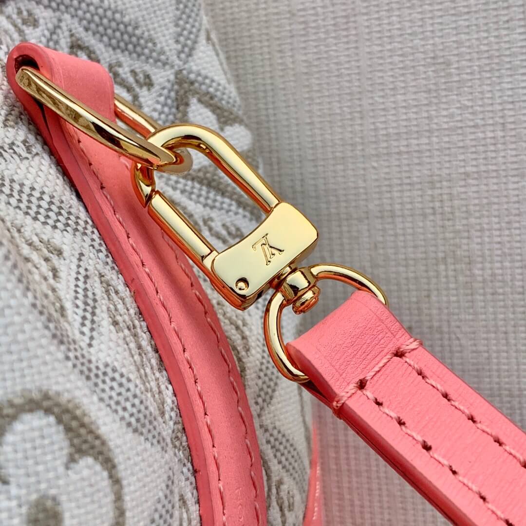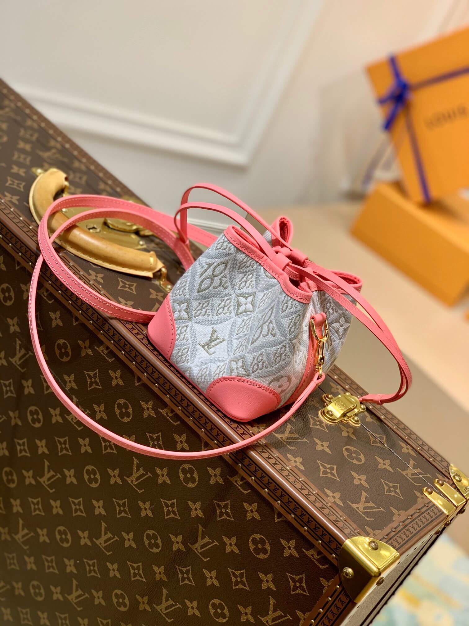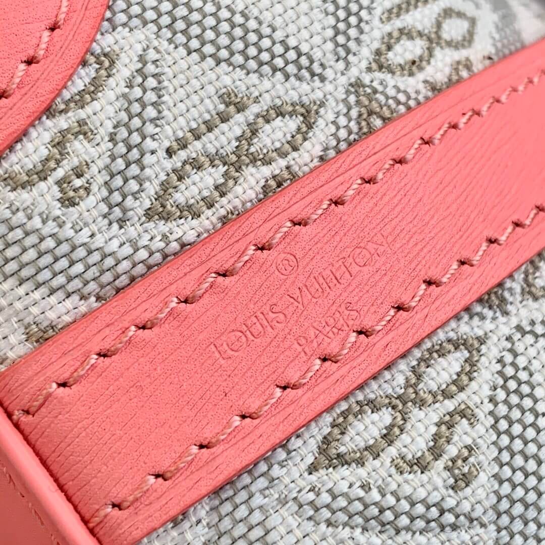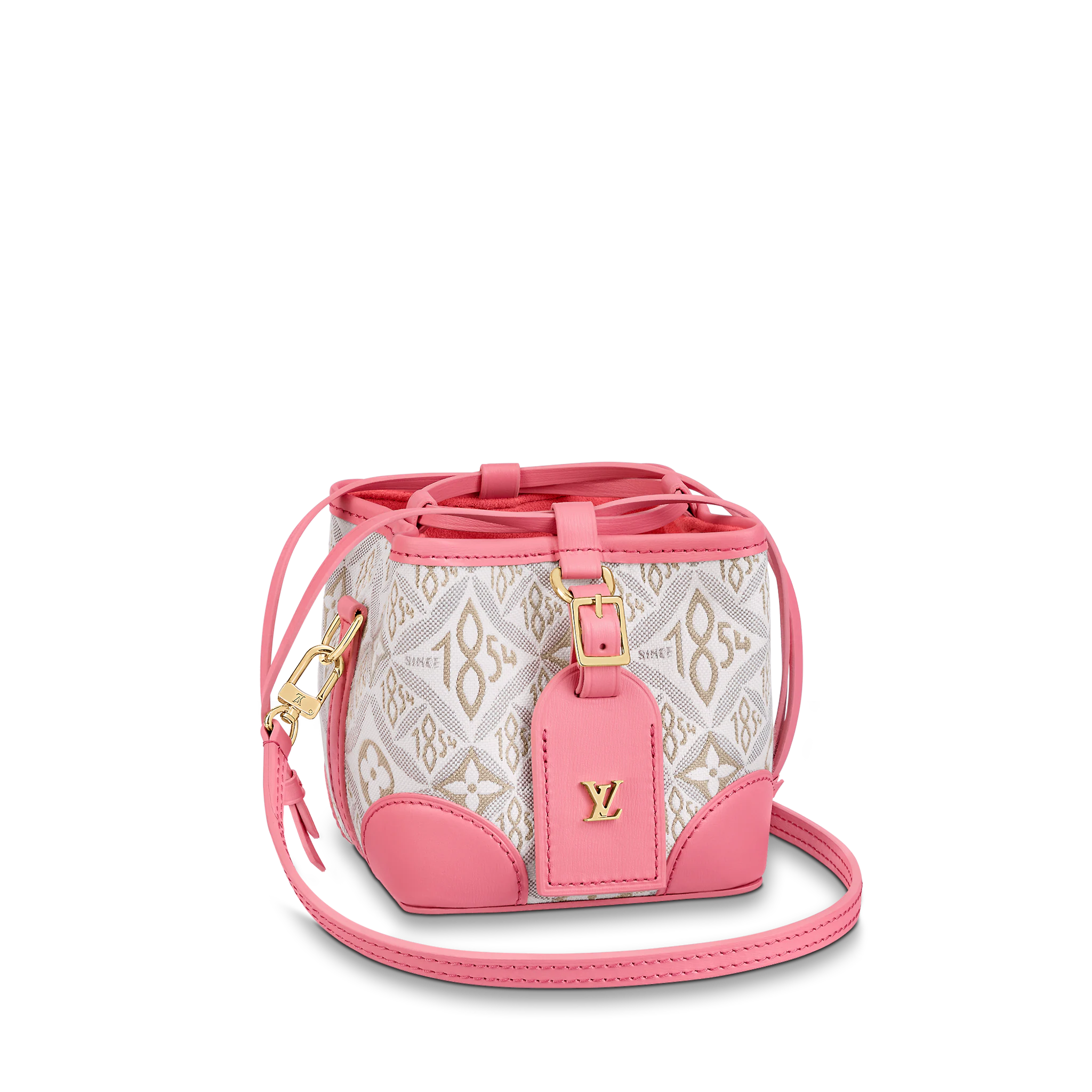 The Noé purse is a miniature reinterpretation of the iconic Noé bag fashioned from Since 1854 jacquard canvas, which combines Louis Vuitton symbols with the date the House was founded. It comes with a removable, adjustable leather strap for shoulder or cross-body carry. The design also features a luggage tag, referencing the House’s travel heritage.