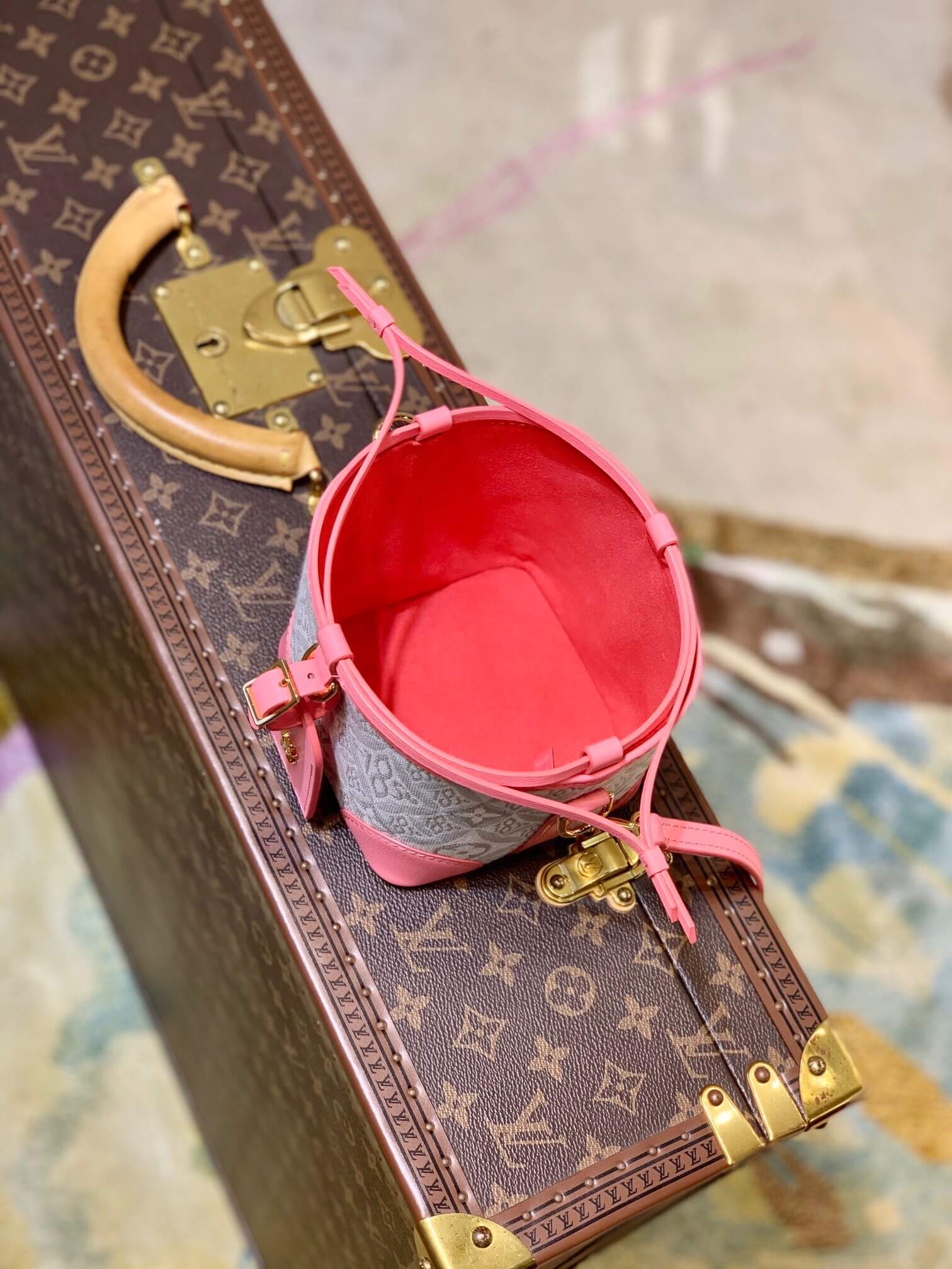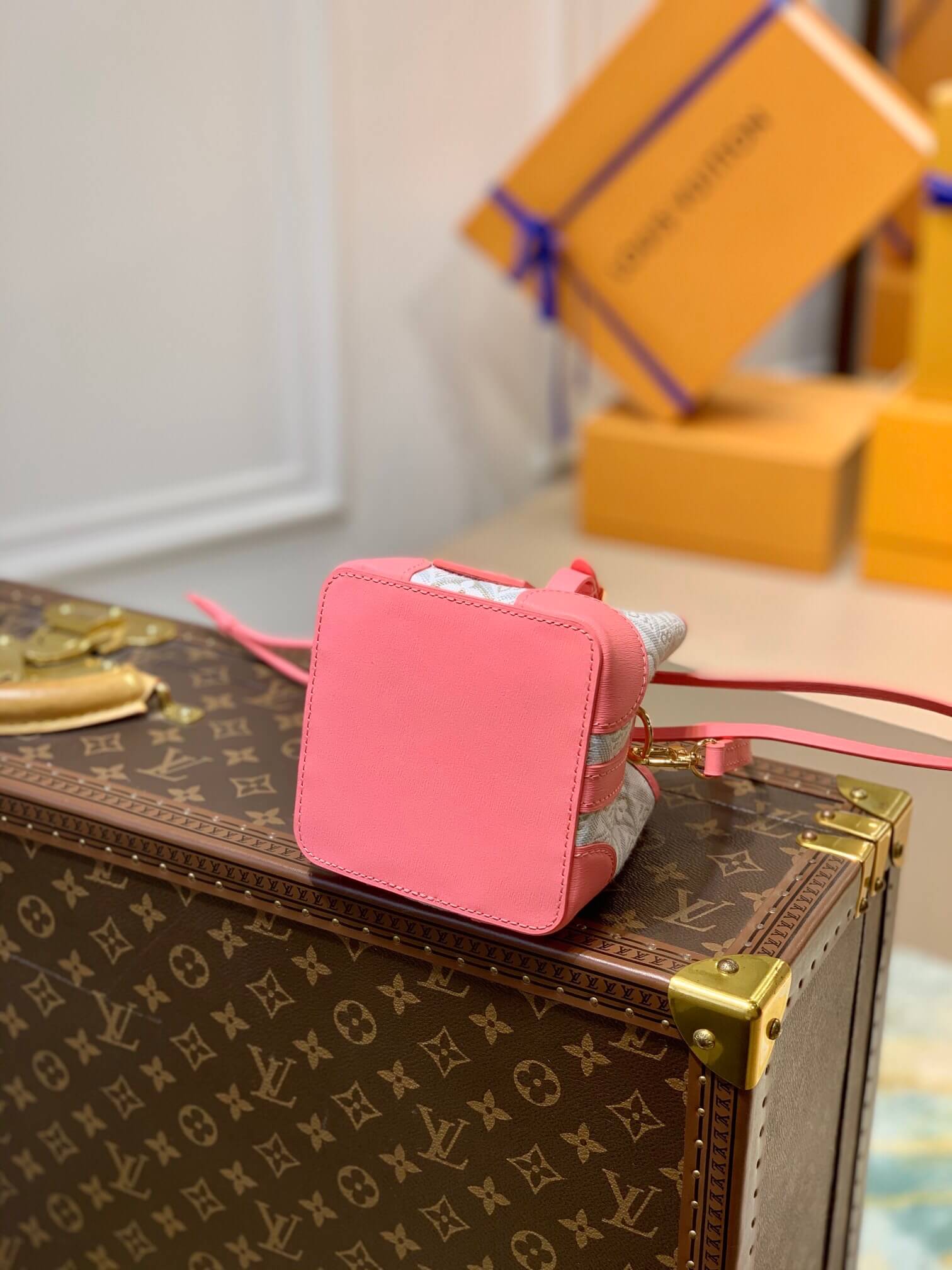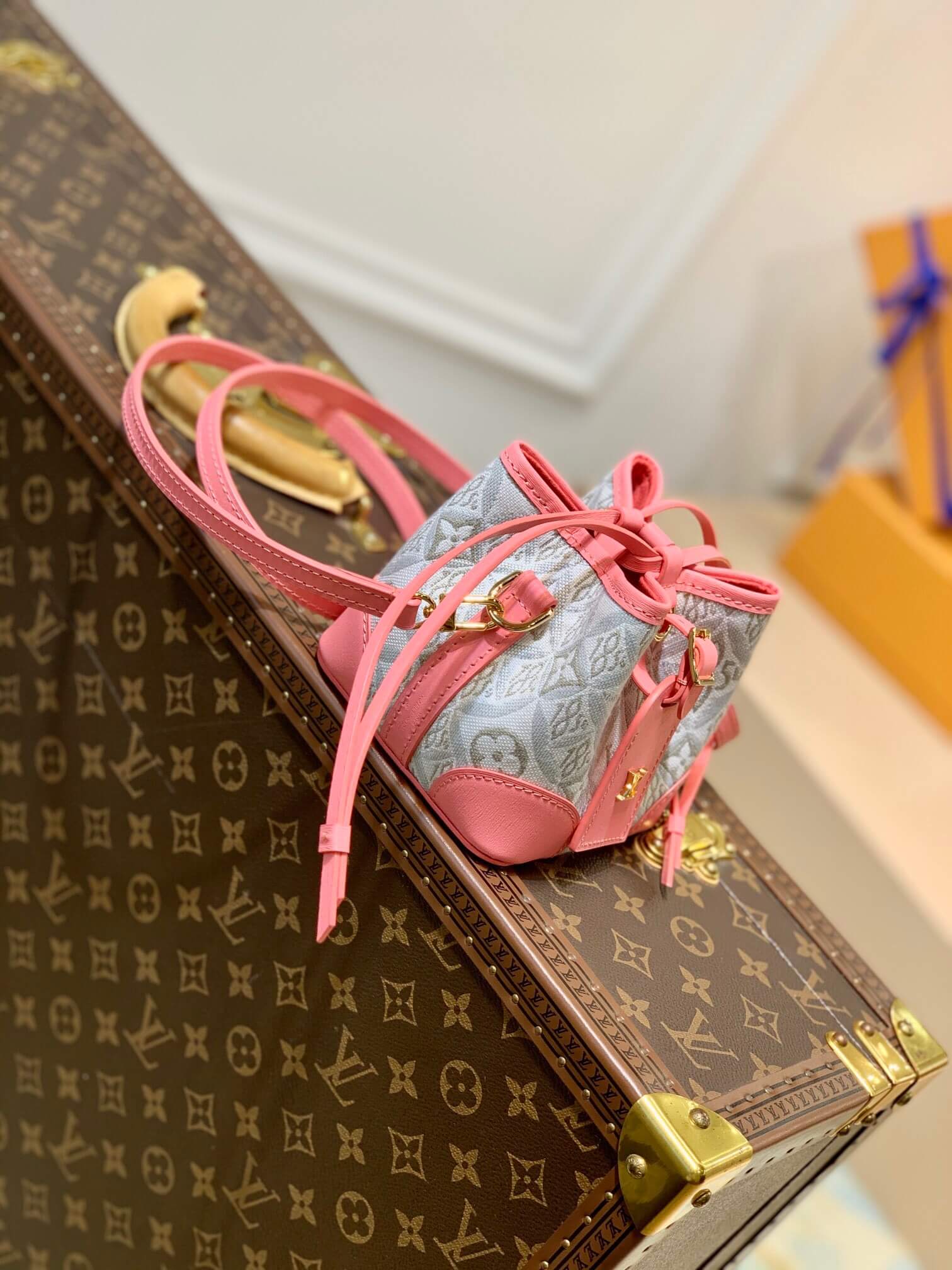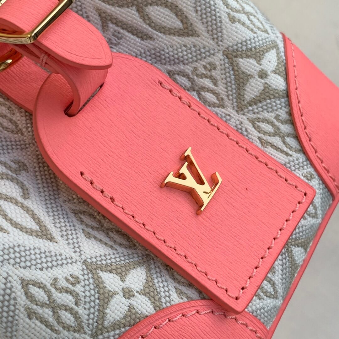 The Noé purse is a miniature reinterpretation of the iconic Noé bag fashioned from Since 1854 jacquard canvas, which combines Louis Vuitton symbols with the date the House was founded. It comes with a removable, adjustable leather strap for shoulder or cross-body carry. The design also features a luggage tag, referencing the House’s travel heritage.