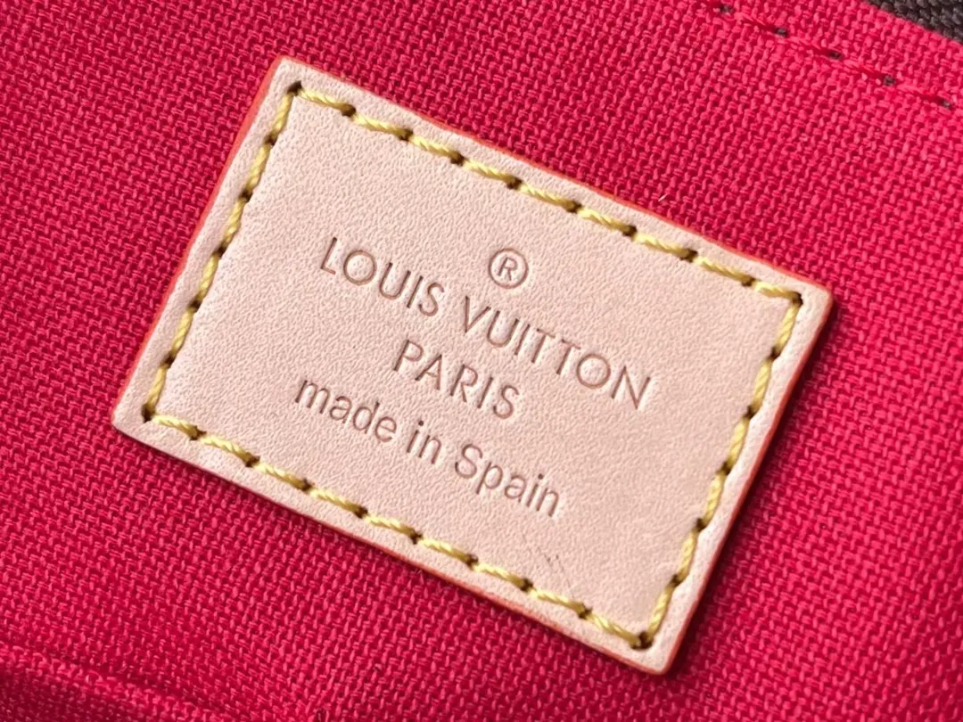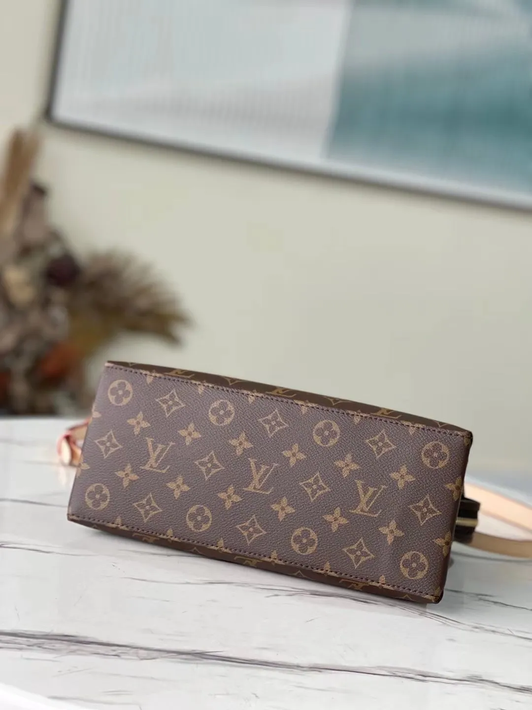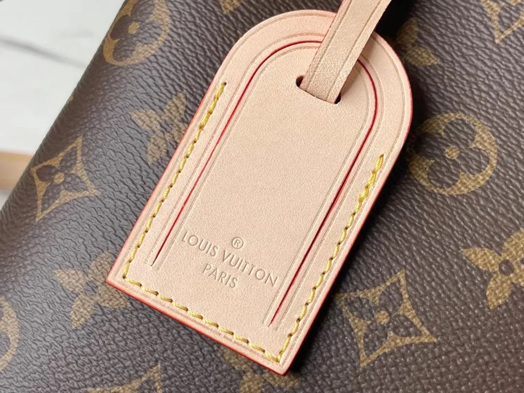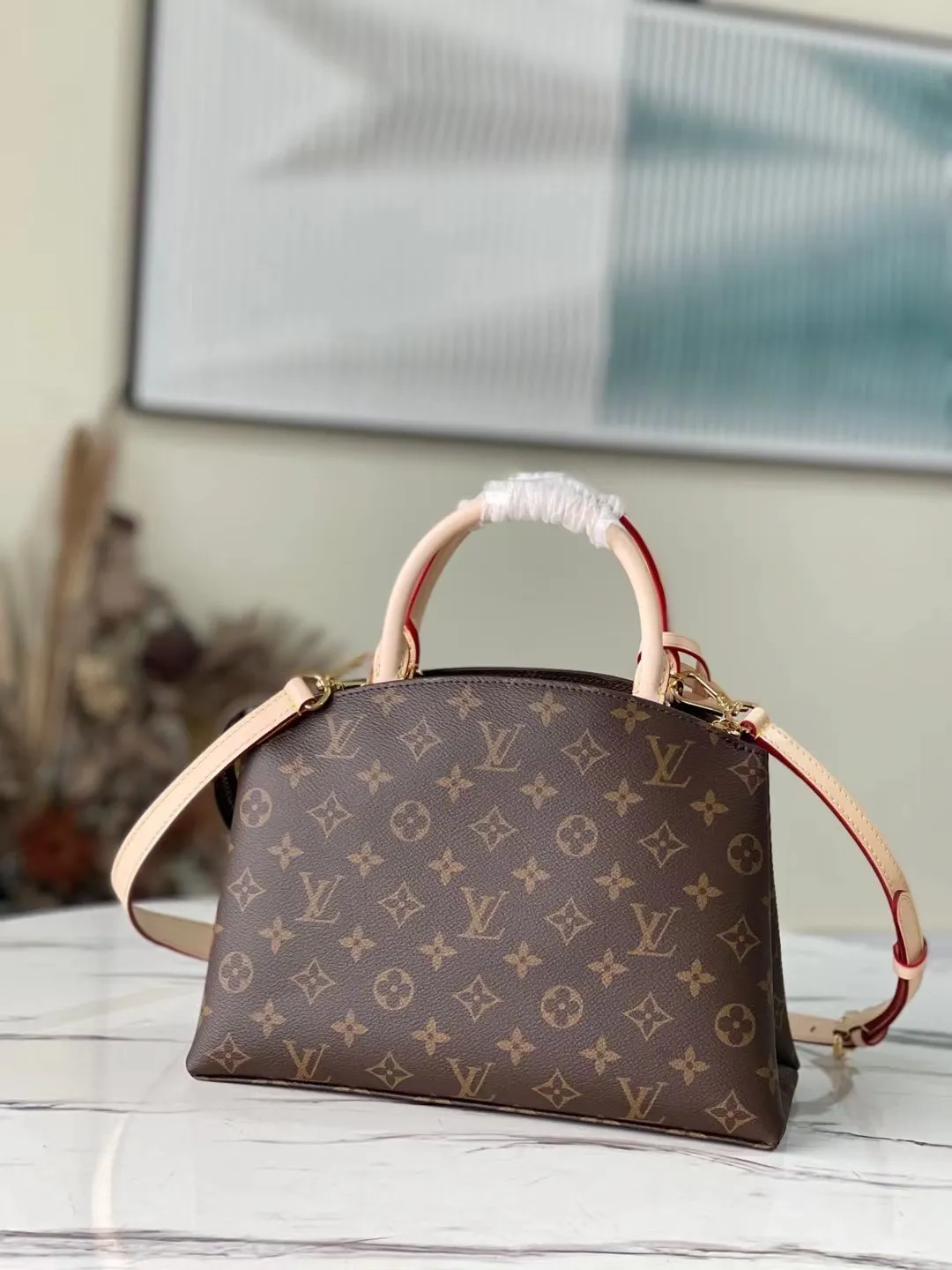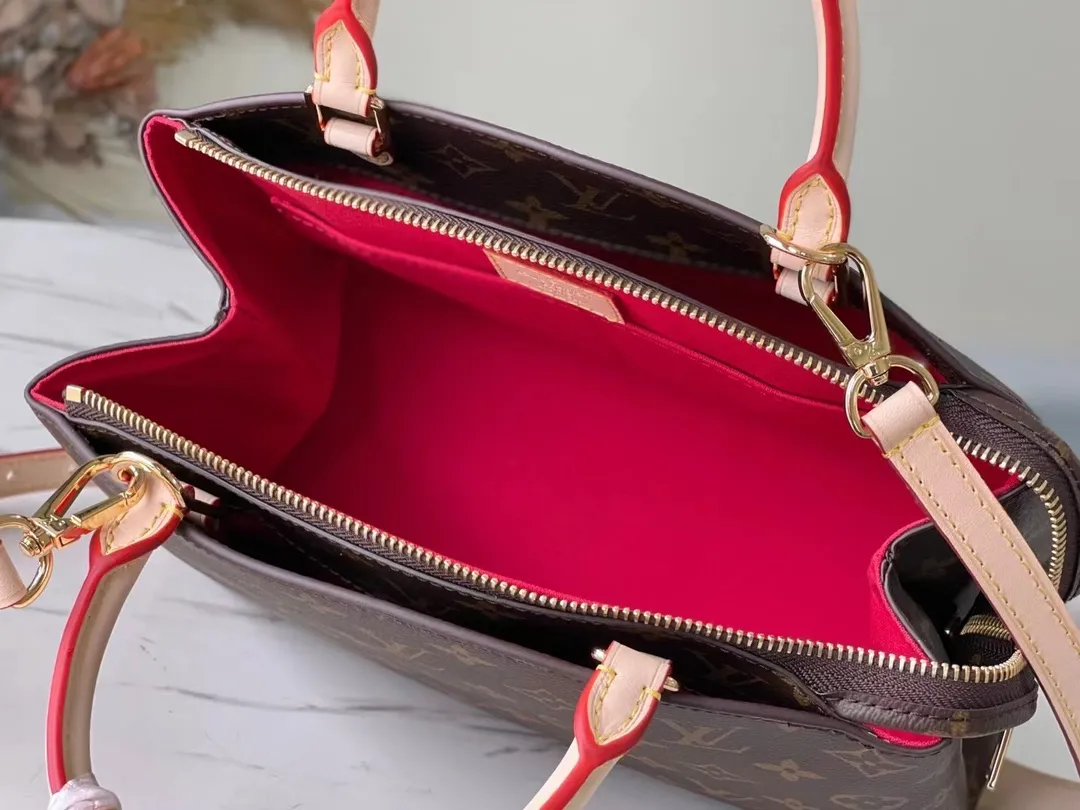 The timelessly feminine Petit Palais tote bag is made from Monogram canvas, trimmed with natural leather, and lined in a lush red textile. A removable and adjustable strap, in addition to Toron top handles, enables multiple carrying options. The gold-color padlock on the luggage tag evokes the House’s travel heritage