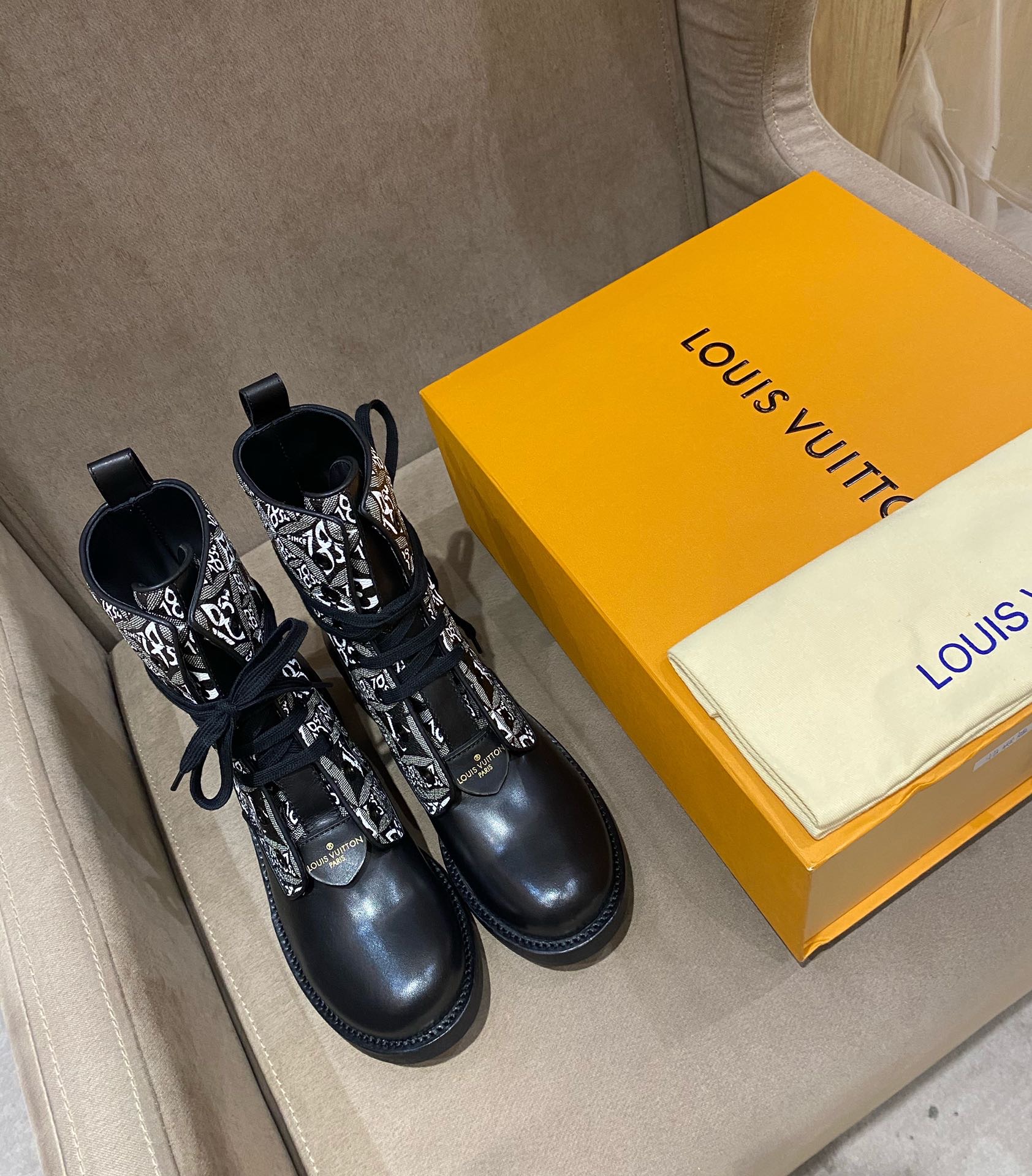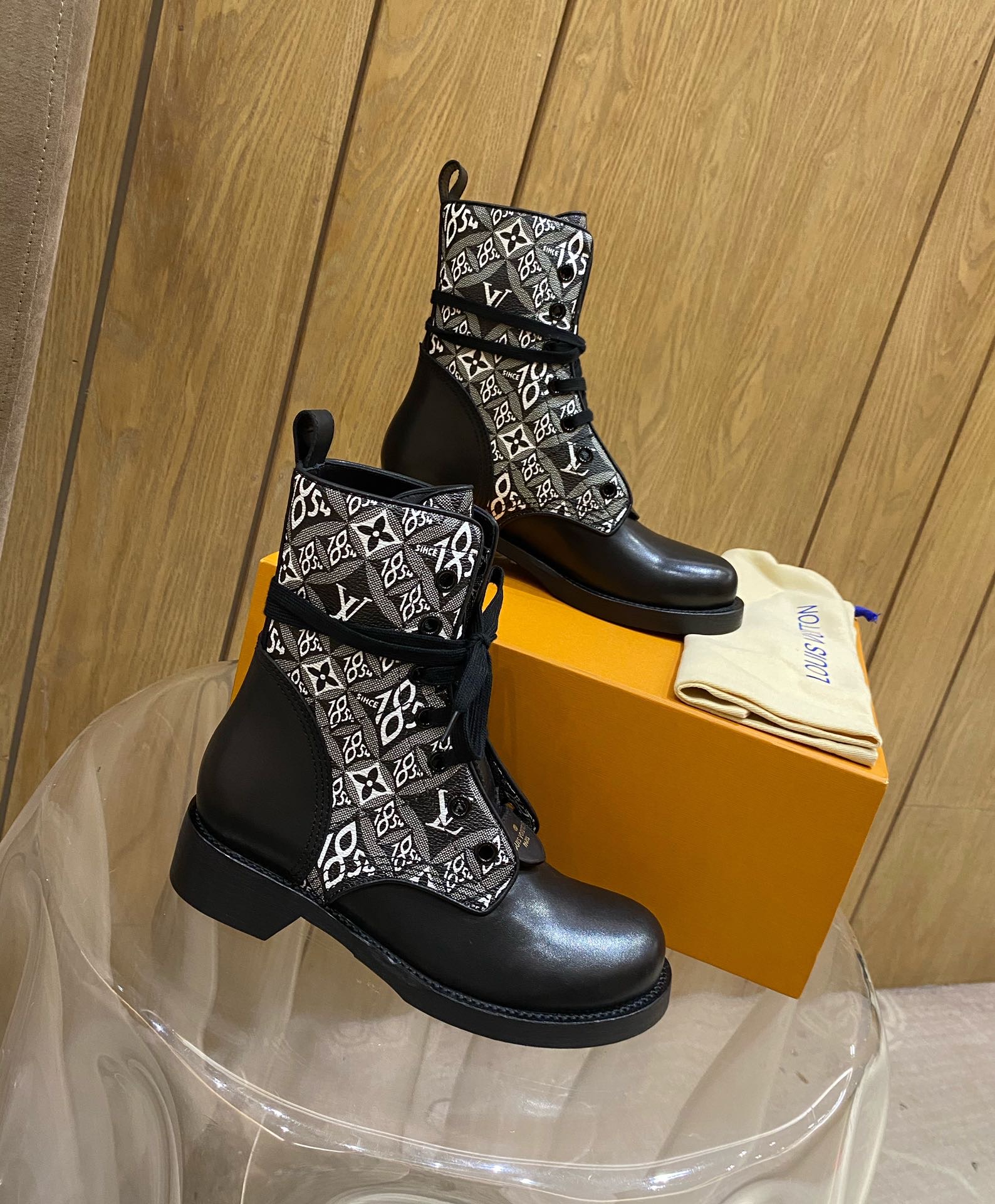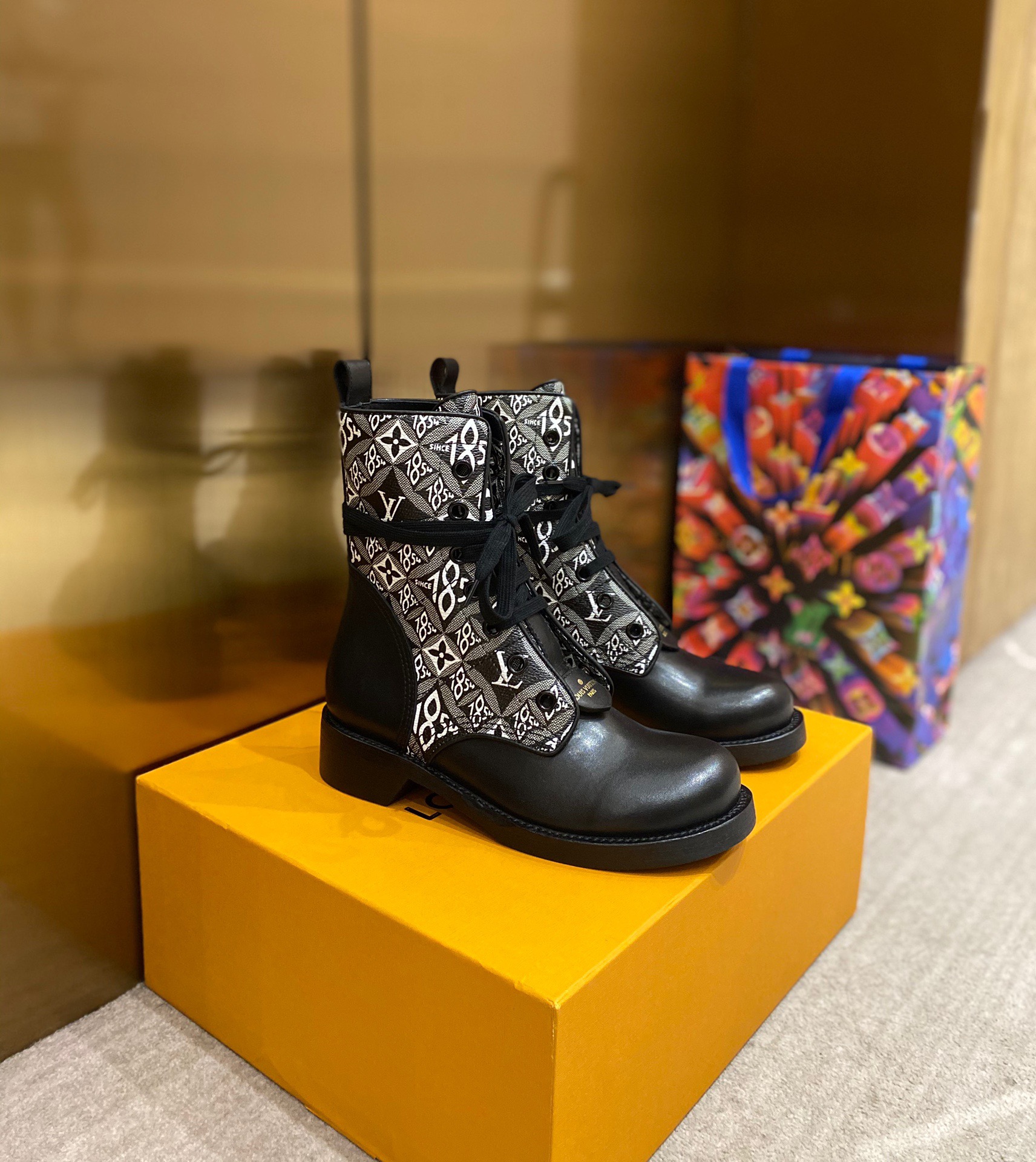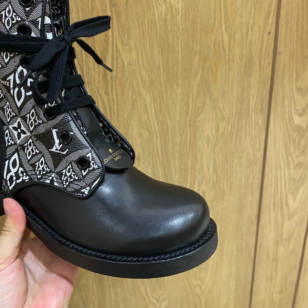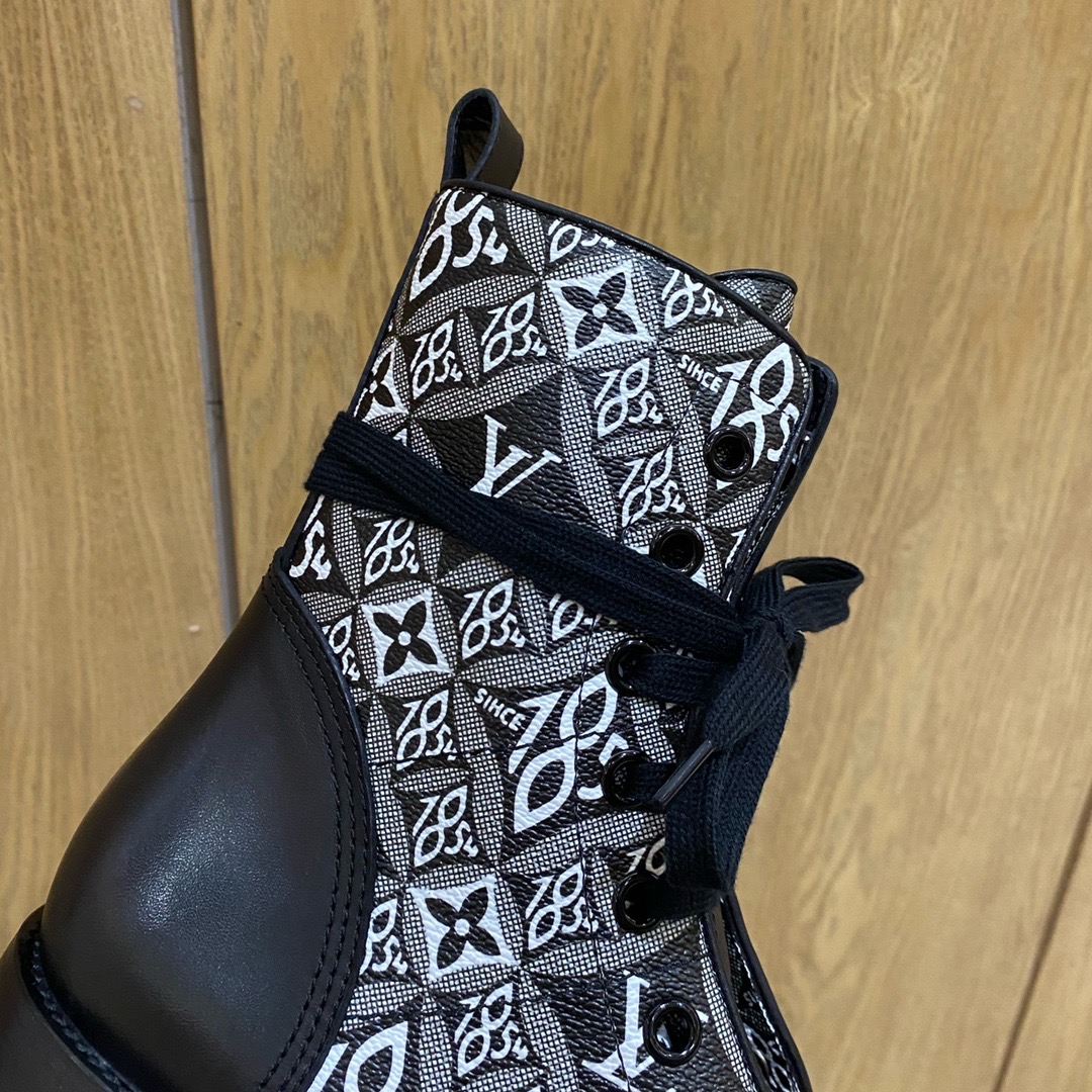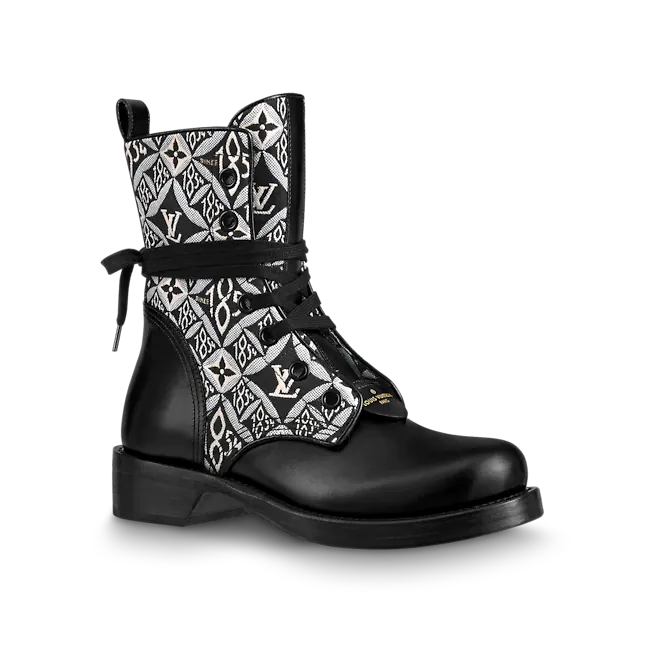 This version of the Metropolis flat ranger is part of the Since 1854 collection of accessories, leather goods and ready-to-wear. This fashionable combat boot combines black calf leather with jacquard textile featuring a vintage-look canvas created by Louis Vuitton Artistic Director Nicolas Ghesquière. The name Since 1854 references the date the House was founded.