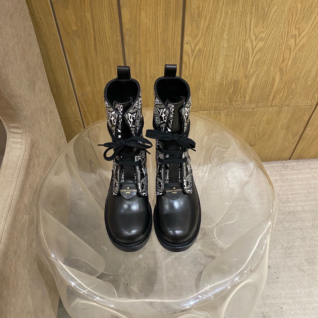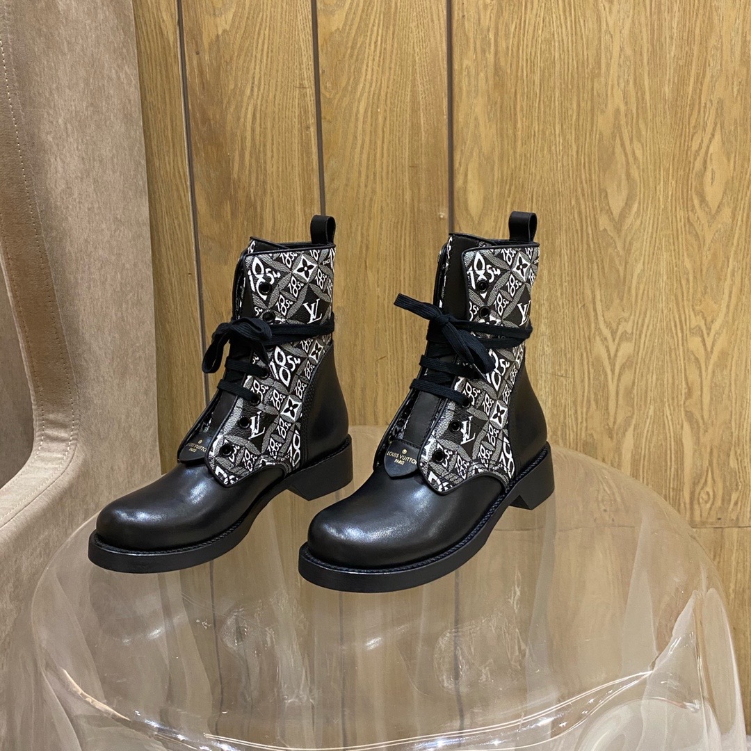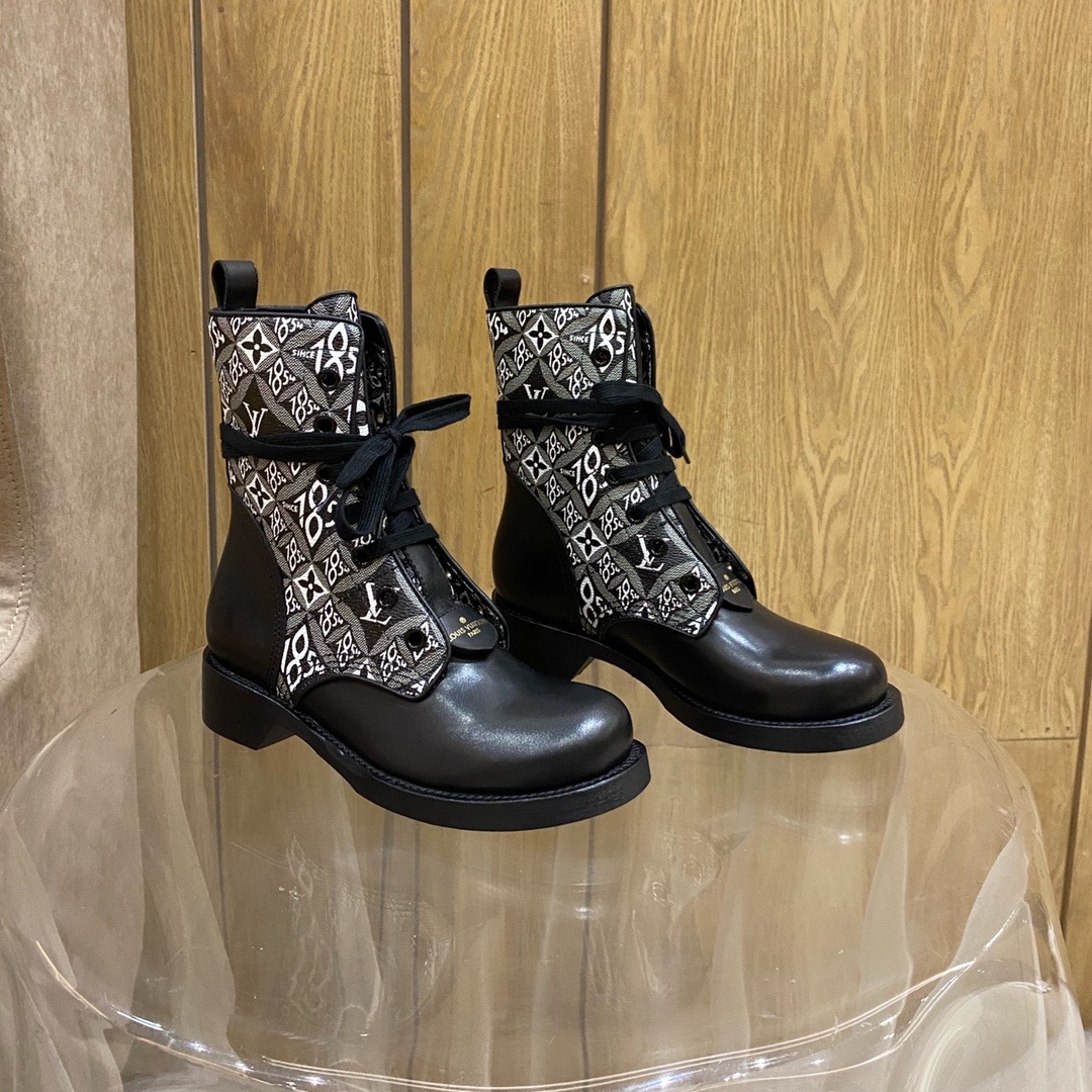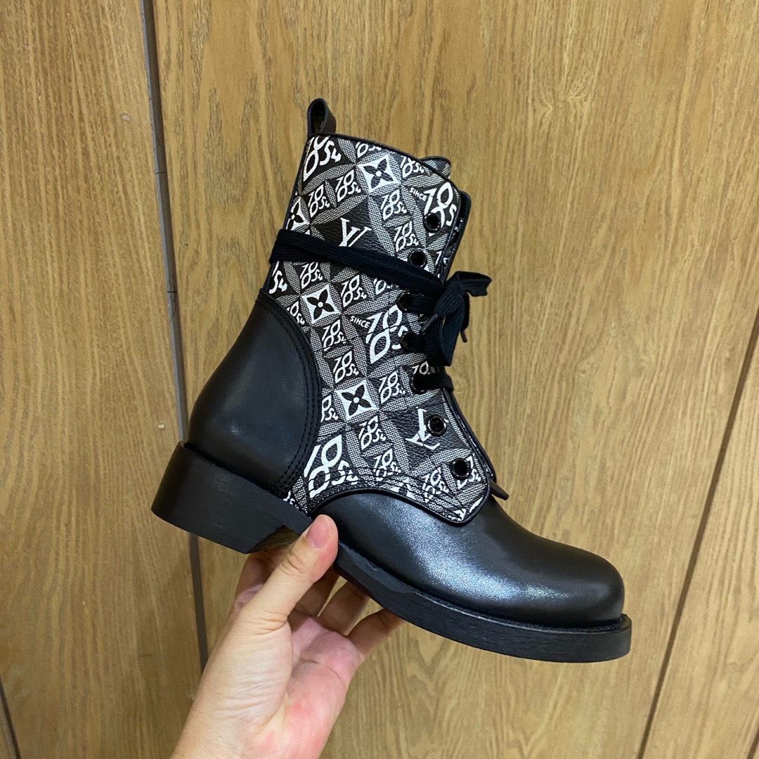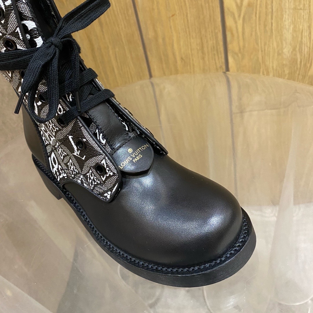 This version of the Metropolis flat ranger is part of the Since 1854 collection of accessories, leather goods and ready-to-wear. This fashionable combat boot combines black calf leather with jacquard textile featuring a vintage-look canvas created by Louis Vuitton Artistic Director Nicolas Ghesquière. The name Since 1854 references the date the House was founded.