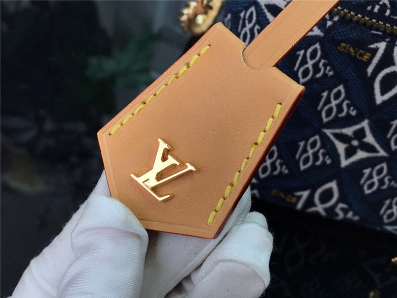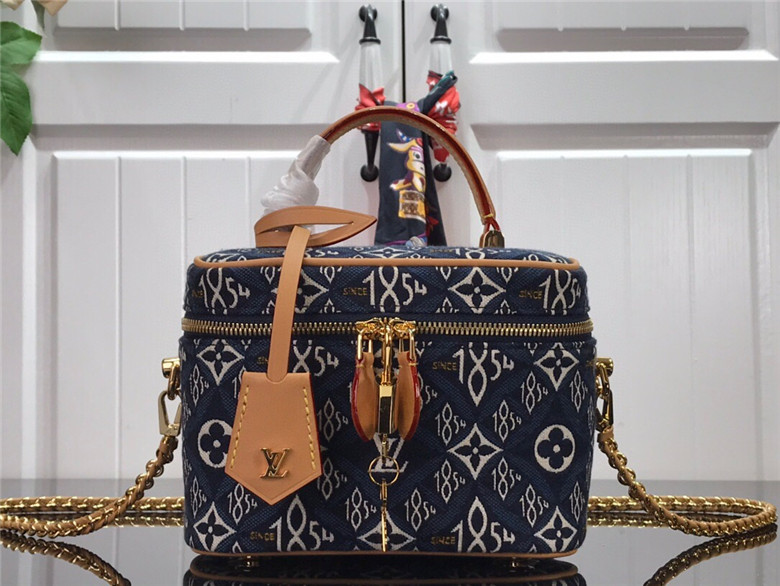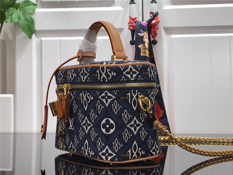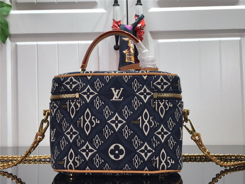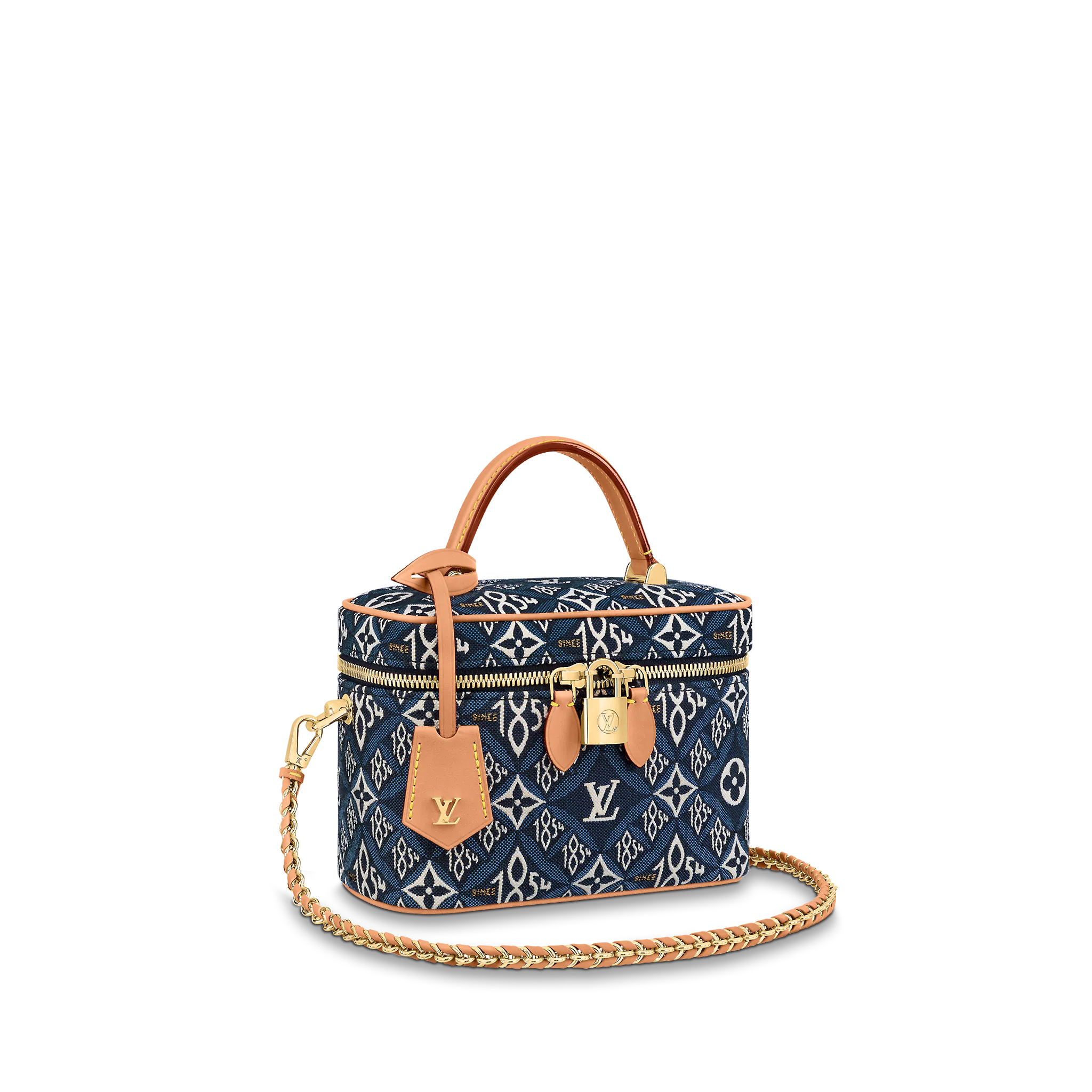 For Spring 2021, Nicolas Ghesquière crafts the Vanity PM handbag in a vibrant blue Jacquard Since 1854 textile, trimmed with aged natural leather. The pattern combines 1854s, the year of the House’s founding, with Monogram Flowers. It’s comfortable to carry by hand and over the shoulder or cross-body thanks to its removable braided-leather chain.