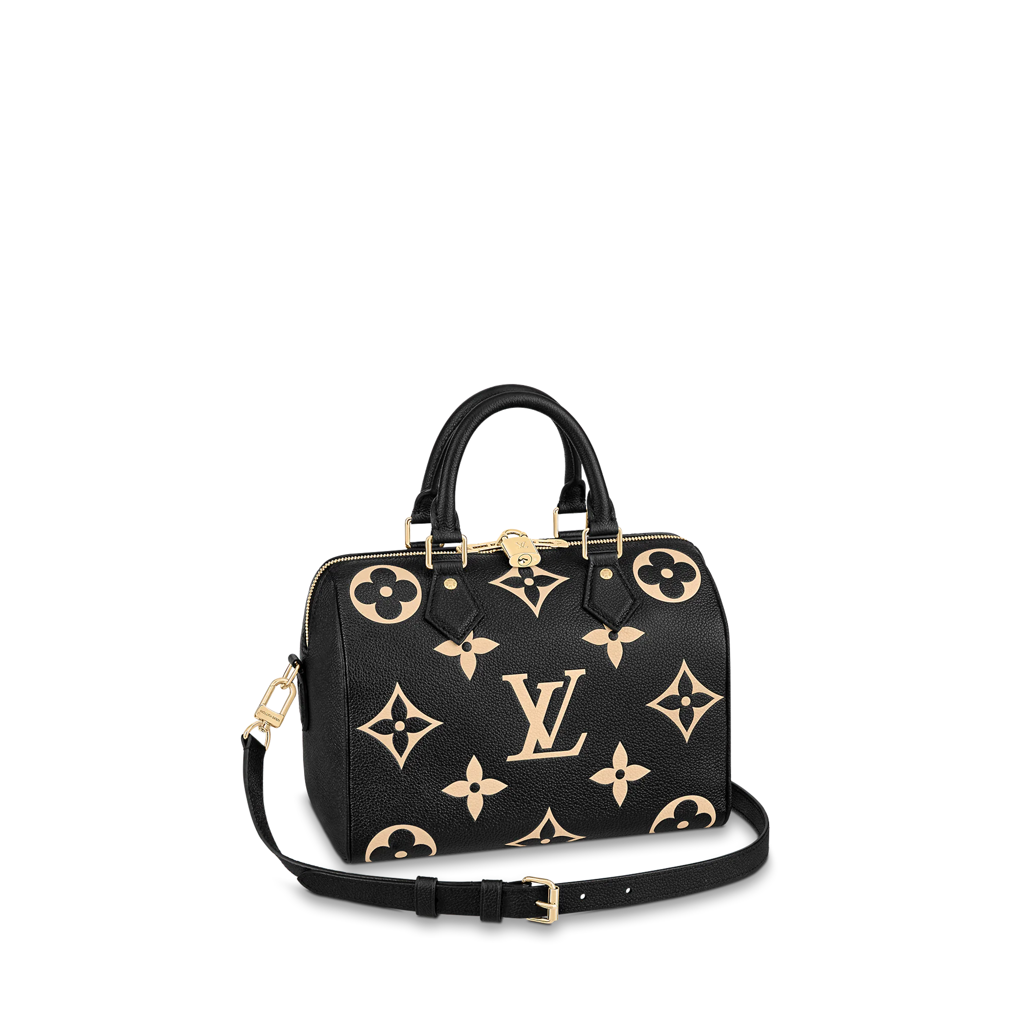 Buy it nowThe compact Speedy Bandoulière 25 handbag is made from black Monogram Empreinte leather with the embossed Oversized Monogram pattern in beige. This sophisticated handbag was inspired by the House’s “Express” bag from 1930. Finished with gold-color hardware, the interior is lined in red. A detachable and adjustable shoulder strap, in addition to the top handles, enables carry options.