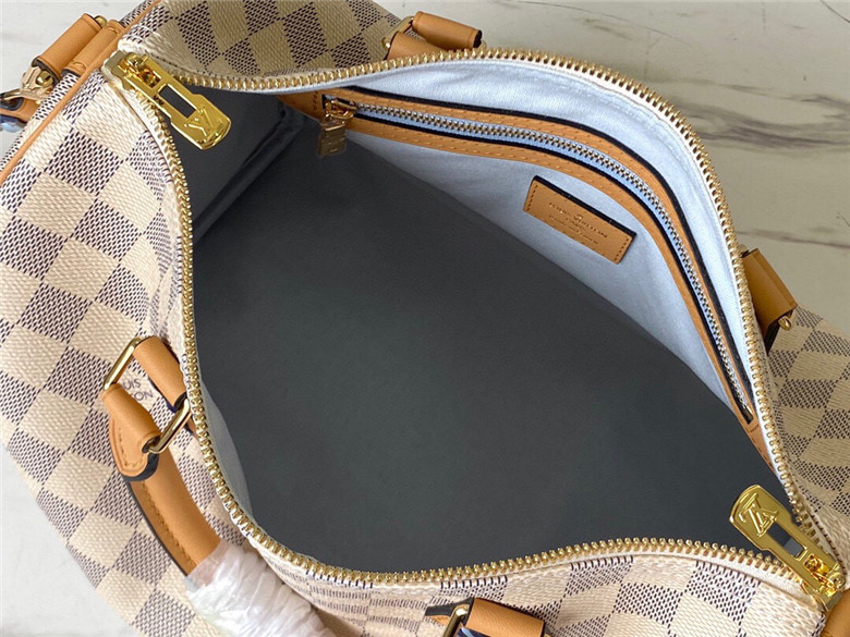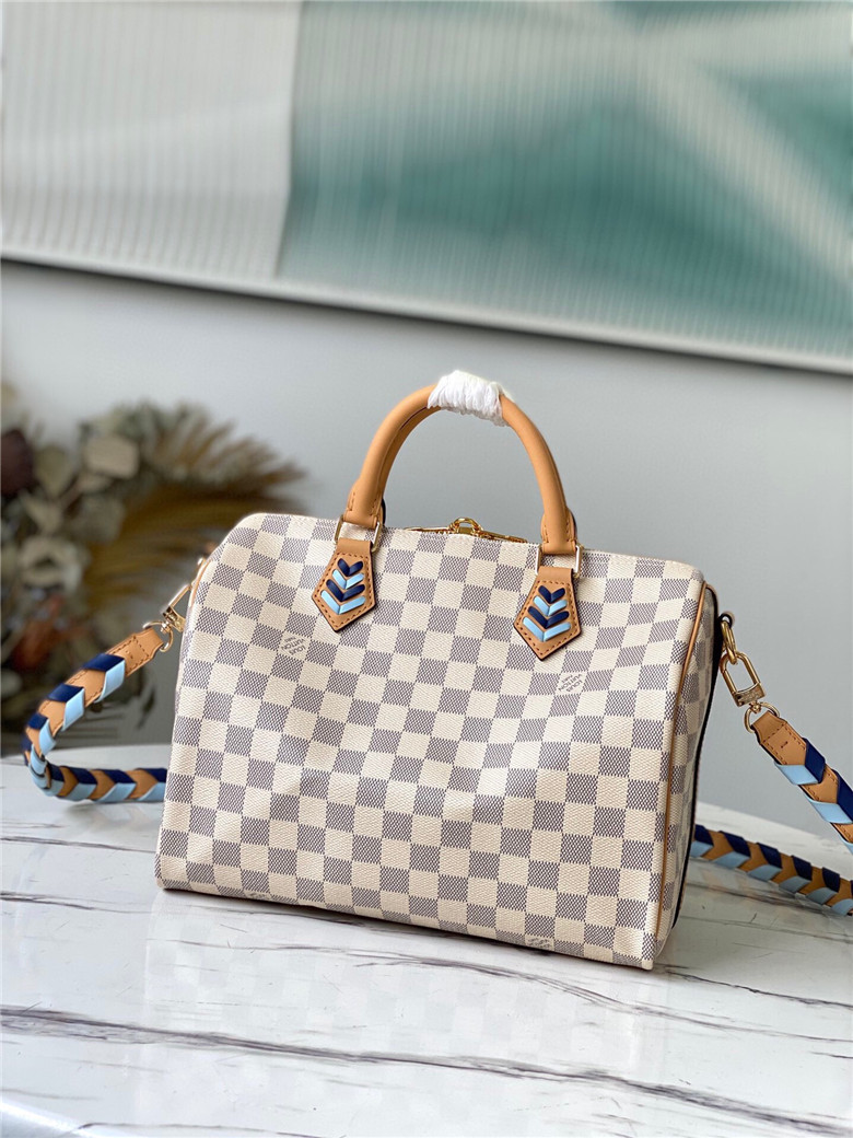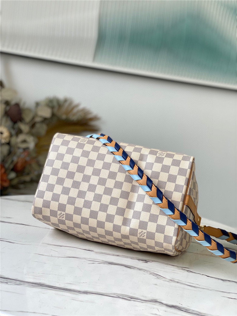 Fashioned from Damier Azur canvas with leather trim, the Speedy 30 Bandoulière features a detachable braided strap in leather. Every lash of leather is braided individually by handmade bringing a colorful and crafted detail. Lightweight and roomy, it’s the perfect everyday companion.