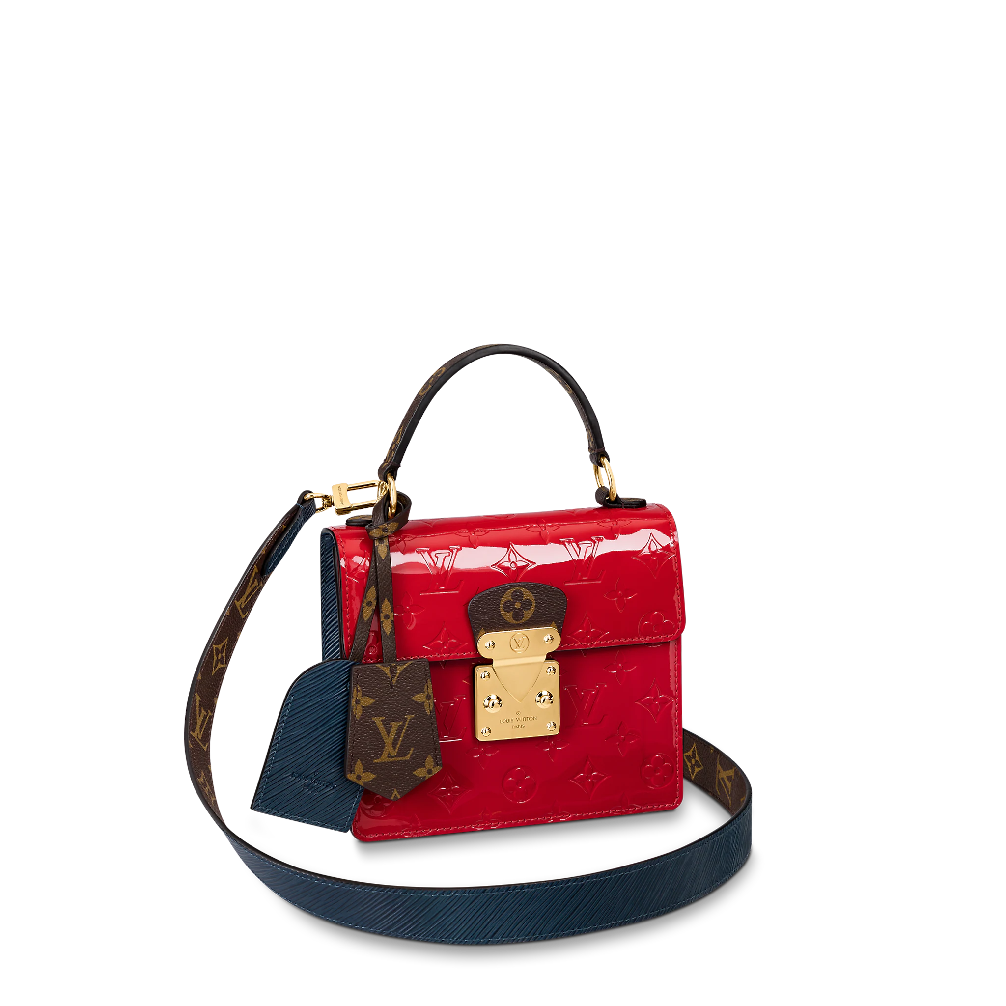 The Spring Street in Monogram Vernis patent leather is a versatile bijou of a handbag. Inspired by a model designed in 1999 by then-artistic director Marc Jacobs, it presents a mix of signature materials in contrasting colors, for a cool, edgy attitude. A top handle and removable strap multiply the carry options for this covetable bag.