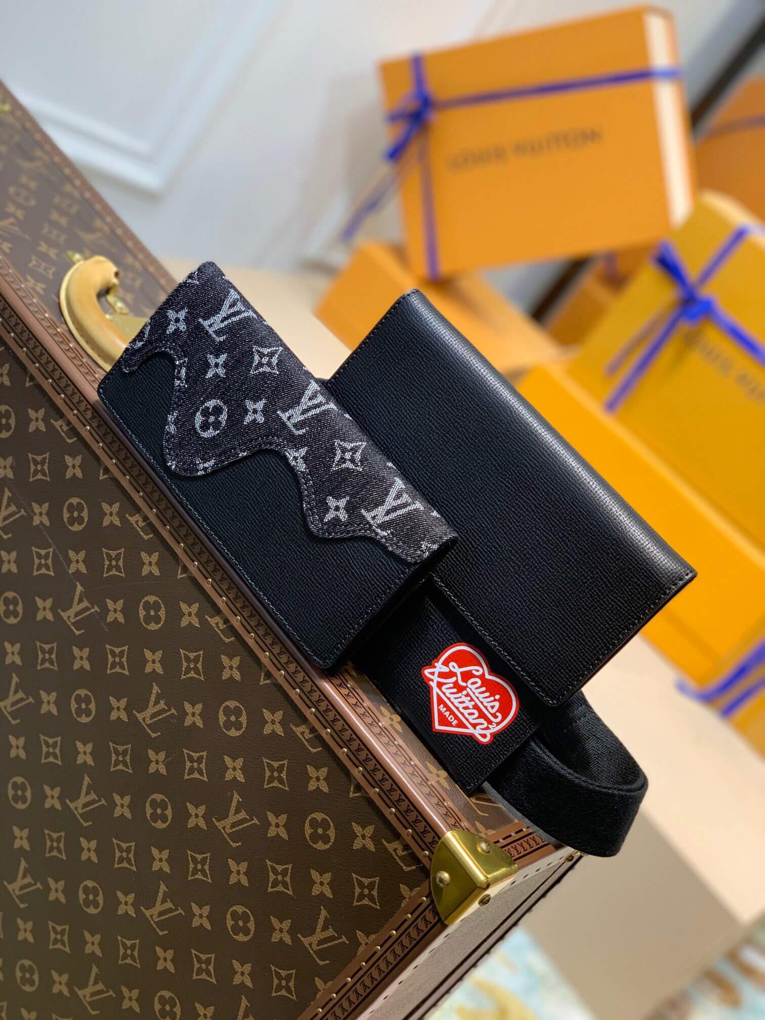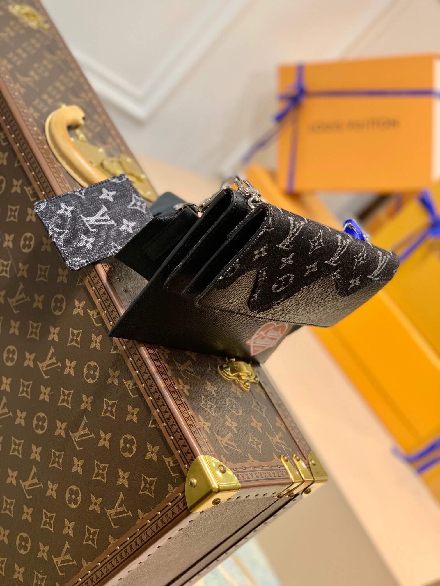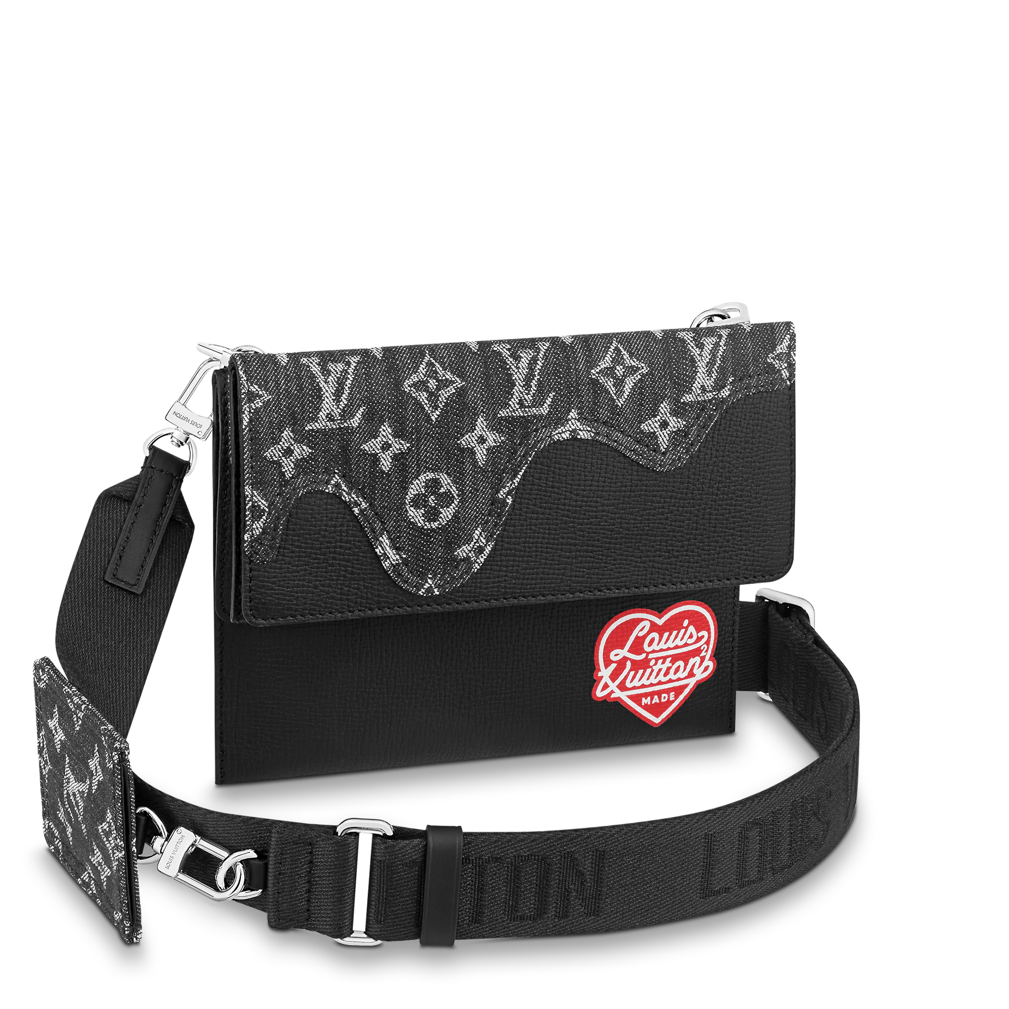 Inspired by the bestselling Trio Messenger, the cool, compact Trio Pouch was created by the Japanese designer Nigo for Pre-Spring 2022. His Monogram Drip look in denim and Taurillon leather is accented with scarlet hearts for a colorful signature. Three bags in one, it features two removable pouches plus a removable cardholder on the strap – perfect for contactless payment.