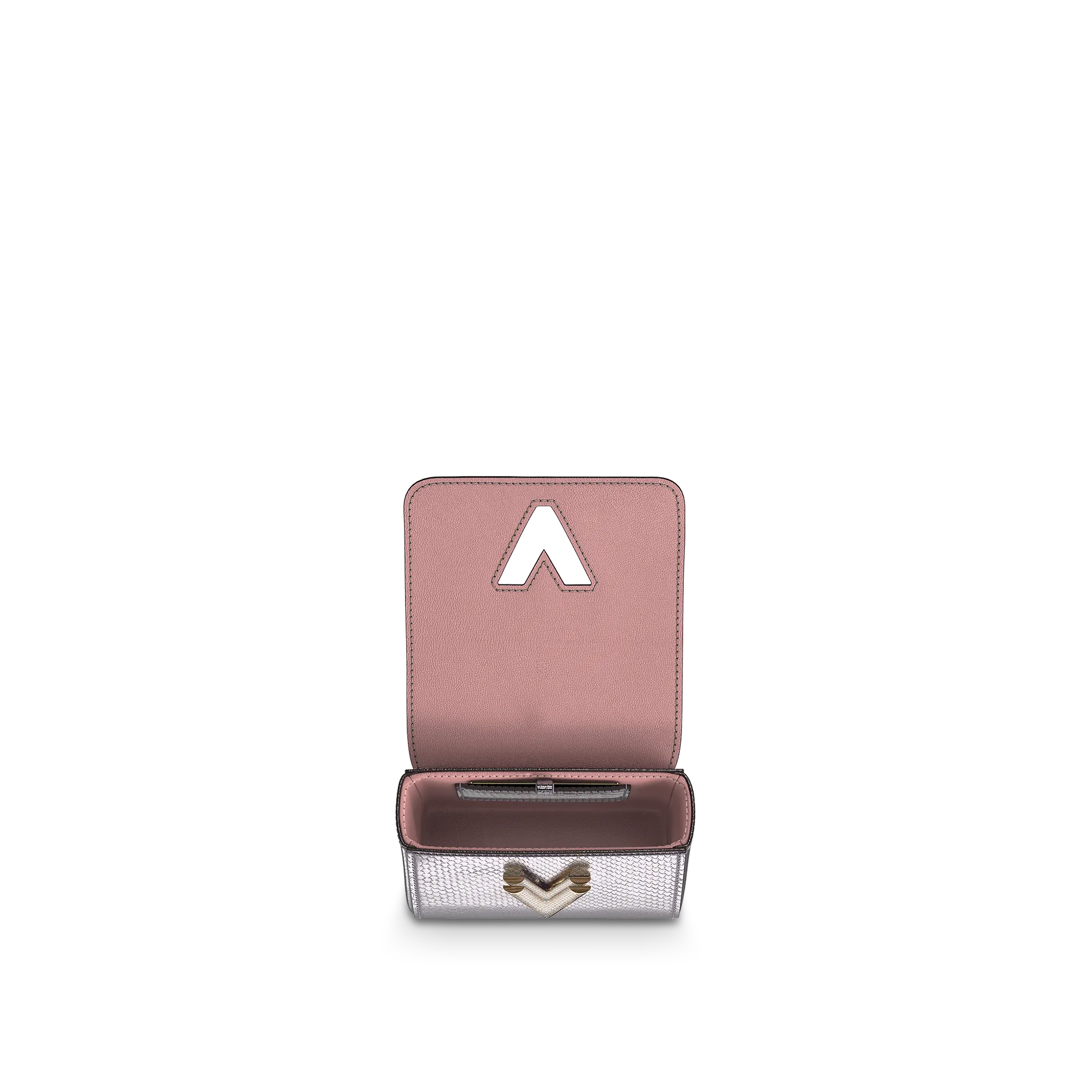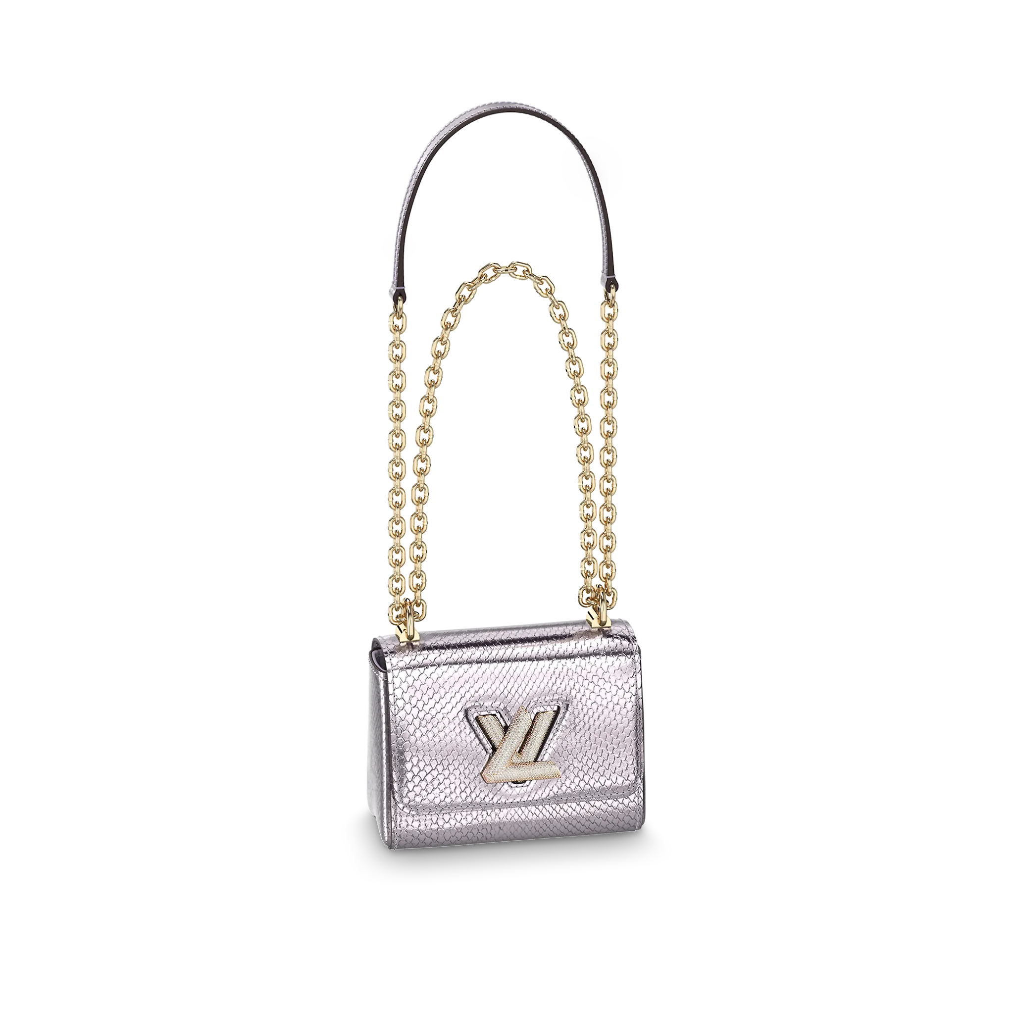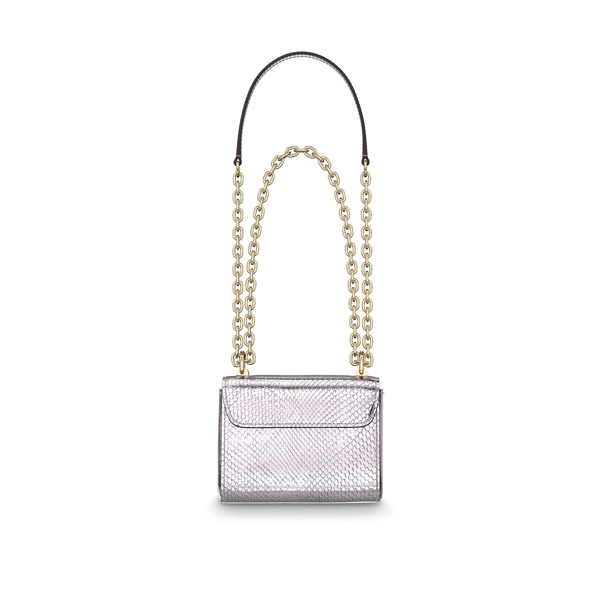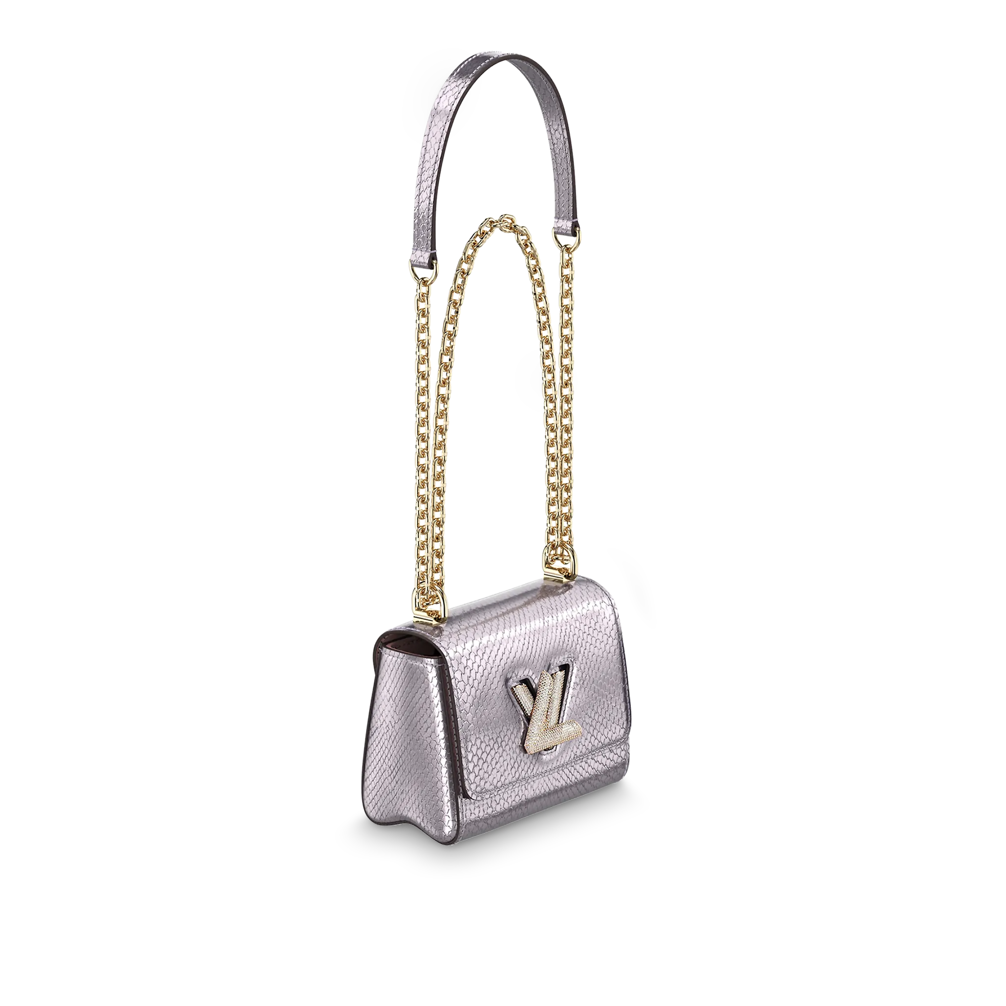 The Twist Mini handbag in precious python leather boasts all the instantly recognizable details of the classic Twist – such as the LV twist-lock and nautical chain – but in a smaller size perfect for evening use. This adorable little bag can be worn over the shoulder or cross-body thanks to its sliding chain.