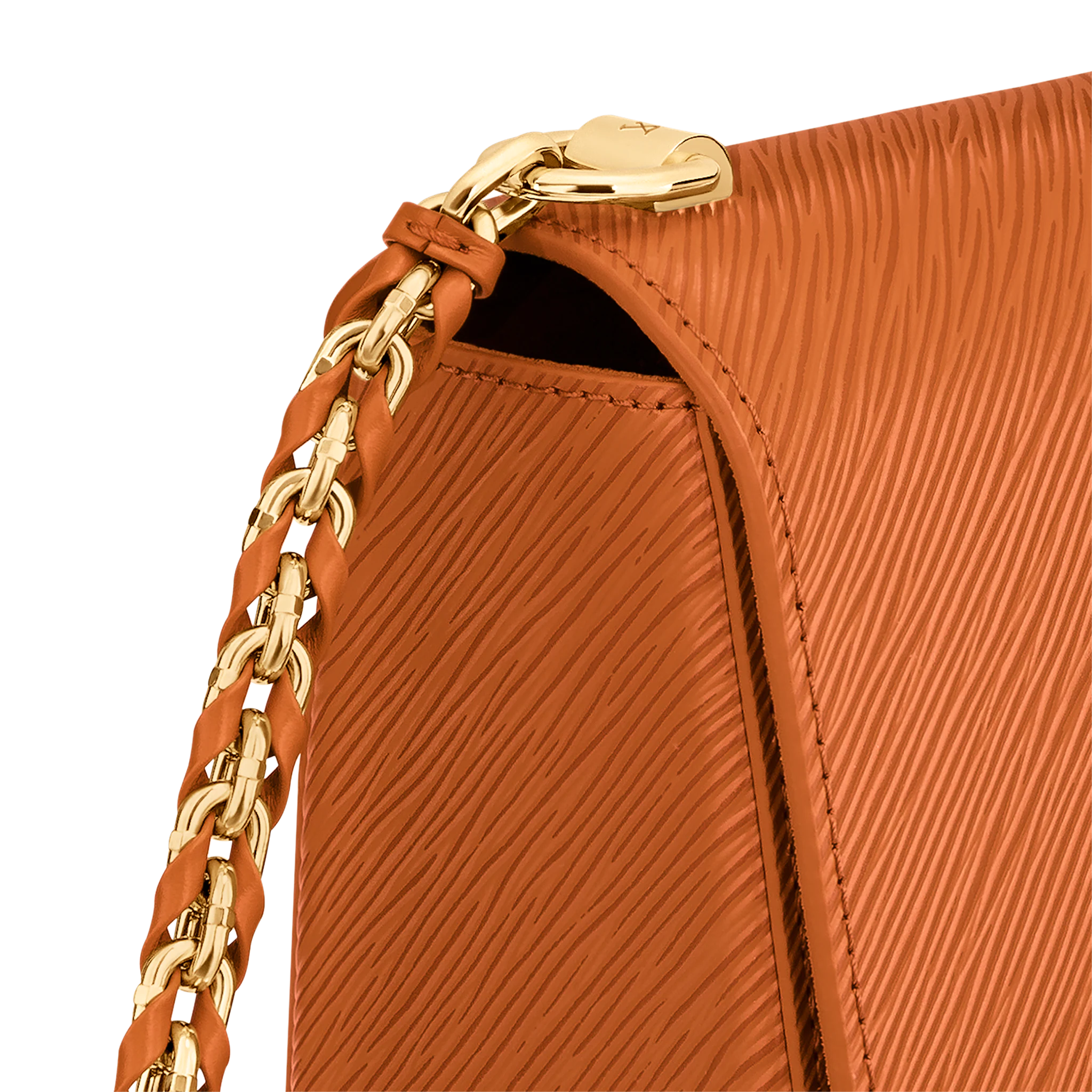 For Spring 2021, the Twist MM handbag is reinterpreted in a monochromatic colorway. Fashioned from Epi leather, the bag has a LV Twist lock with a matte tone-on-tone leather finish. Soft leather is braided into the metallic links of the chain strap for a sophisticated look. An adjustable shoulder pad in leather assures comfortable carry.