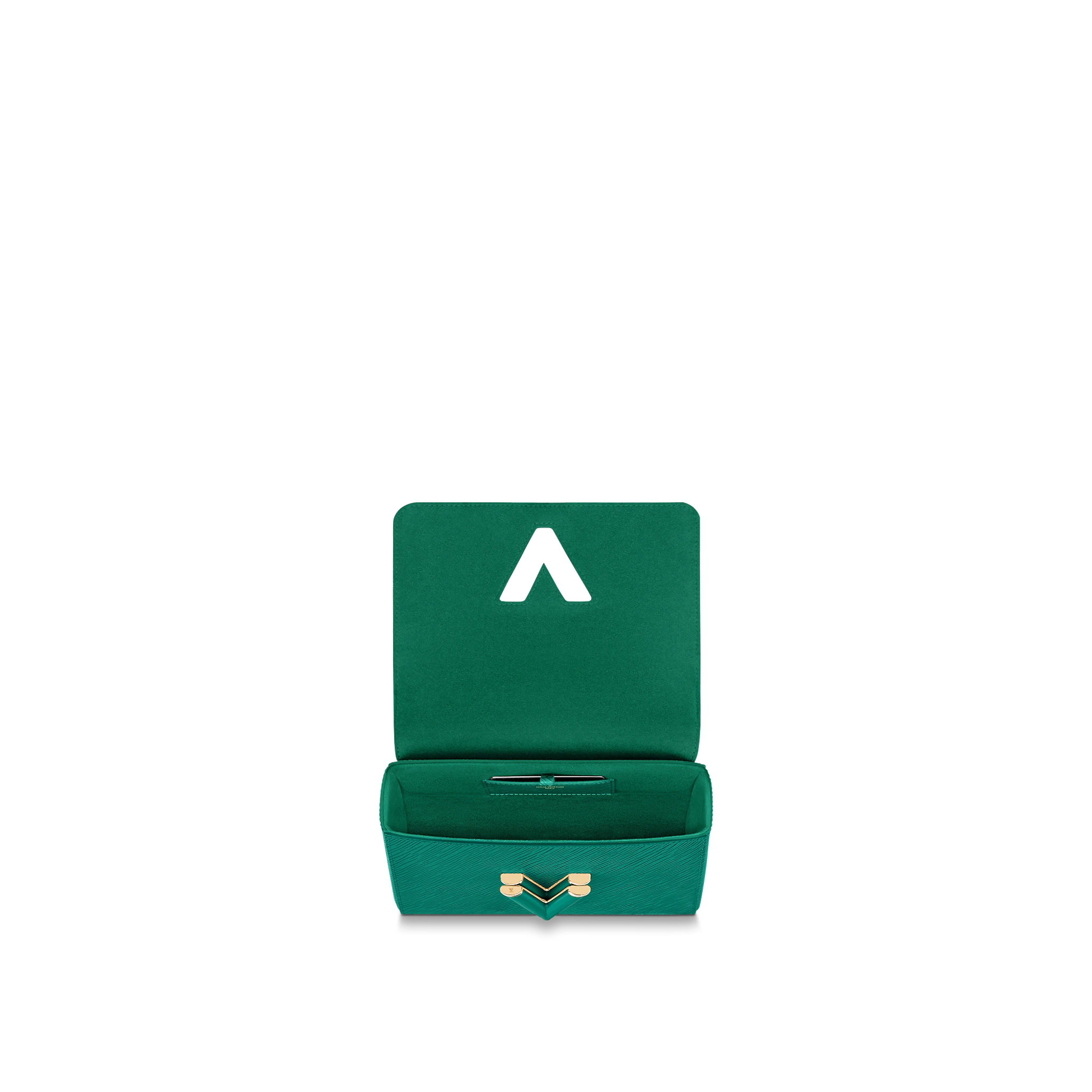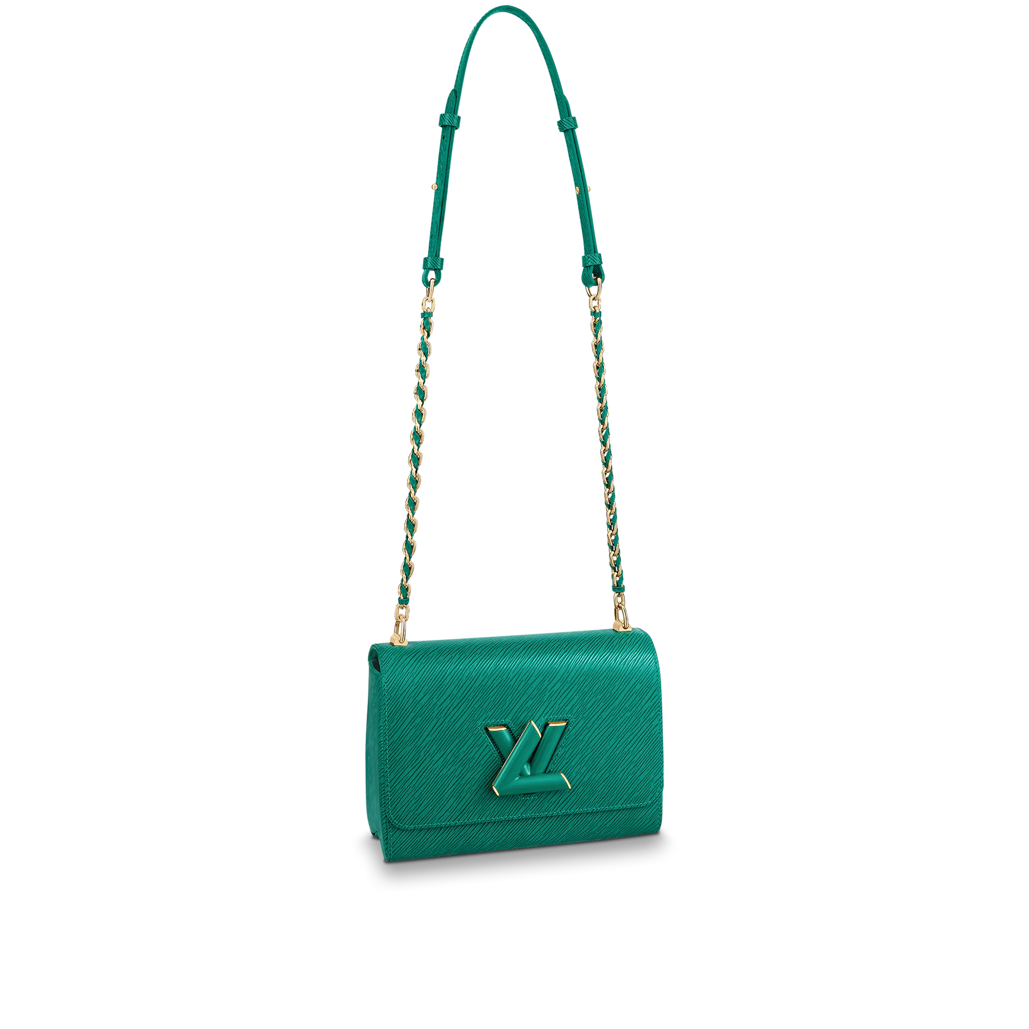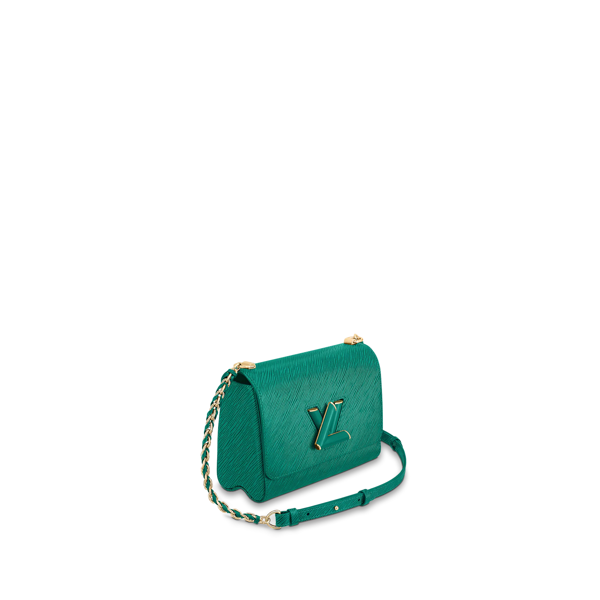 The Twist MM handbag is made from deep green Epi grained leather with the signature LV Twist lock in matching tone-on-tone lacquer. Leather braided into the shoulder chain brings a crafted feel. The adjustable shoulder pad in leather enables comfortable shoulder and cross-body carry. This Twist MM will complement any autumnal colorway.