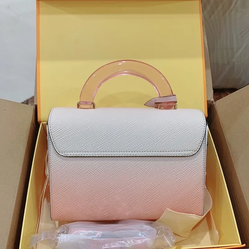 This Twist MM handbag takes on a summery feel in pastel-colored Epi leather with a translucent Plexiglass top handle. From a full tone at the bottom of the bag, the color fades into a nearly neutral shade. A removable flower charm brings an additional touch of whimsy.