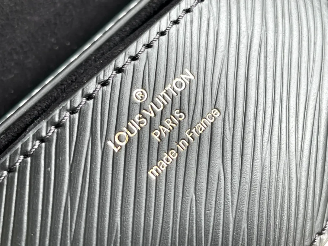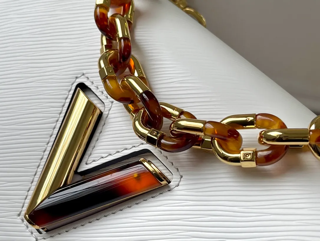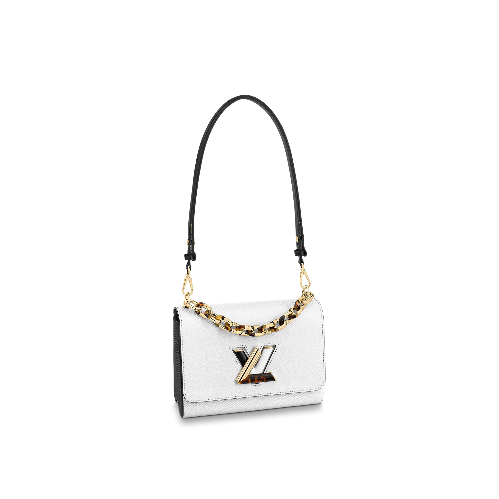 This Twist MM handbag in Epi grained leather features a LV twist-lock decorated with tortoise shell and black and white stones, a crafted detail repeated on the gold-color links of the chain. In addition to the chain, there’s a removable and adjustable strap for a more carrying options.