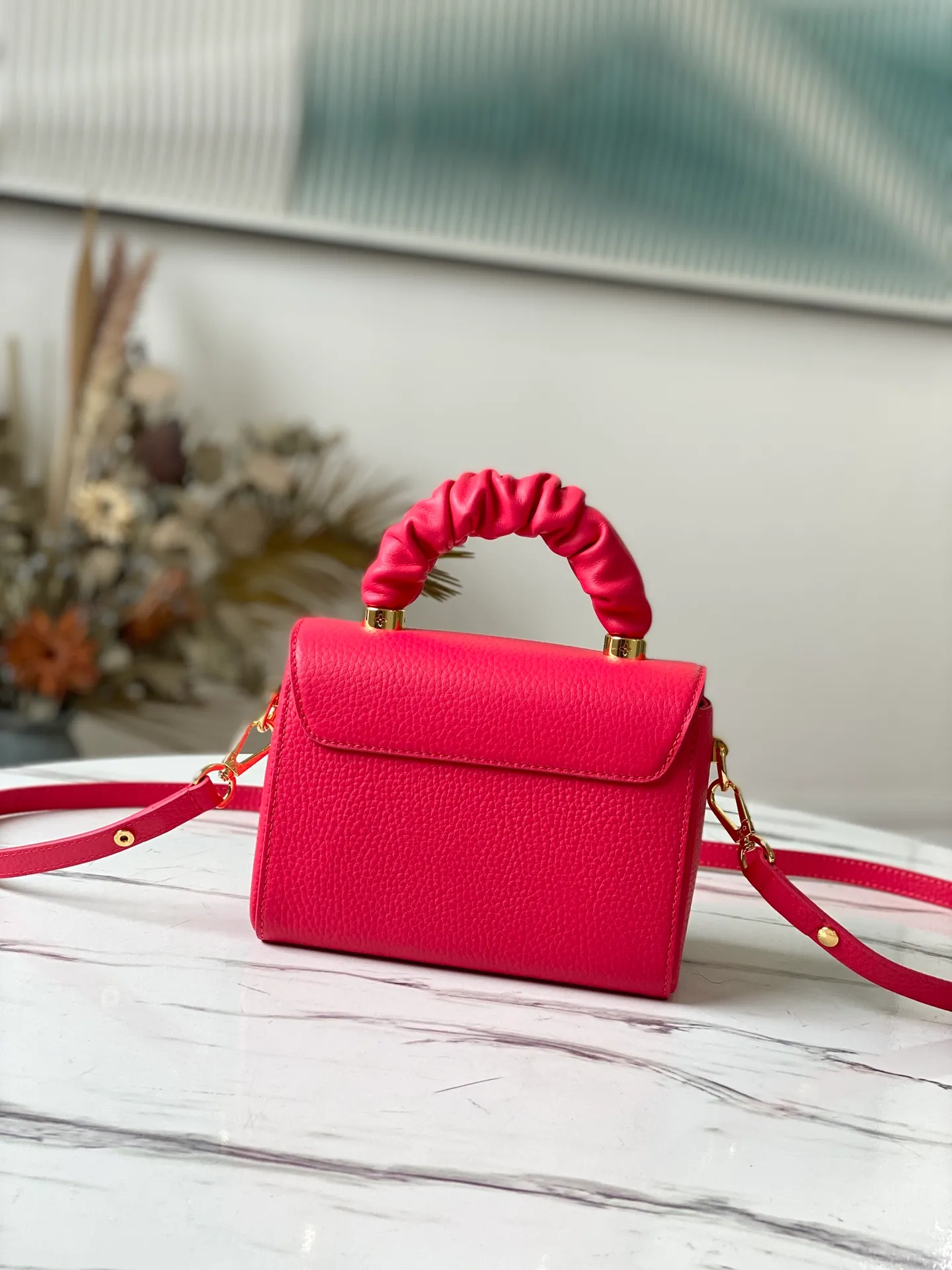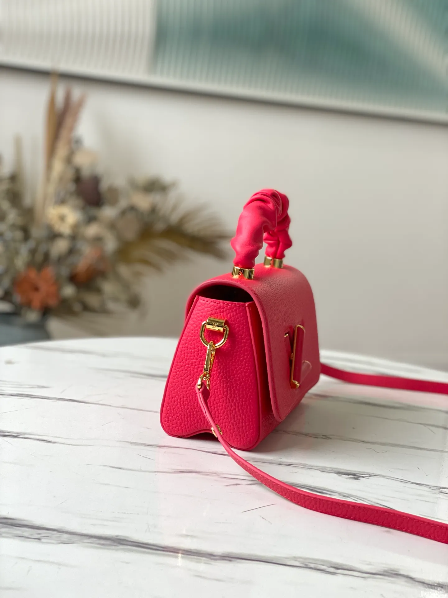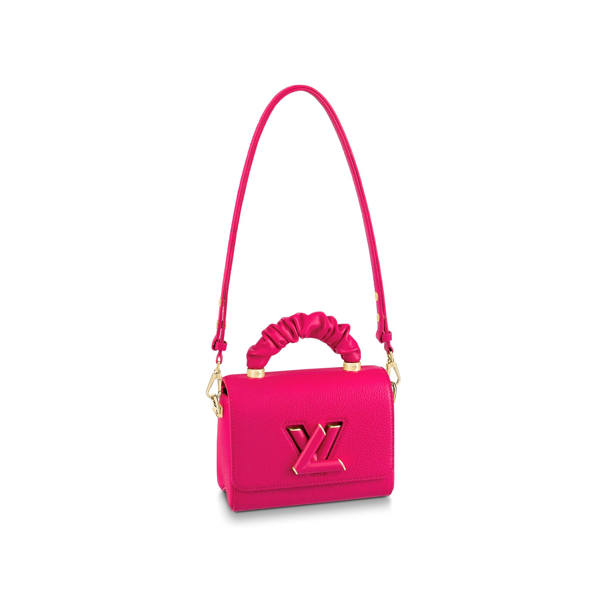 The Twist PM handbag looks adorable with a playful leather scrunchie around its top handle. The bag made from colored Taurillon leather with the scrunchie in matching smooth calfskin. The signature LV Twist lock is in the same color as the rest of the bag. A detachable strap allows shoulder and cross-body carry.