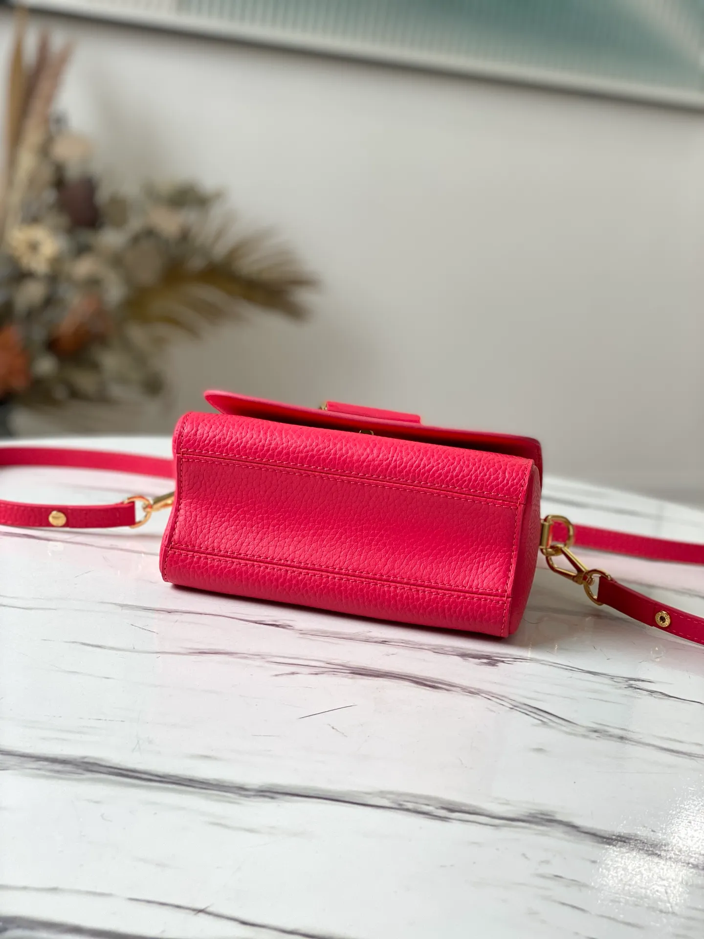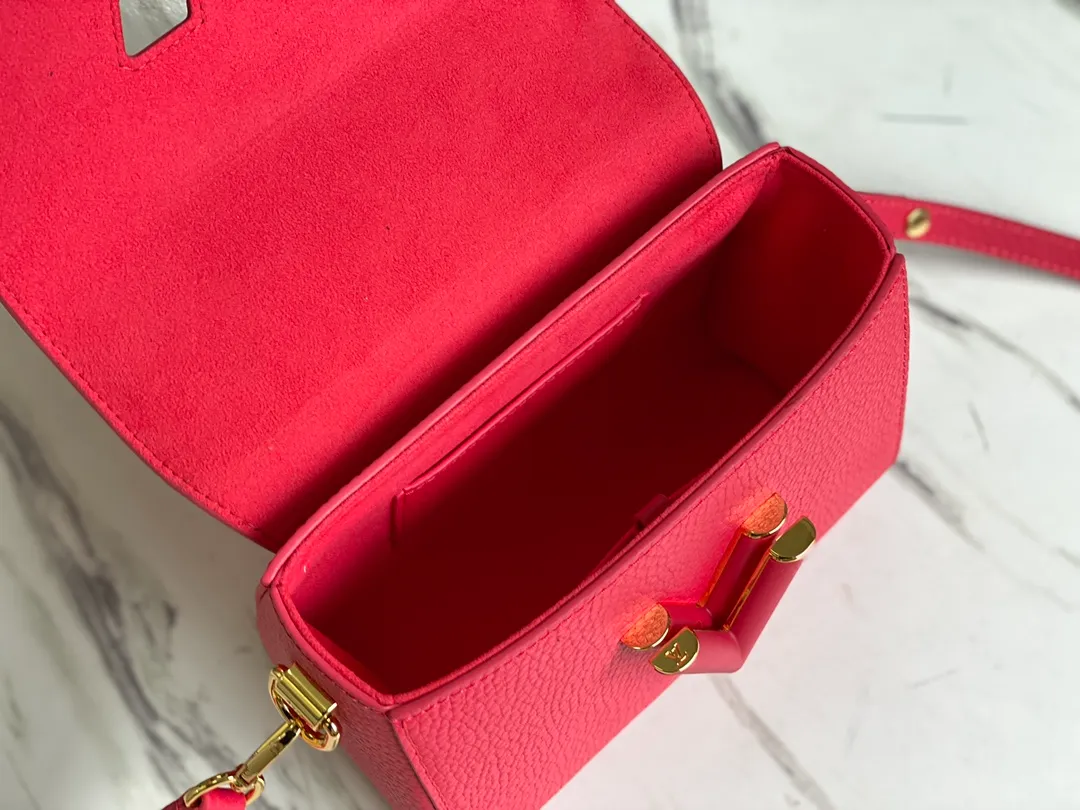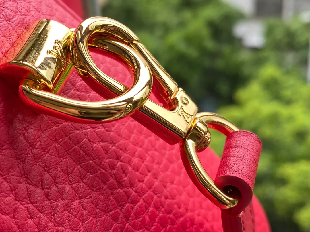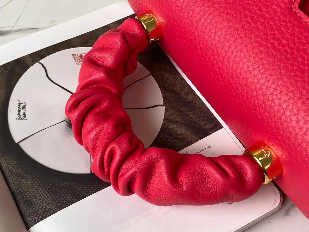 The Twist PM handbag looks adorable with a playful leather scrunchie around its top handle. The bag made from colored Taurillon leather with the scrunchie in matching smooth calfskin. The signature LV Twist lock is in the same color as the rest of the bag. A detachable strap allows shoulder and cross-body carry.
