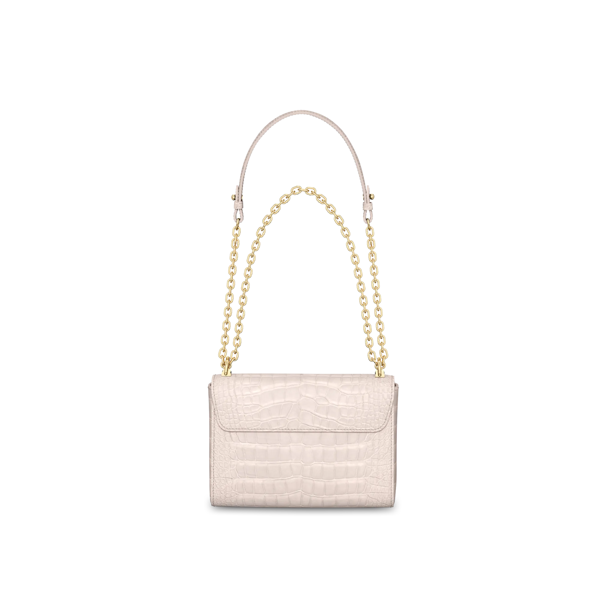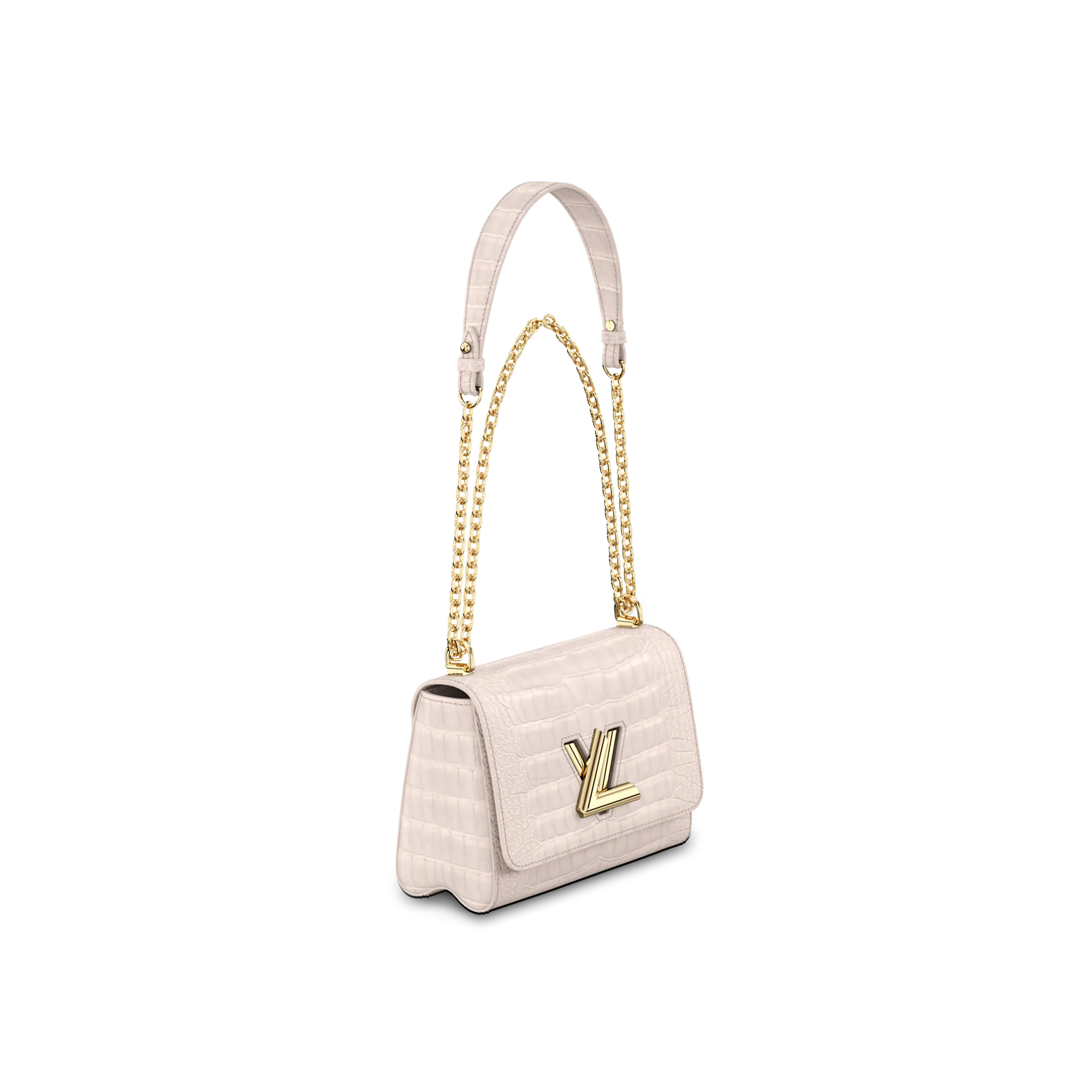The Twist MM in precious matte crocodilian leather exhibits exquisite craftsmanship. Lined with goatskin and accented by an LV Twist lock in polished metal, the bag is roomier than it looks, thanks to a cleverly designed “wave” base. The sliding chain handle features a croco-leather pad, and can be worn on the shoulder or cross-body. A perfectly luxurious day-to-evening companion.