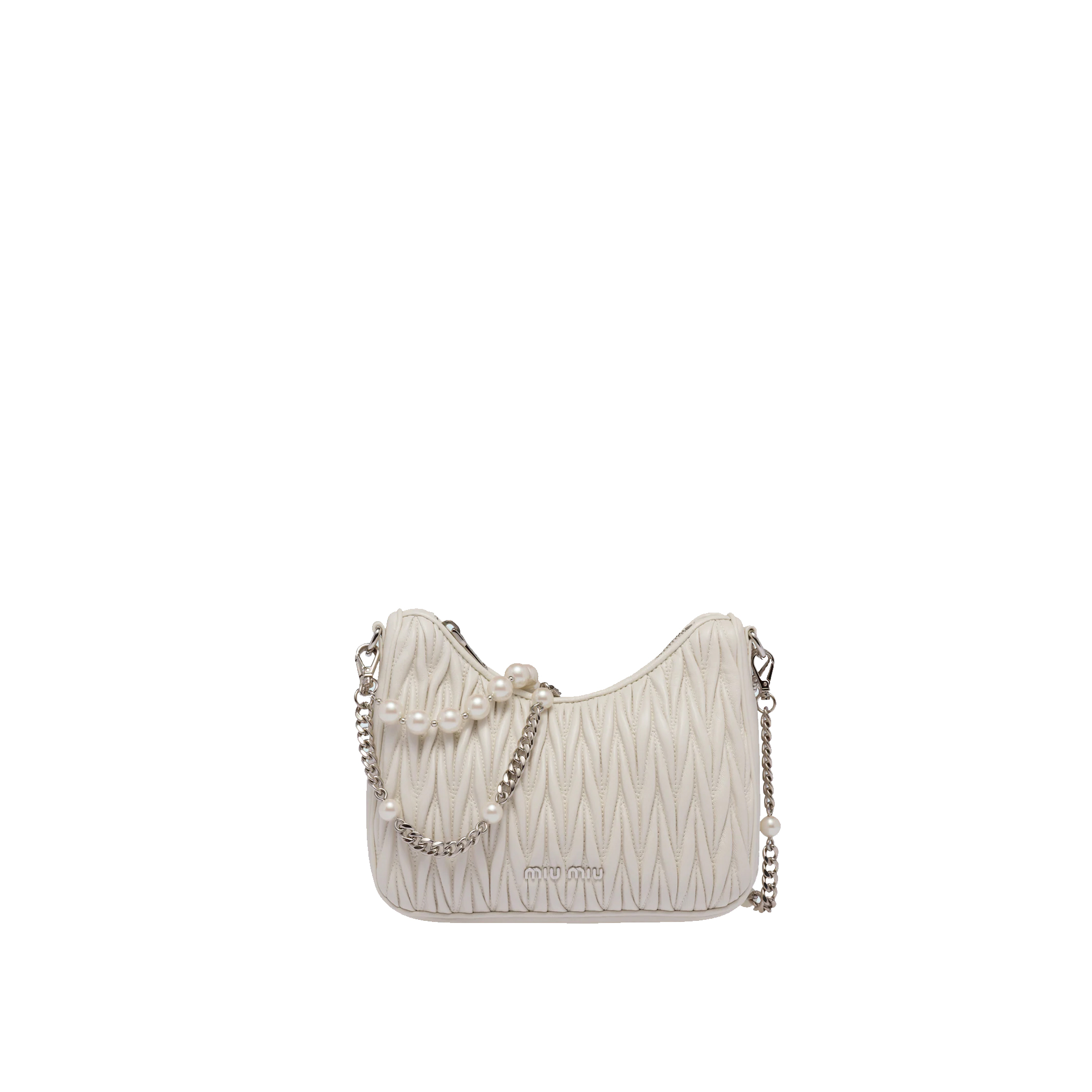 Iconic matelassé workmanship dominates the collection of Miu Miu accessories for the new season. This fabric shoulder bag with sinuous volumes is characterized by a precious pearl-embellished shoulder strap. The design is sophisticated and refined.