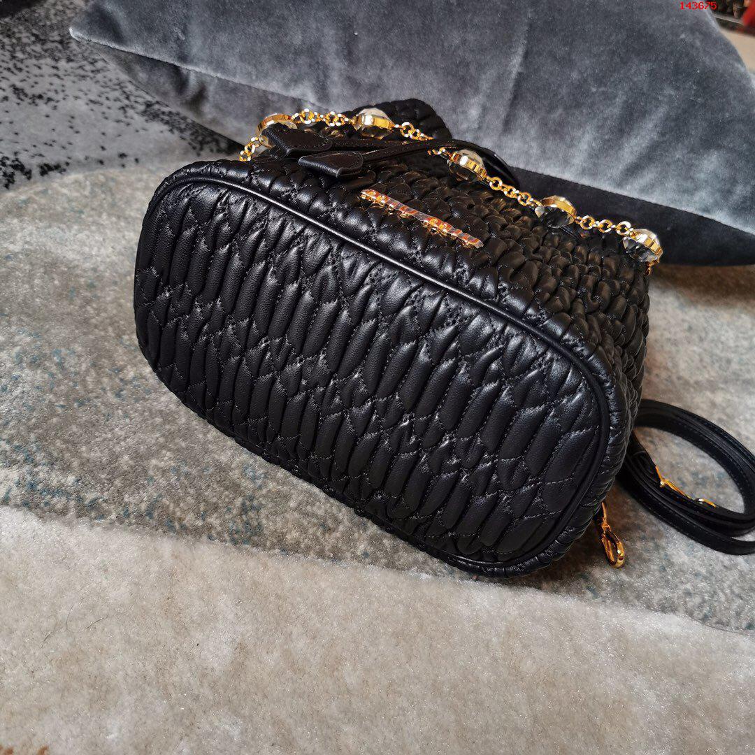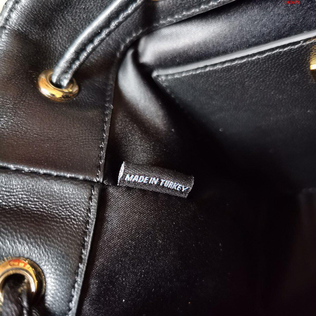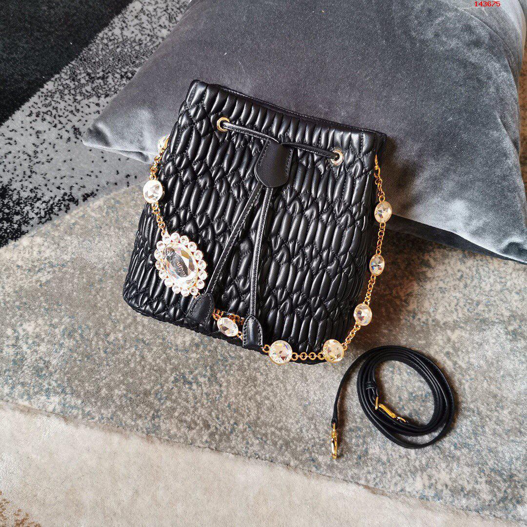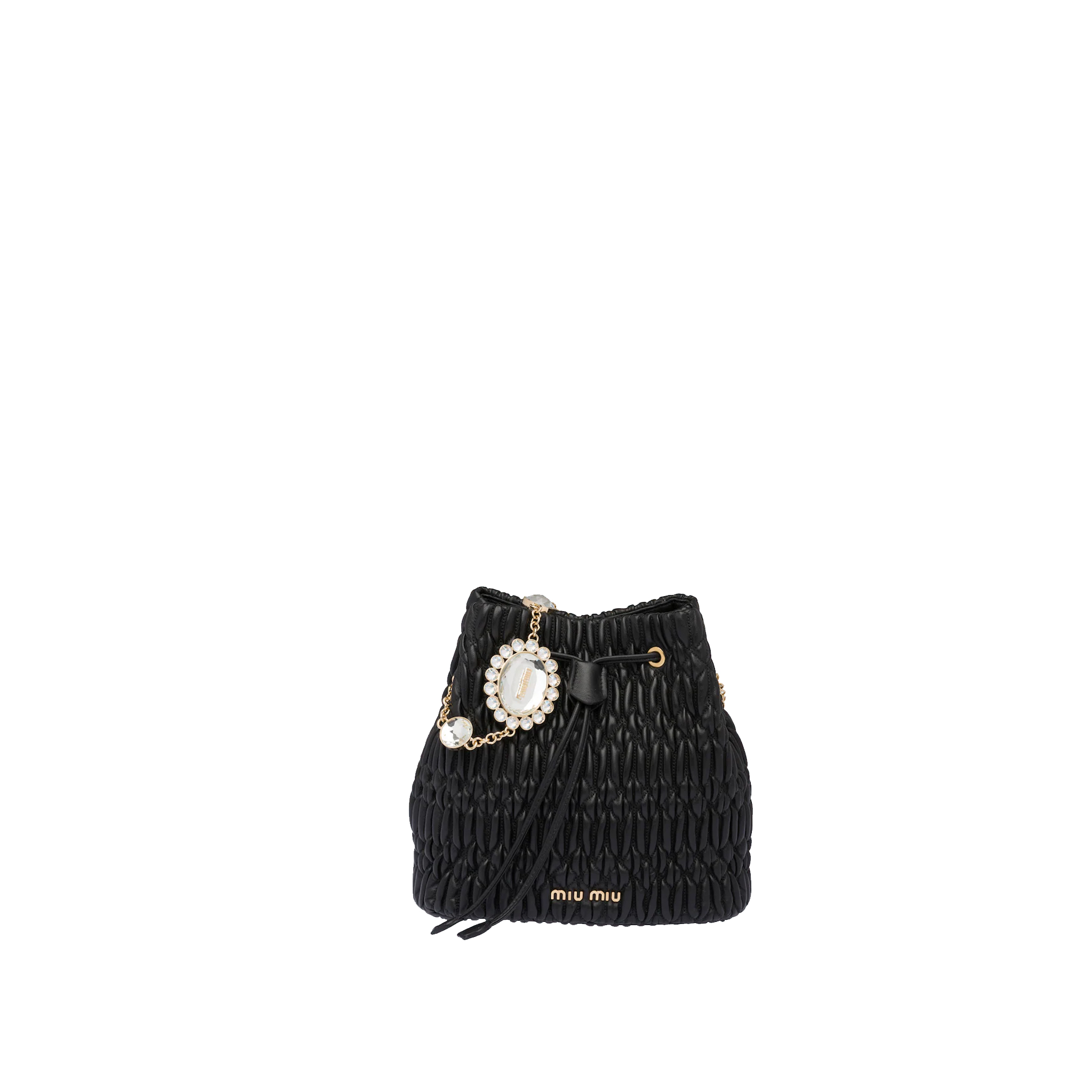 The double shoulder strap in leather and in metal with crystals adorns this soft nappa leather bucket bag with drawstring. It has an inside pocket and is decorated with the metal lettering logo on the front.