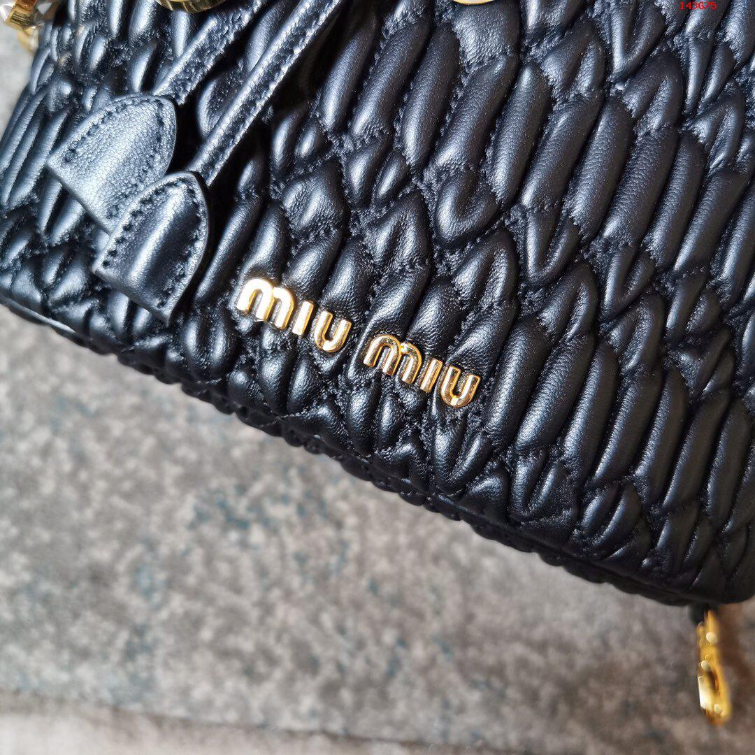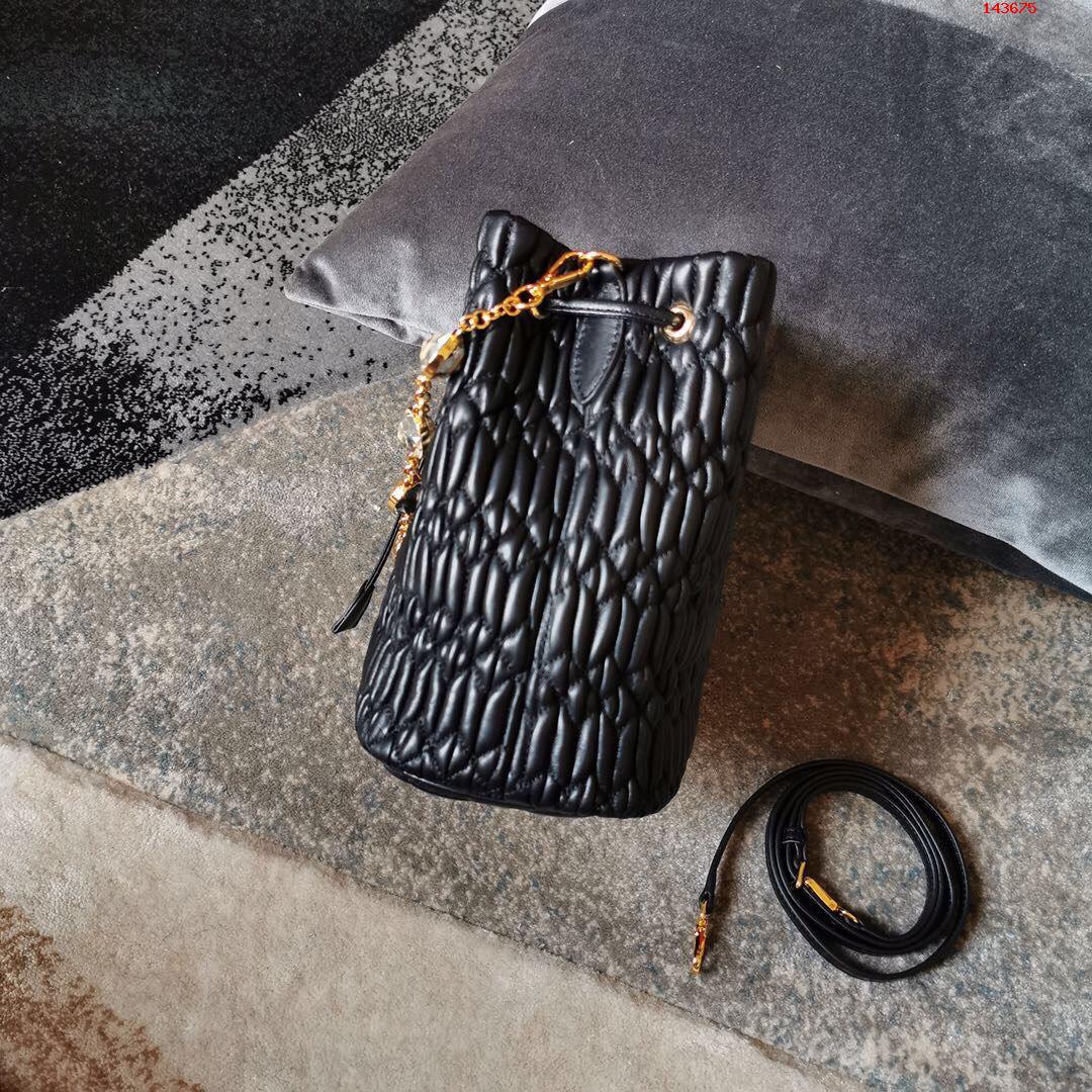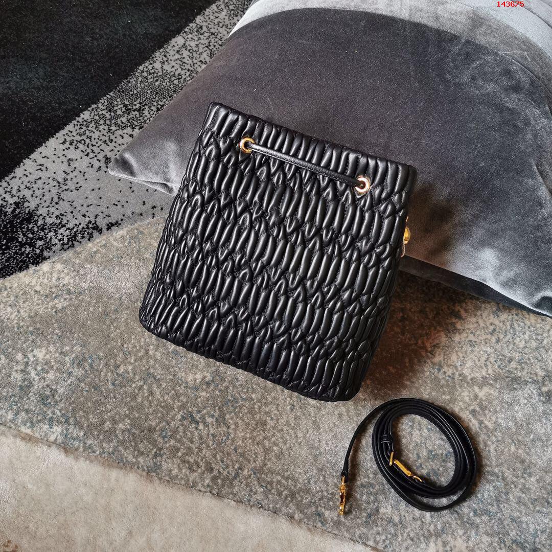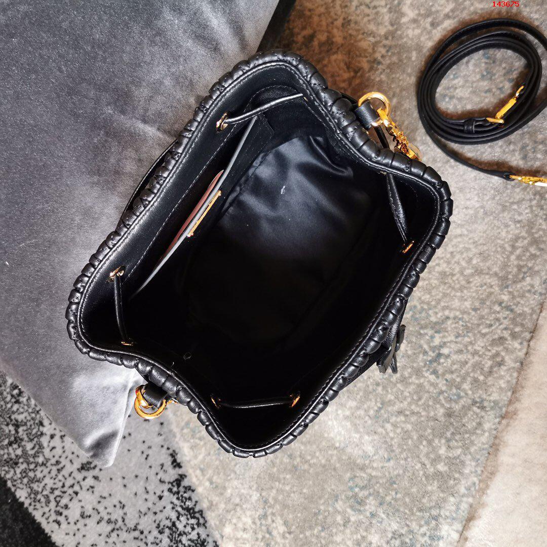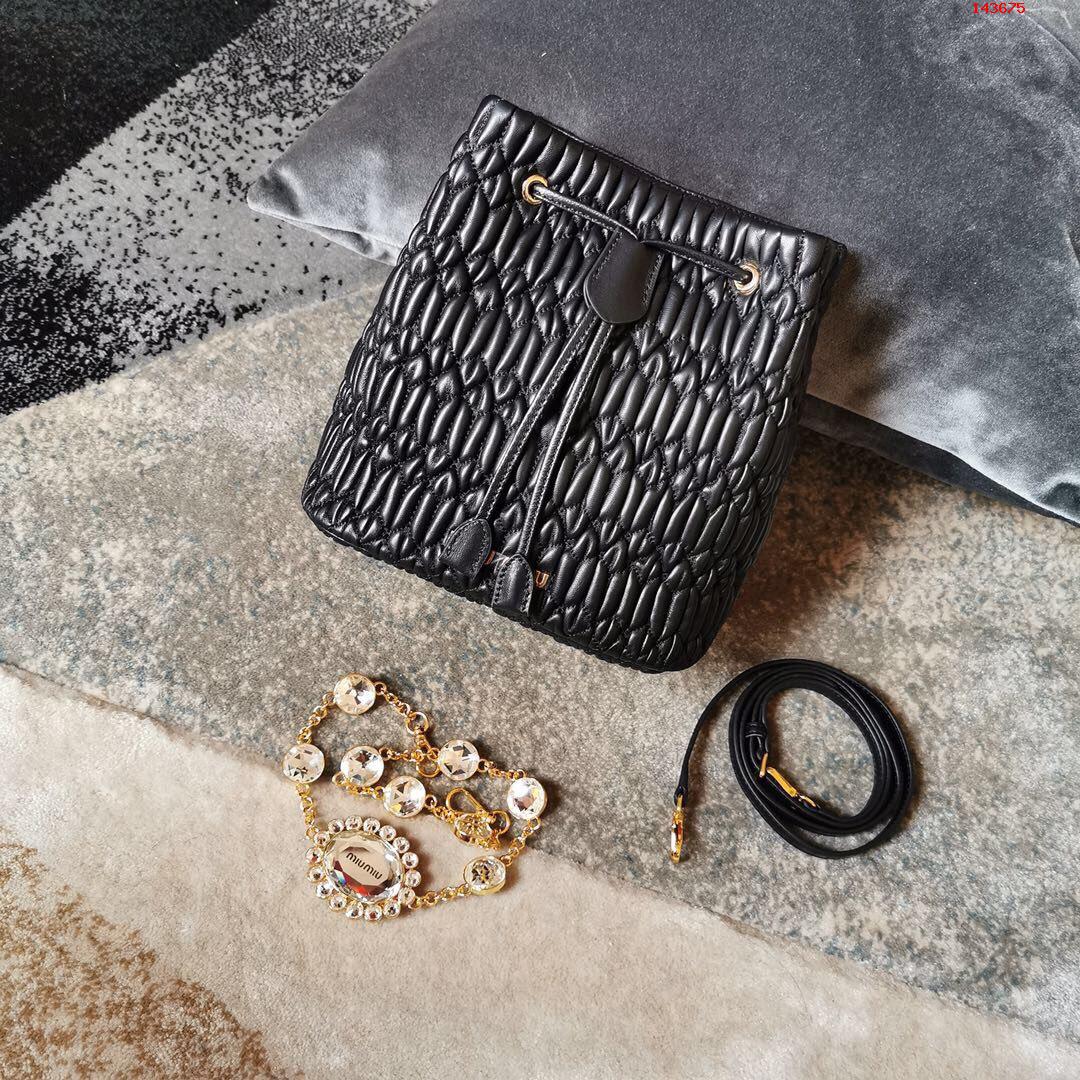 The double shoulder strap in leather and in metal with crystals adorns this soft nappa leather bucket bag with drawstring. It has an inside pocket and is decorated with the metal lettering logo on the front.