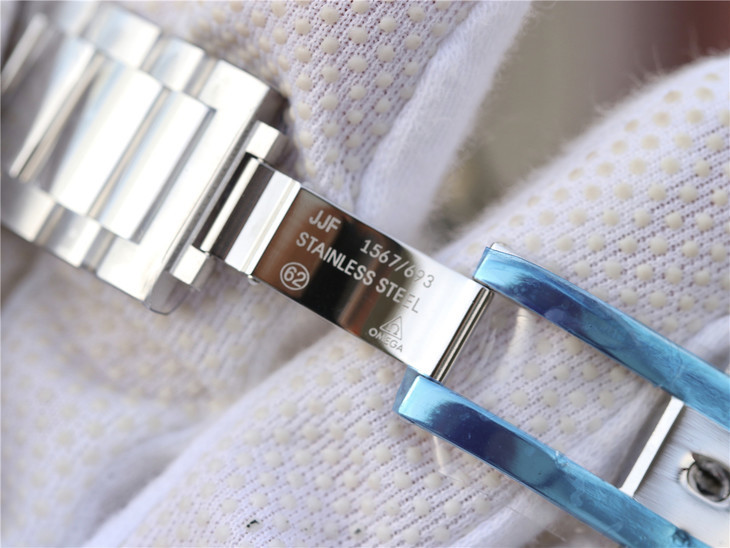 Reference 231.10.42.21.02.002 has a stainless steel case and matching bracelet. The silver dial features bright blue accents matching the hands.