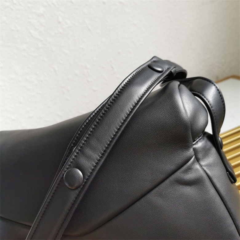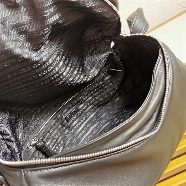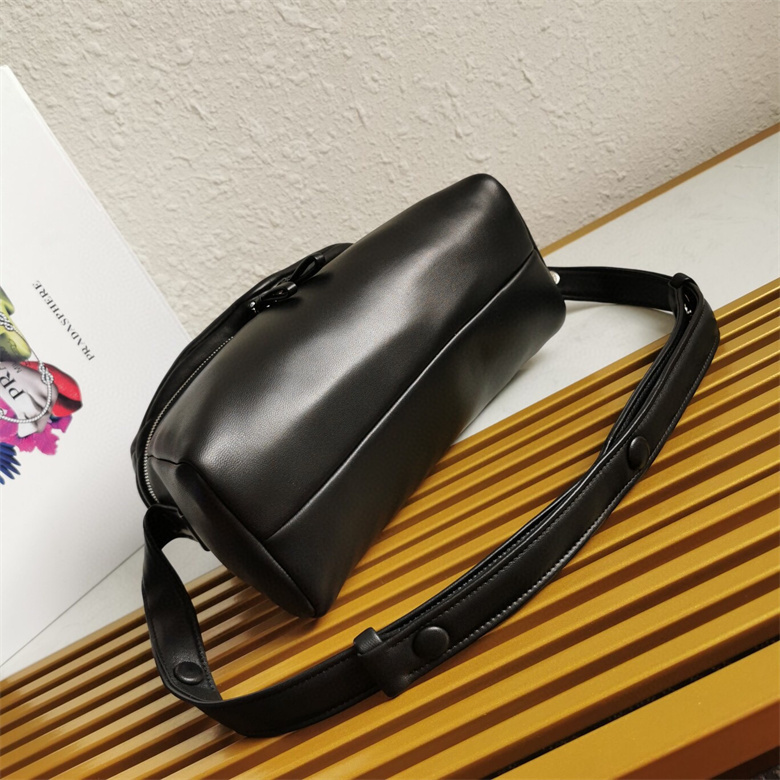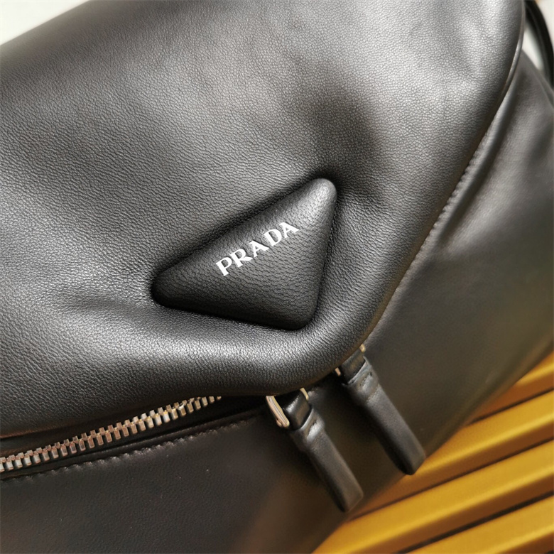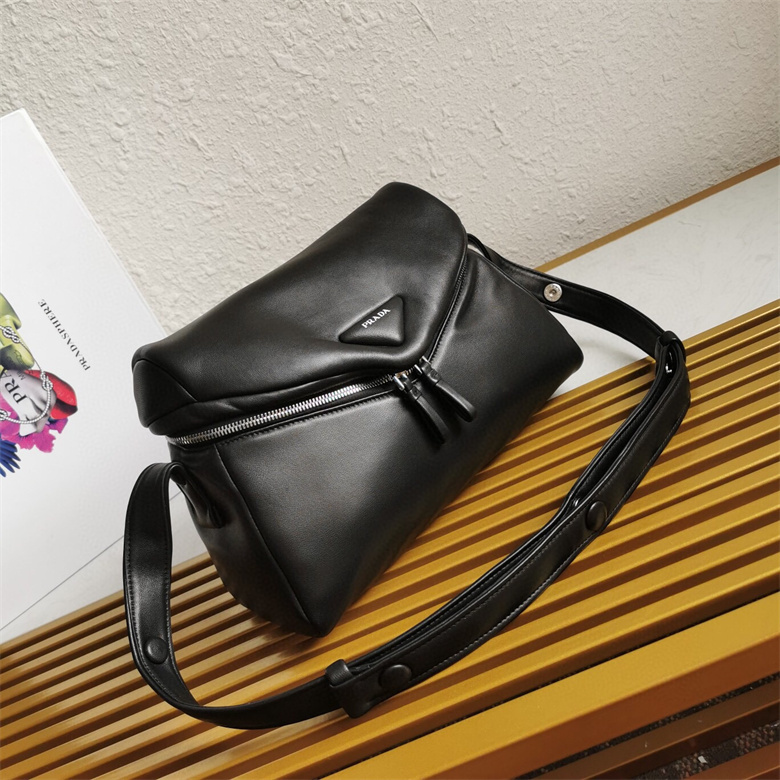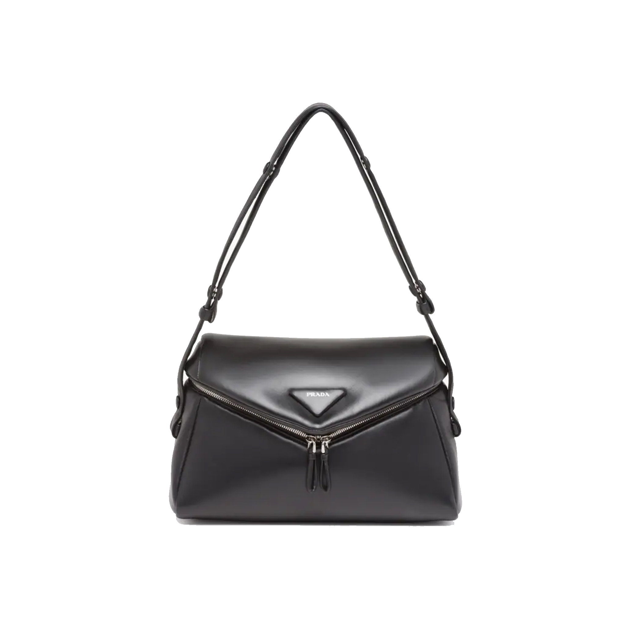 This soft nappa leather shoulder bag with sleek, minimalist lines has a contemporary attitude and a special reverse stitch construction. A study of the triangle inspires new geometric details and unique interpretations of the historic Prada logo. The iconic shape is reworked in the wide flap of this slightly padded accessory, completed by an adjustable leather handle that lets it be worn in different ways.