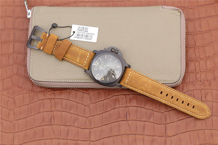 The Panerai PAM 386 is a short-lived version of the Luminor 1950 range with a anodized aluminum case and a 3-day automatic movement (caliber P.9000).