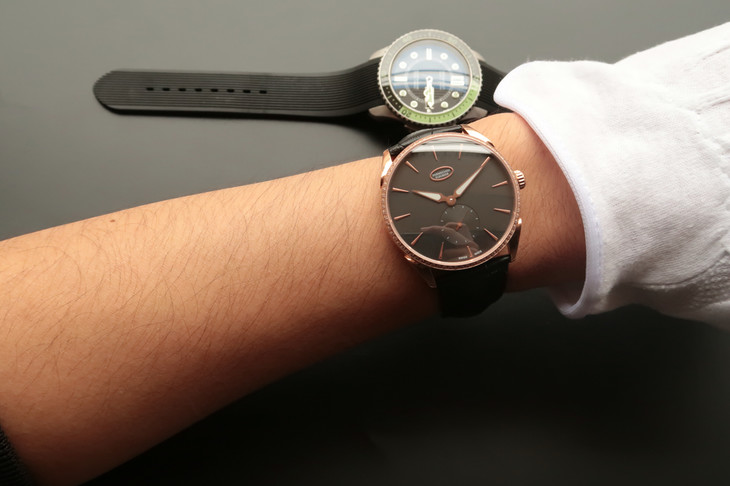 The Tonda 1950 Sertie displays the hours and minutes from the centre of the dial, while the seconds are placed at 6 o’clock.