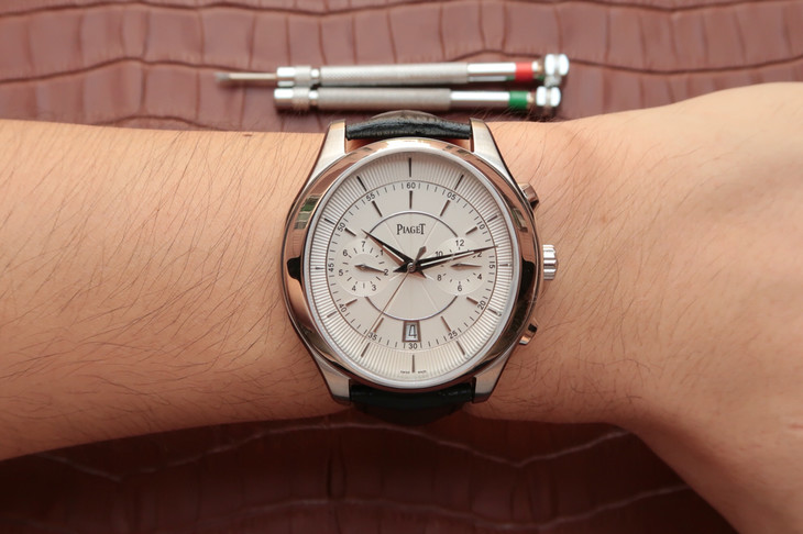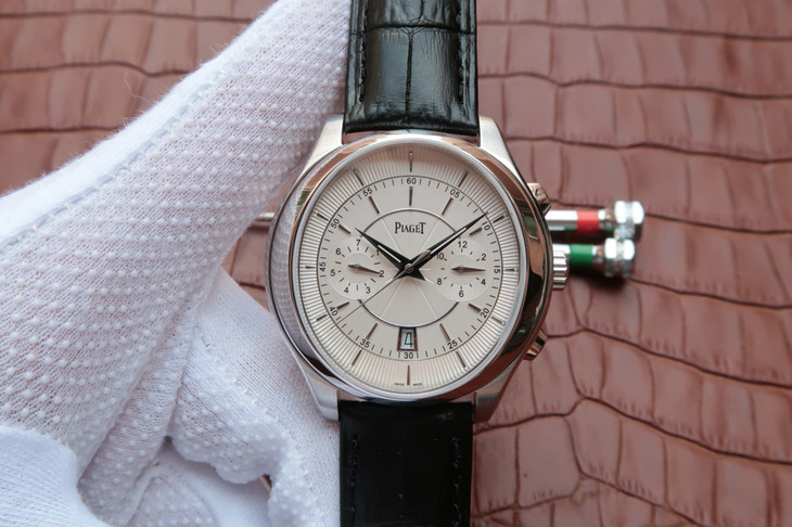 The Piaget Gouverneur Chronograph White Gold reference G0A38112 has a White Gold case with a diameter of 43.00mm. Inside ticks the caliber 882P PVD. The dial is Silver.