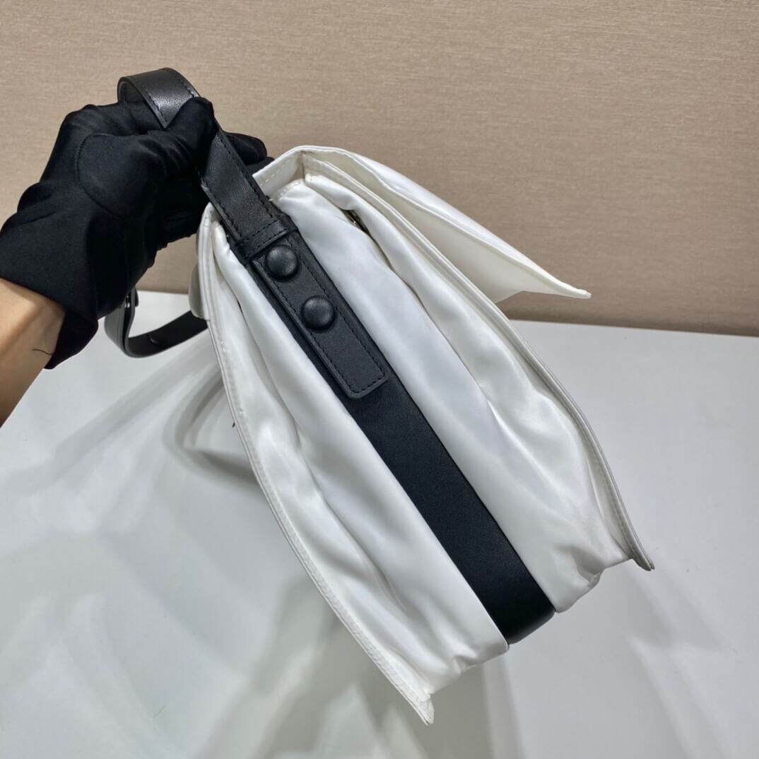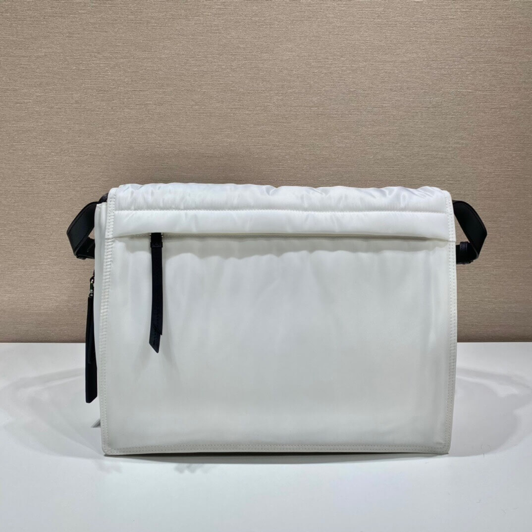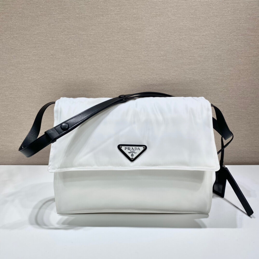 Made of Re-Nylon, Prada’s iconic fabric produced from recycled plastic collected in the ocean, this shoulder bag is characterized by its soft, padded design and accented with a leather shoulder strap. The accessory with back pocket is illuminated by metal hardware and decorated with the enameled metal triangle logo on the flap. Pockets inside.