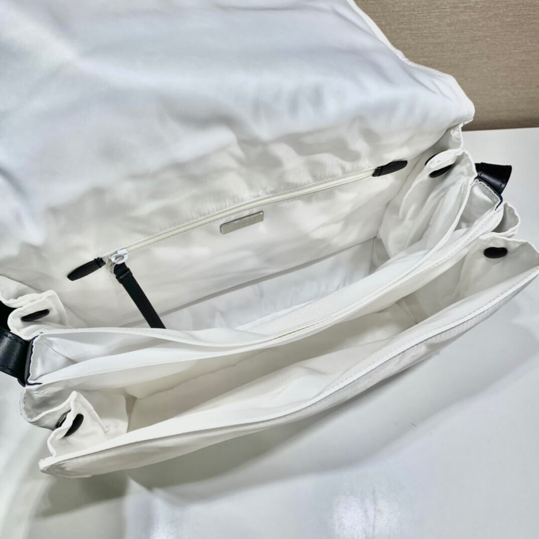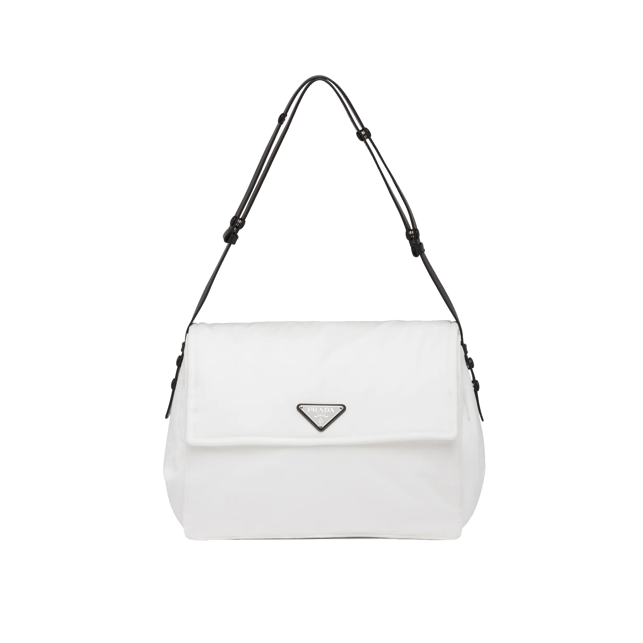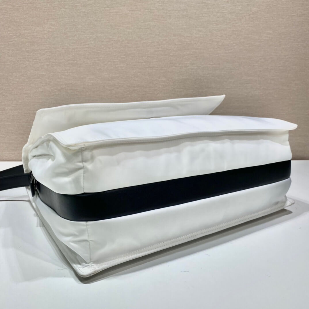 Made of Re-Nylon, Prada’s iconic fabric produced from recycled plastic collected in the ocean, this shoulder bag is characterized by its soft, padded design and accented with a leather shoulder strap. The accessory with back pocket is illuminated by metal hardware and decorated with the enameled metal triangle logo on the flap. Pockets inside.